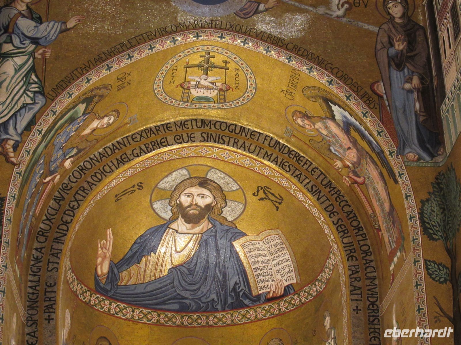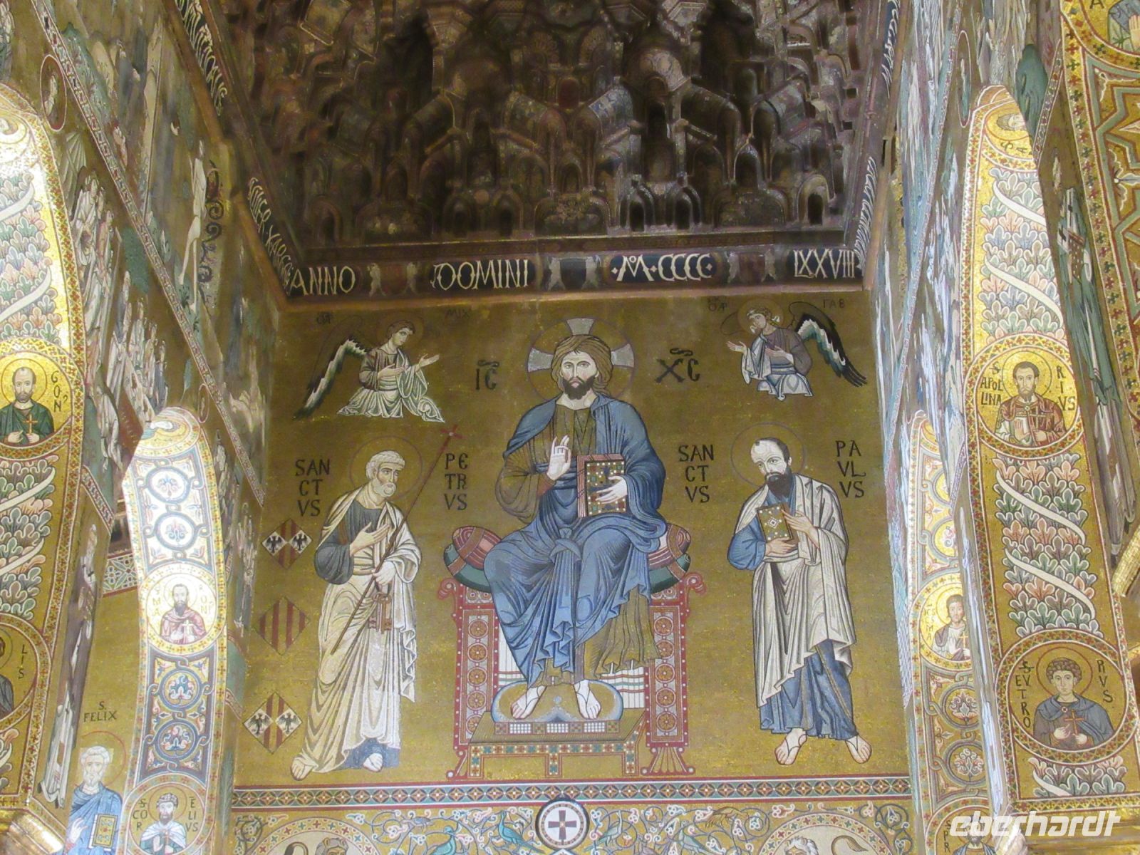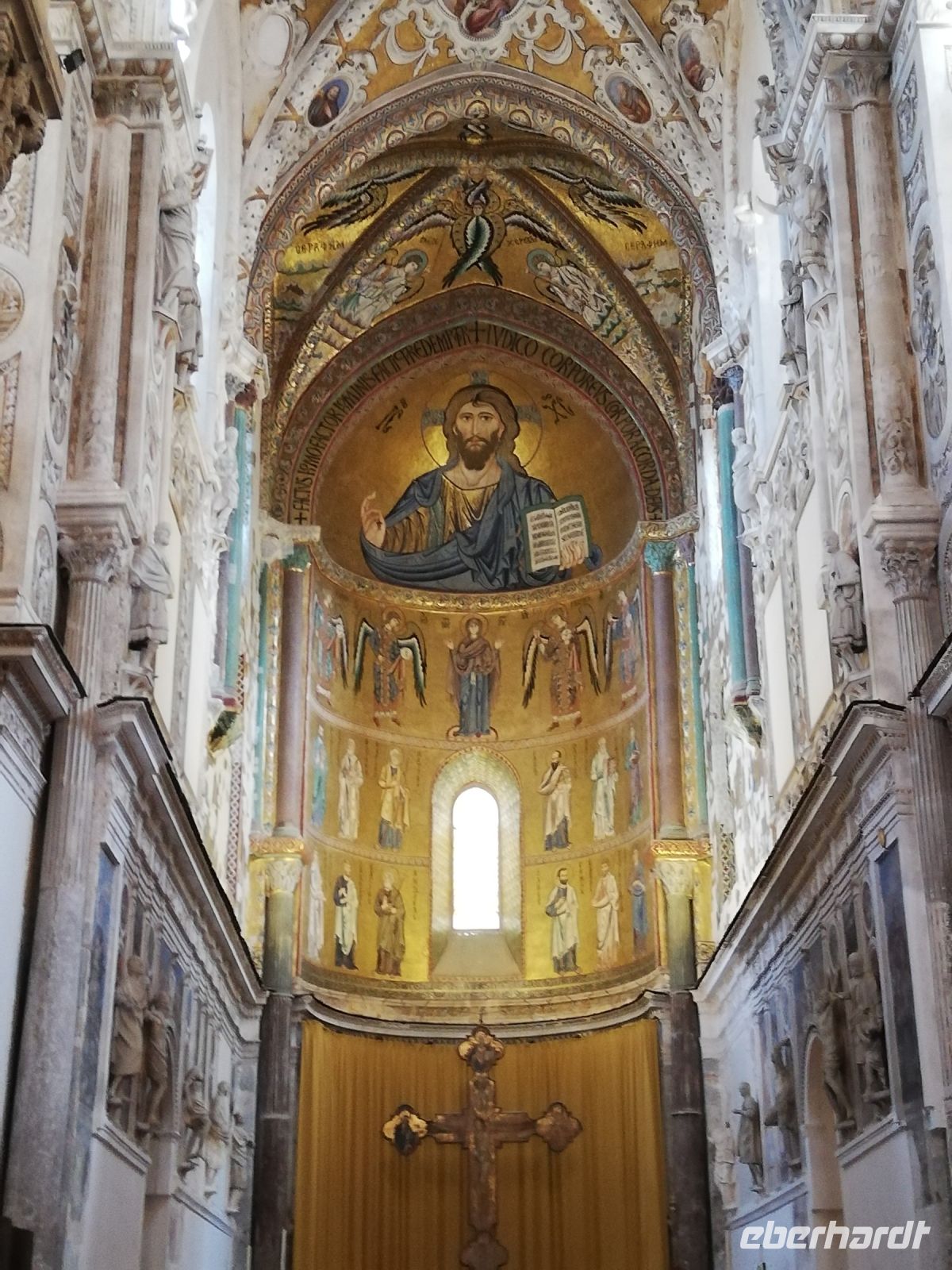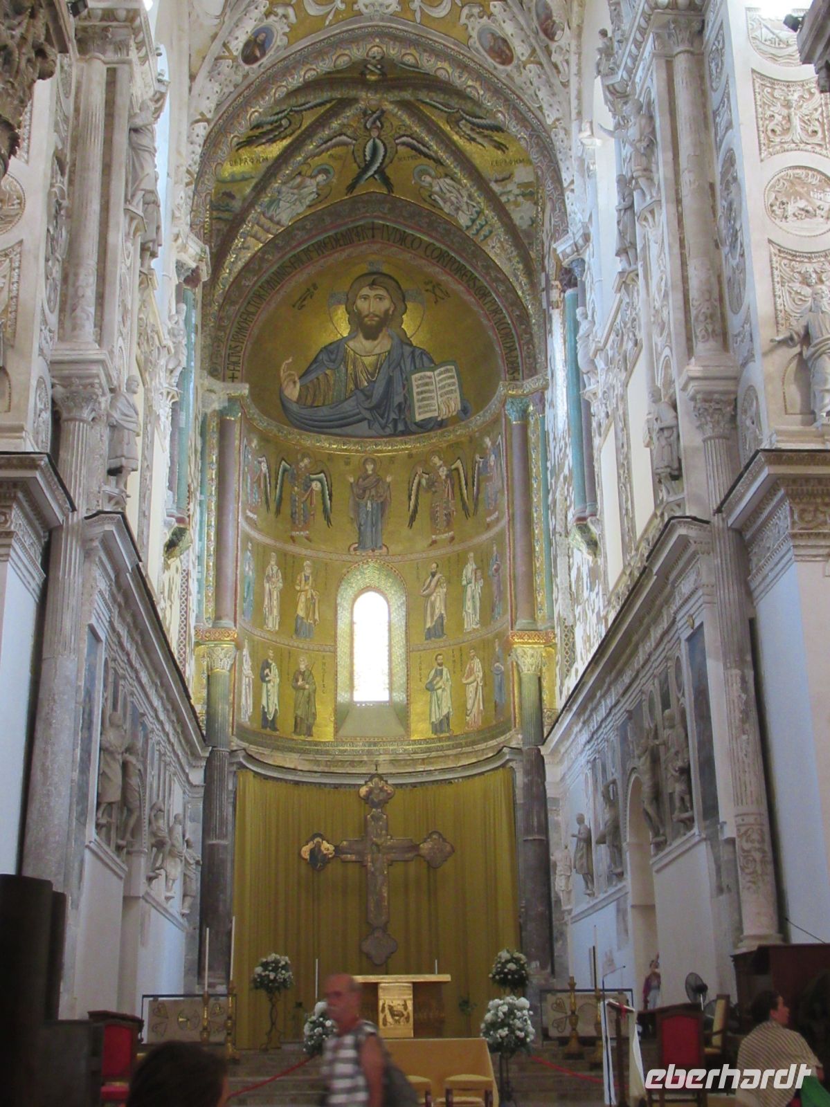 Das Innere der Kathedrale ist in drei Schiffe unterteilt. Ursprünglich war in der Apsis ein großes Rosettenfenster vorhanden, welches allerdings im Jahr 1142 zugemauert wurde, um mehr Fläche für Mosaike zur Verfügung zu haben. Diese Mosaike wurden im Jahr 1148 fertig gestellt. Teilweise wurden Künstler extra aus Konstantinopel geholt.