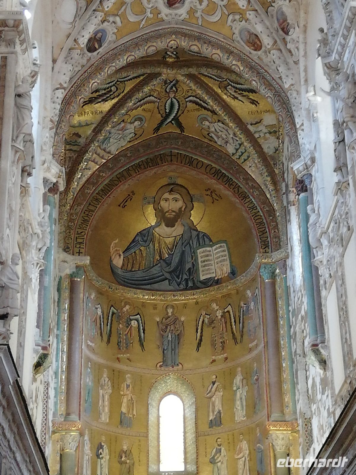 Mit 660.000 Einwohner ist Palermo die fünftgrößte Stadt Italiens. Nach ca. 1,5 Std. Fahrt waren wir in der Stadt. Unser Fahrer Francesco fluchte ab und zu mal über die Fahrweise in der City, aber wir kamen zügig durch und standen in der Nähe des Eingangs in die „Capella Palatina“. Auch hier mussten unsere Taschen über den Scanner und bald standen wir staunend in der vergoldeten „Capella“.