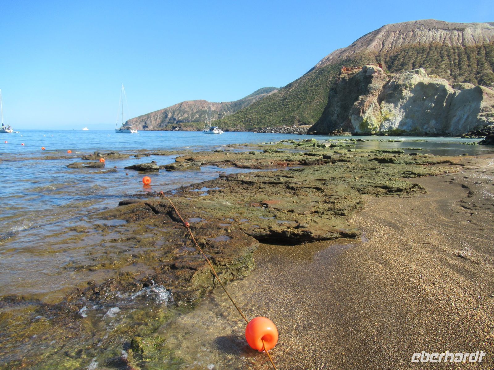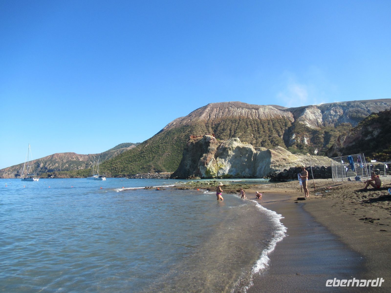 Nach einer kleinen Pause saßen wir auf der Fähre Richtung Insel Vulcano. Da der Aufstieg zu dem Krater durch starke Schwefeldämpfe nicht möglich ist, freuten sich Alle auf etwas Ausspannung und Baden im Meer an dem „schwarzen Strand“. Das Wasser sah zwar etwas milchig aus, dennoch war es klar und sauber.