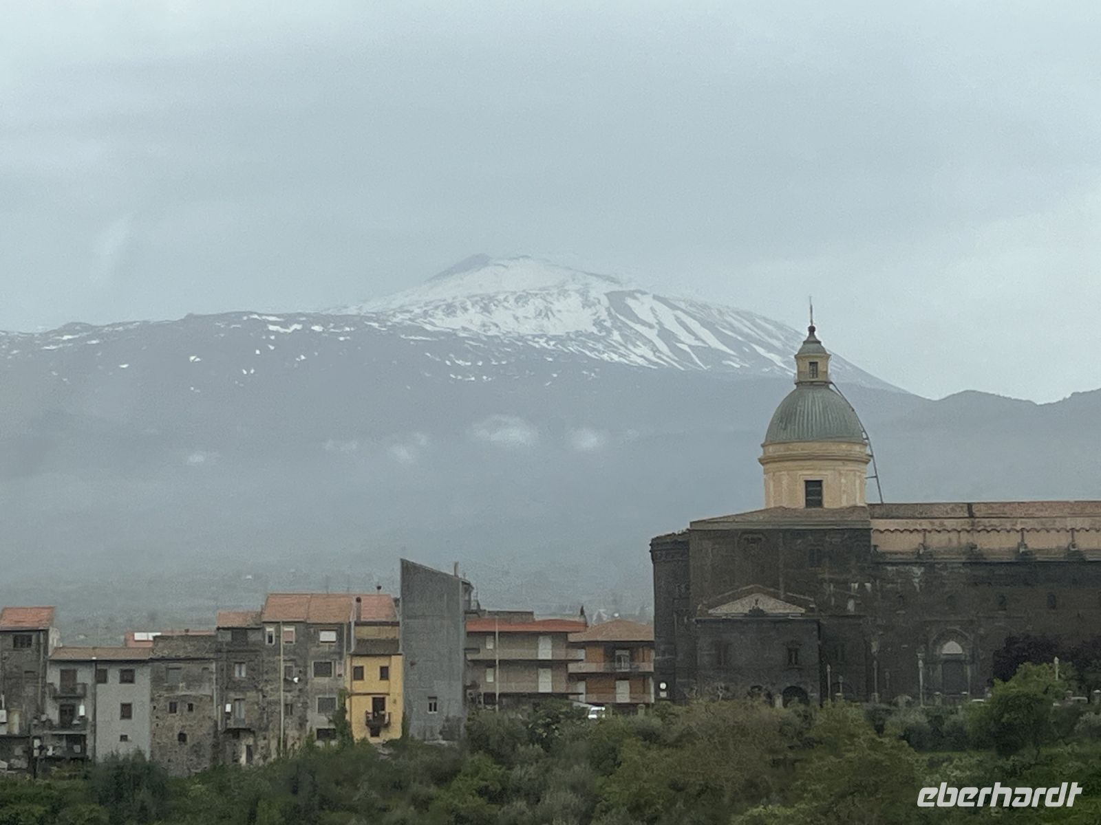 Nach einem leckeren Frühstück im Hotelrestaurant fahren wir 2 Stunden zum Ätna, dem höchsten noch aktiven Vulkan Europas. Nach einer entspannten Busfahrt erreichen wir die Silvesterkrater des Ätnas der Höhe von 1.923 Metern. Schon von hier aus sehen wir die beeindruckende Mondlandschaft aus schwarzen Gesteinen und erkalteter Lava. Leider regnet es stark und der Gipfel ist in Wolken. Deshalb entschließen wir uns nicht auf den Gipfel zu fahren. Mit Enza unserer italienischen Reiseführerin begeben wir uns auf eine kurze Wanderung zu 2 Kratern. Sie illustriert uns mit viel Sachkenntnis die Entstehung dieser Landschaft.