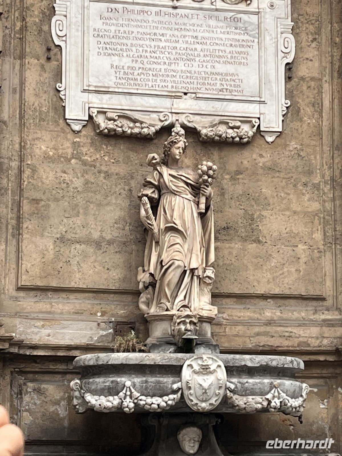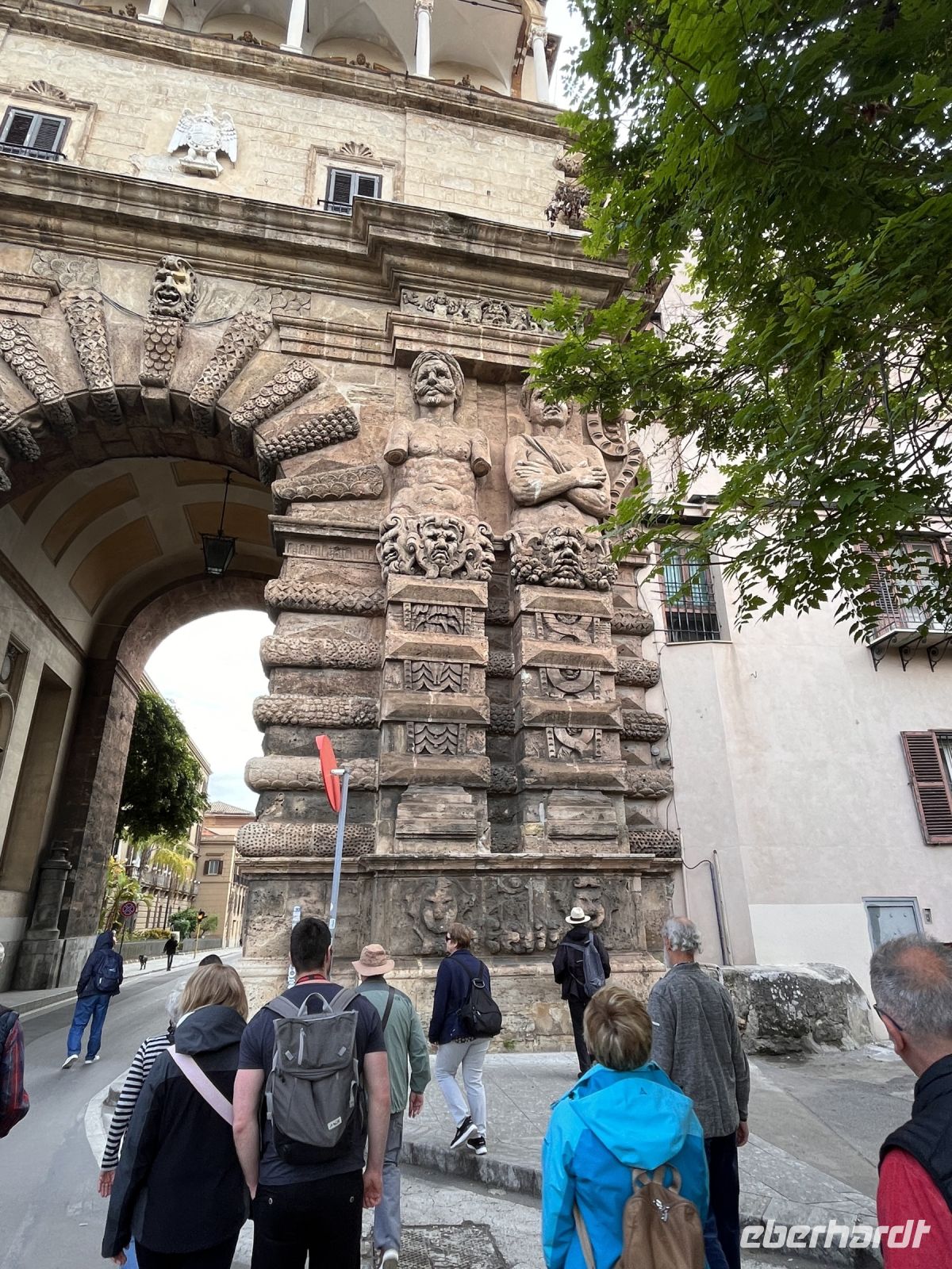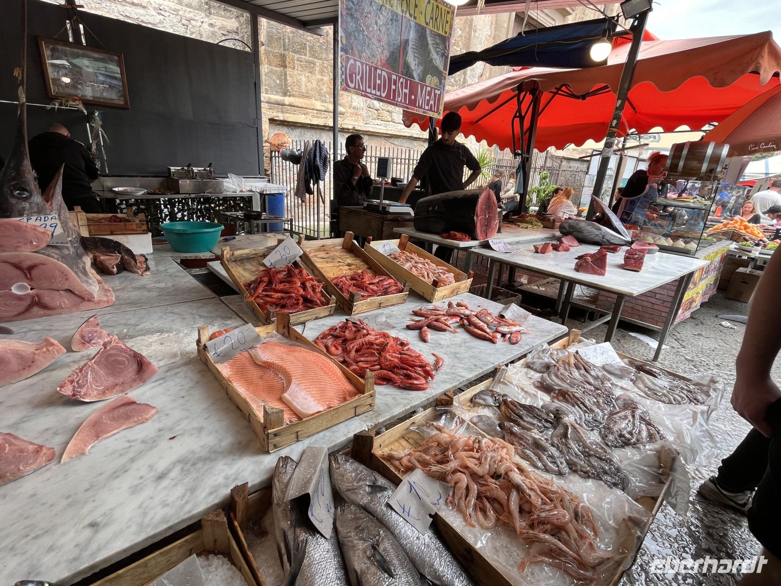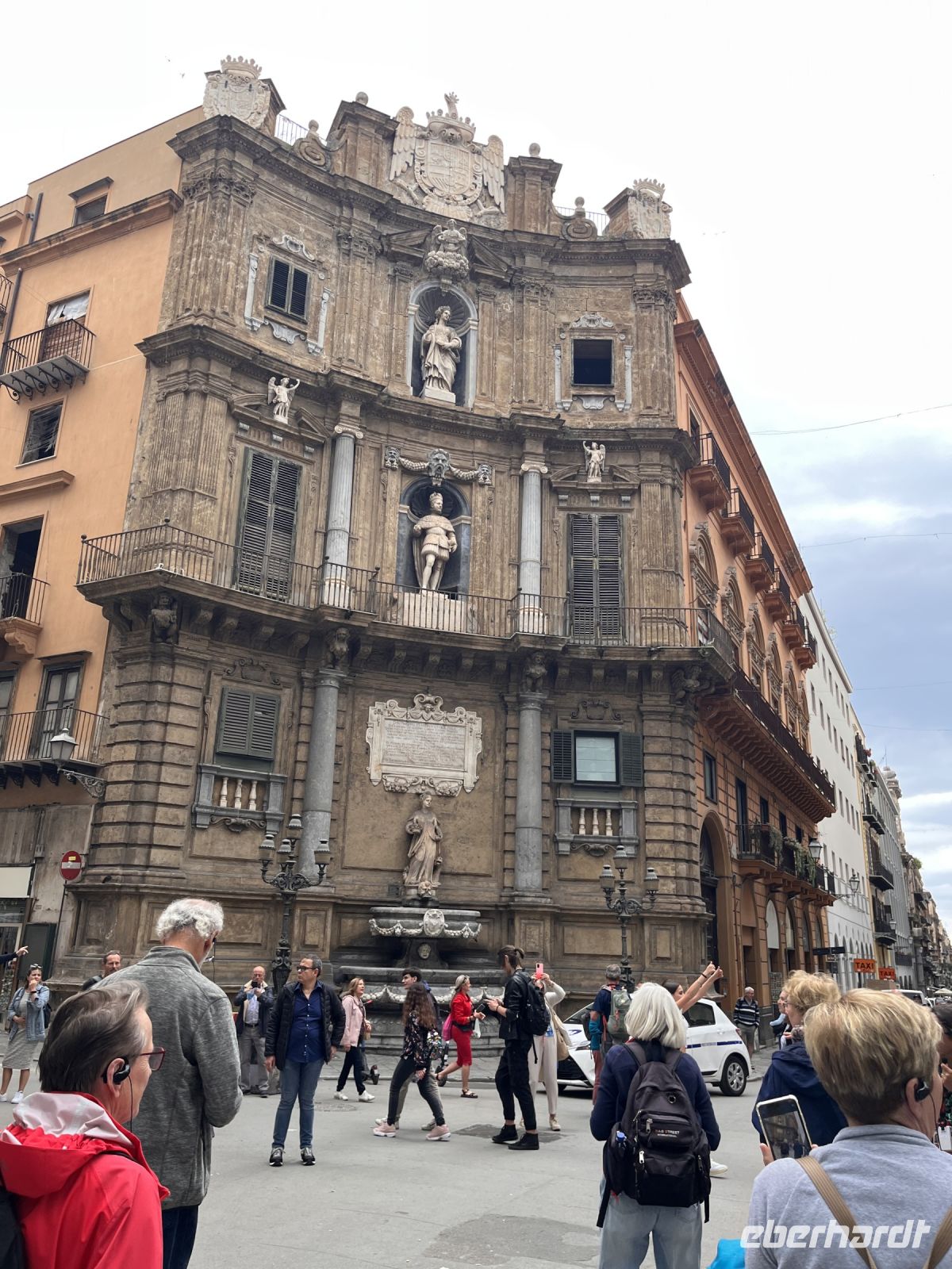 Weiter geht unser Weg in das Stadtzentrum. Unsere nette Lokale Reiseführerin Enza Gibt uns viel Informationen über die Gebäude im Zentrum der Stadt. Wir besichtigen den Schambrunnen, den Platz der vier Jahreszeiten, die Kirche der Martorana. Einige der Reiseteilnehmer begeben sich zu einem kleinen Imbiss auf den Markt der Stadt wo wir Stände, mit lokalen Spezialitäten, Textilien und viel viel anderes bewundern.