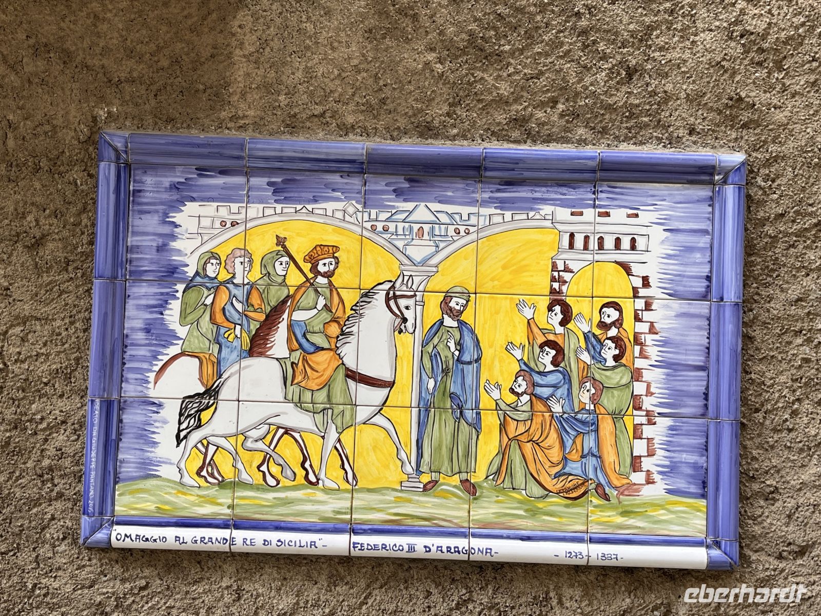 Nach einem köstlichen Frühstück starten wir in den letzten Tag unserer Rundreise. Zunächst fahren wir in das Nebrodi-Gebirge. Auf einer Höhe von über 900 m über dem Meeresspiegel erreichen wir das kleine Dorf Montalbano Elicona. Dieses Dorf soll eines der schönsten in Sizilien sein. Hier bestaunen wir die Burg Friedrichs des Zweiten und besuchen das kleine Museum des Ortes, welches interessante Informationen zur Geschichte des Ortes auf zahlreichen Fotos dokumentiert.