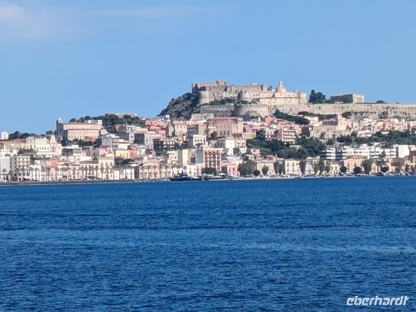 Zunächst fuhren wir mit dem Schiff an einer normannischen Festung vorbei, die sich auf einer Landzunge am Hafen von Milazzo befindet.