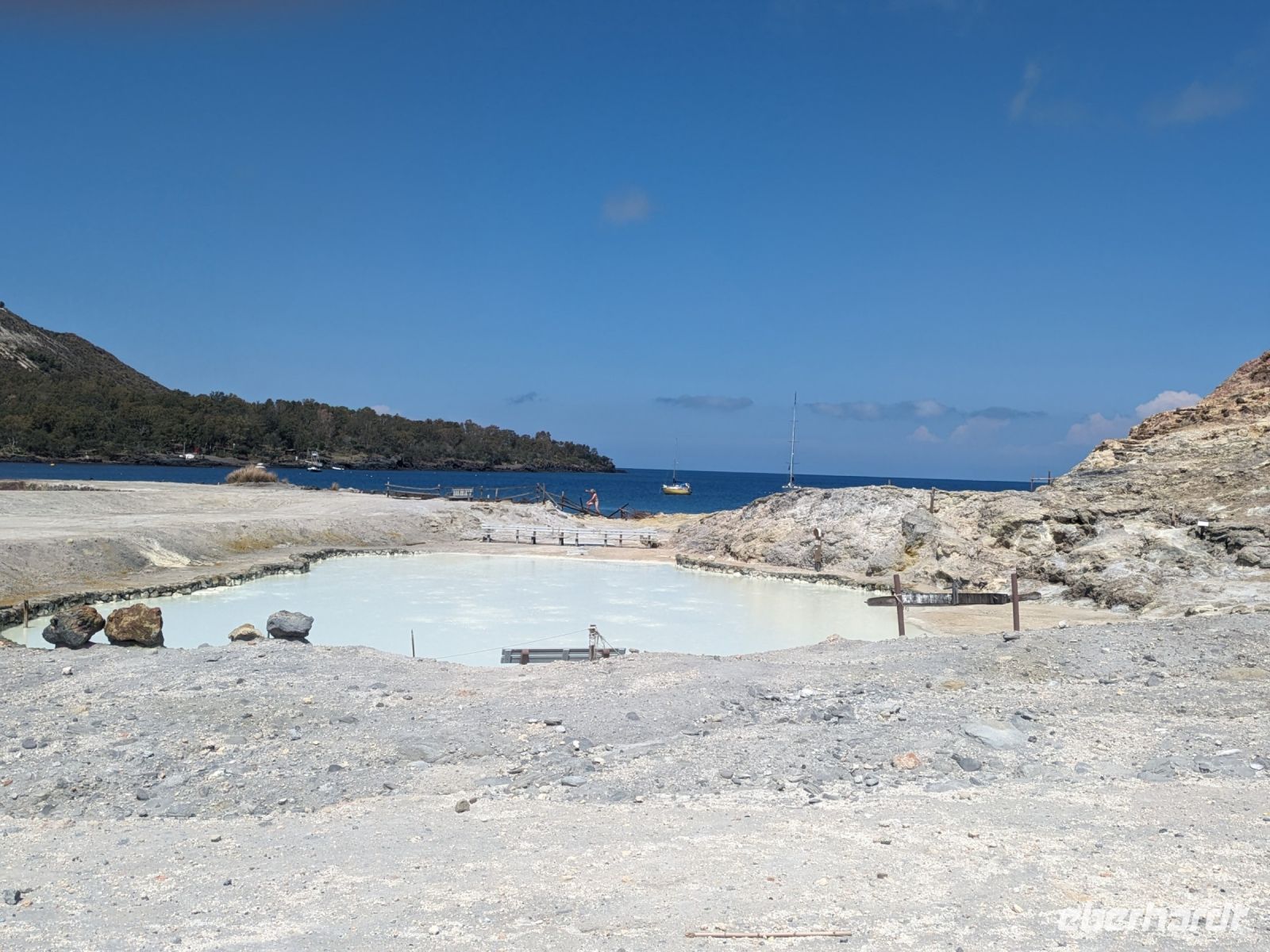 Nach einer kurzen Schifffahrt betraten wir unser zweites Ziel an diesem Tag, die Insel Vulcano. Hier riecht es überall nach Schwefel. Fast zum Greifen nah sehen wir vom Strand aus nur wenige 100 m über uns mehrere rauchende Fumarolen. Direkt am Strand gab es brodelnde Schlammkessel. Auch im Meer traten Gasblasen aus. Dort aber konnten wir Baden Einige Reiseteilnehmer stellten sich dabei direkt über die Gasblasen. Dabei wurden die Füße von den Steinen angewärmt.