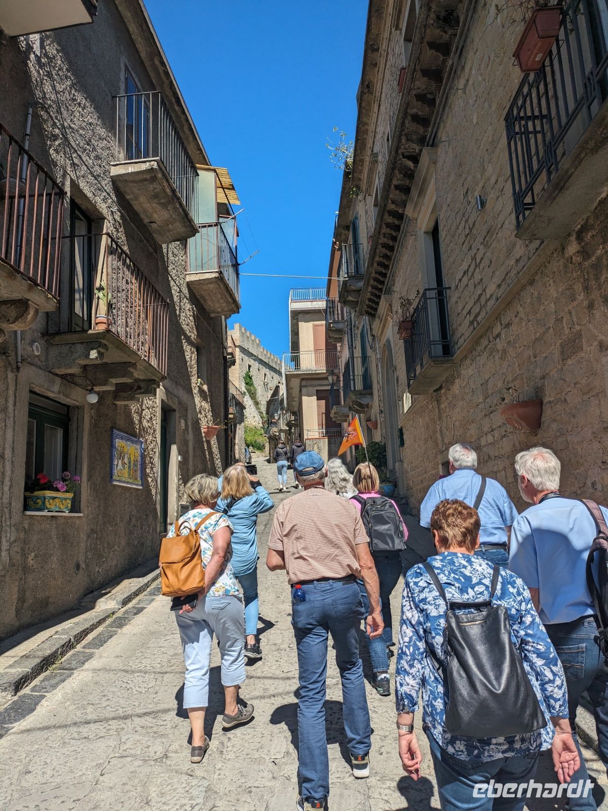 Ausnahmsweise fuhren wir erst um 9:00 Uhr ab. Heute ging es in die Berge. Fast ganz Sizilien besteht aus Gebirgen. Unser erstes Ziel war der Ort Montalbano in 900 m Höhe. Im Jahr 2015 erhielt er den Titel ´Schönstes Dorf in Italien´. Blickfang des Dorfes war das mittelalterliche Kastell. Wir waren die einzige Touristengruppe. Fast jeder Platz, jede Straße, jeder Stein atmete Historie besaß einen etwas morbiden Charme. Das ergab viele stimmungsvolle Fotomotive.