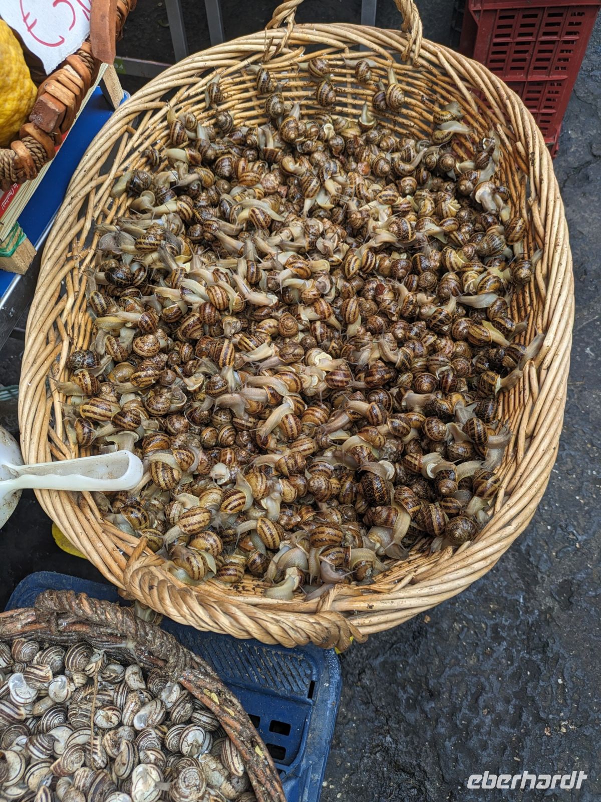 Der Fischmarkt besitzt einen Flair wie vor 100 Jahren. Dort gibt es zum Beispiel Körbe mit tausenden Schnecken, Scampies, Muränen, Fleischfetzen, die an Haken hängen und viele Thunfische. Wer möchte, kann sich sofort die schmackhaften sizilianischen Blutorangen auspressen lassen.