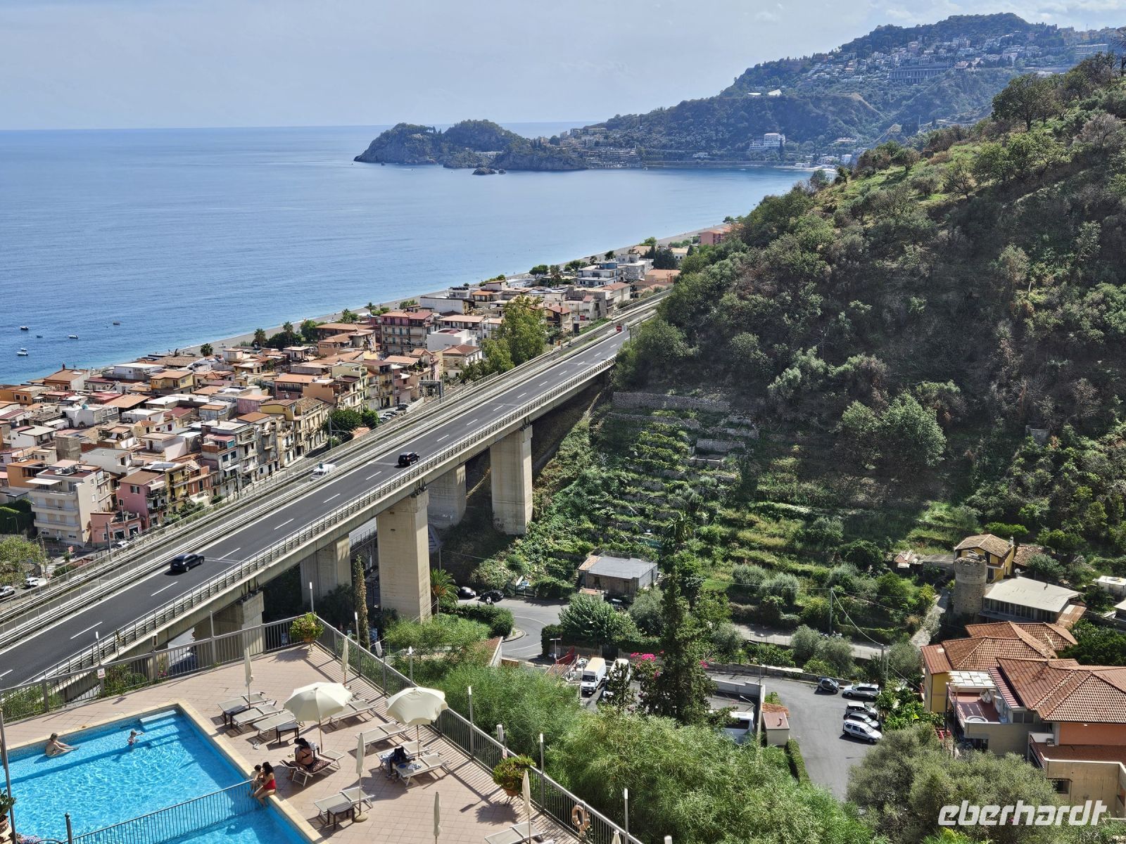 Unsere örtliche Reiseleiterin Christiane begrüßt uns am Flughafen in CATANIA und nach einer reichlichen Stunde Fahrzeit sind wir in unserem Hotelkomplex ANTARES in LETOJANNI angekommen. Hoch oben auf dem Felsen thront die große Anlage und entlockt uns erst einmal ein "Wow". Bis zum gemeinsamen Abendessen ist noch sehr viel Zeit, um den Ort mit Strand oder den großen Hotelkomplex, dessen Häuser und Aussenanlagen auf verschiedenen Terrassen liegt, kennenzulernen.