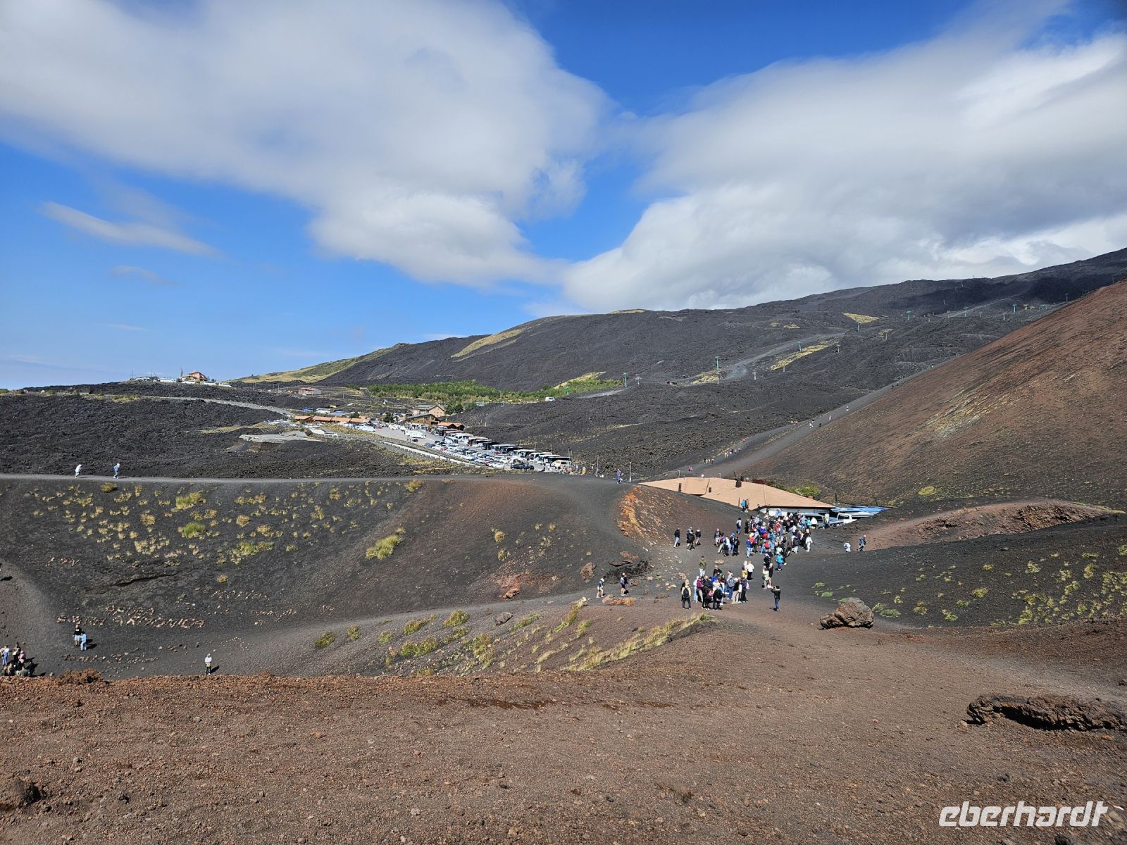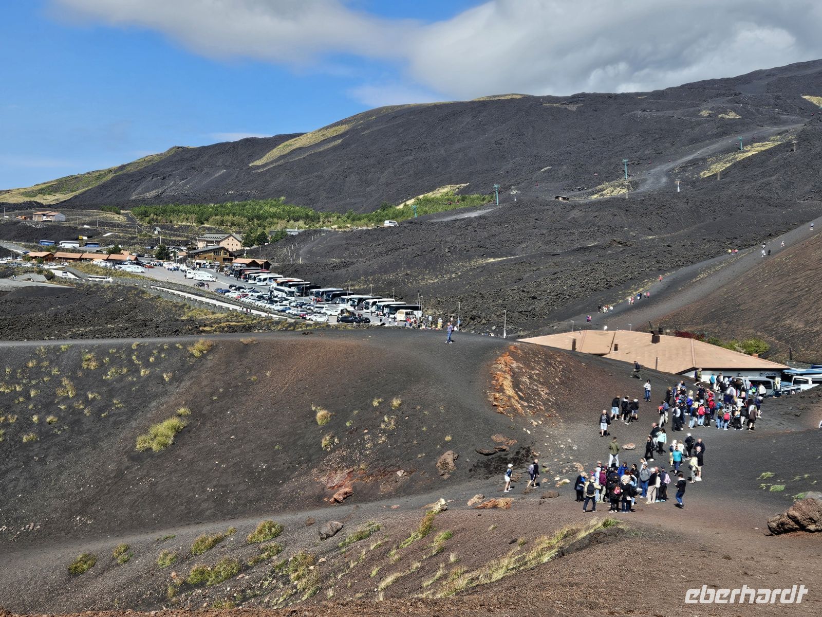 Genug geruht: nun geht es gleich nach dem Frühstück mit den ersten beiden "Knallern" los. Als erstes der ÄTNA, Europas mächtigster Vulkan, der alle Klima-und Vegetationsstufen Siziliens umfasst. Rechts und links der Strasse zur Seilbahn hinauf in 2500 m Höhe sehen wir verschiedene Zitrus-, Wein- und Olivenplantagen, Zeugnis des fruchtbarenBodens rings um den Ätna. Weiter oben wird es kärger und kälter und nachdem wir mit der Seilbahn oben angekommen sind, gibt es nur noch Lavagestein und es bläst ein heftiger Wind. Der Ätna versteckt seinen Krater unter Wolken und dichtem Nebel, ein Blick hinein ist ohnehin nicht mehr möglich, nachdem er erst im August "gespuckt" hat. Die Silvestkri-Krater unten an der Seilbahn kann man gemütlich bewandern, die machen auch Eindruck und schön ist es allemal.