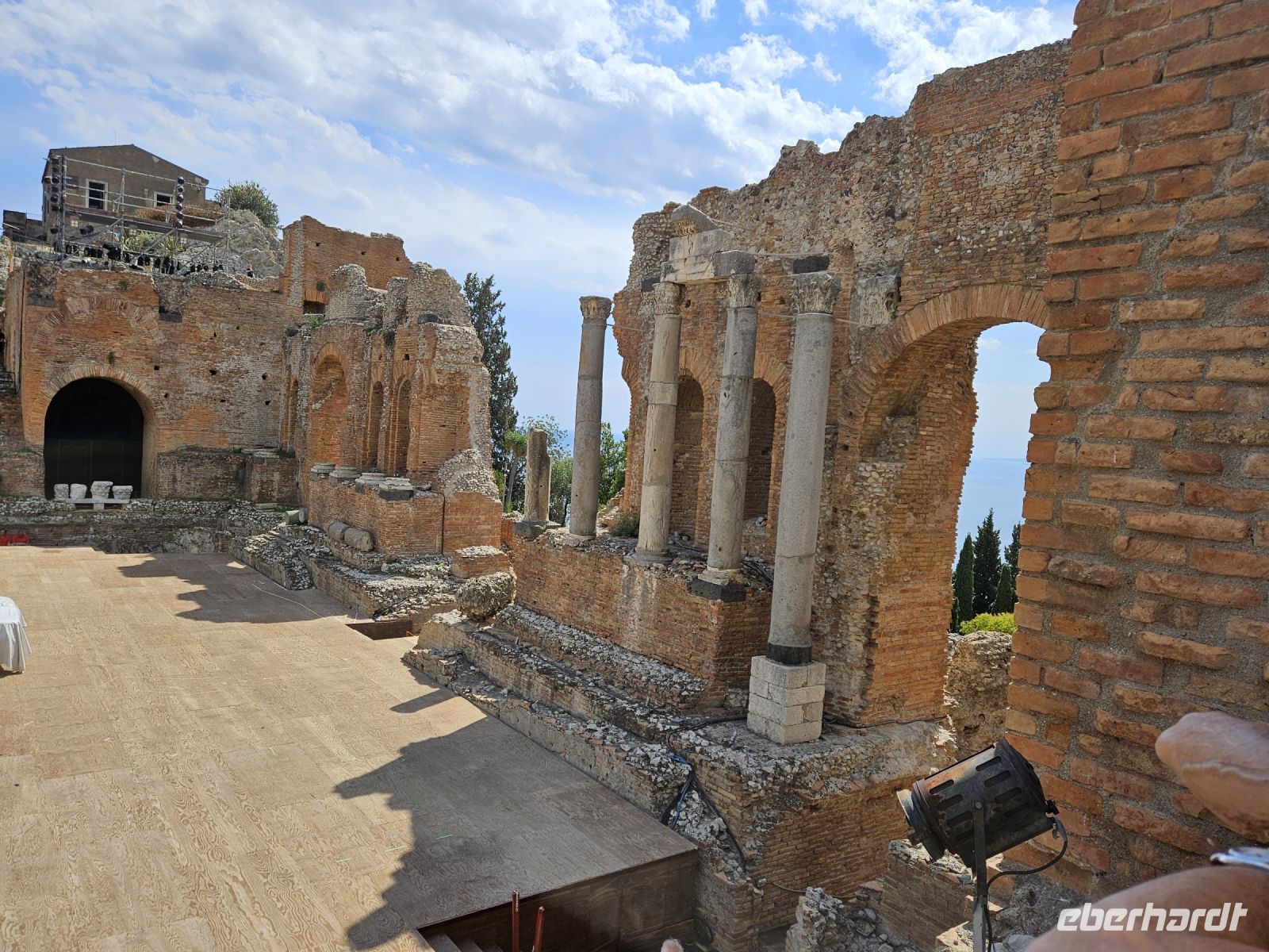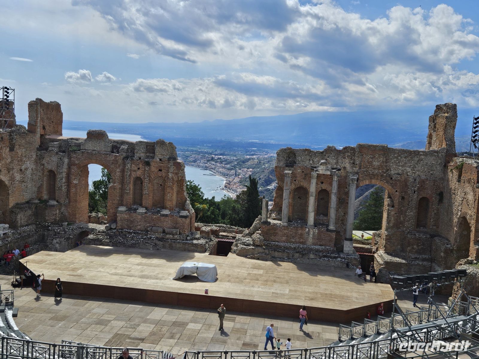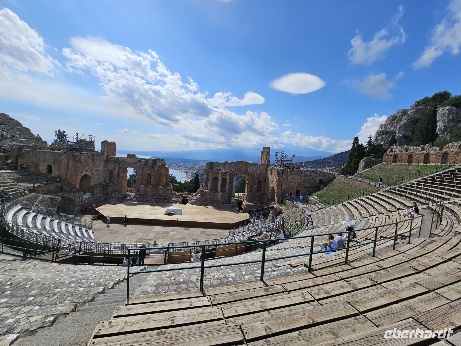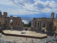 Der 2. Knaller an diesem Tag ist TAORMINA, auf einem Sporn der Peloritani-Berge hoch über dem Meer gelegen und wohl einer der bekanntesten Ferienorte Siziliens. Wir haben Glück, unser Kleinbus mit Fahrer Francesco kann uns bis unmittelbar vor das Stadttor fahren. Wir nehmen gleich das Highlight in Angriff - das TEATRO GRECO - ROMANO, in natürlichen Stein gehauen und nicht nur durch seinen Standort ein Augenschmaus. Die Kulisse mit Küste und Ätna im Hintergrund bietet allein schon genügend Stoff für eine Aufführung.