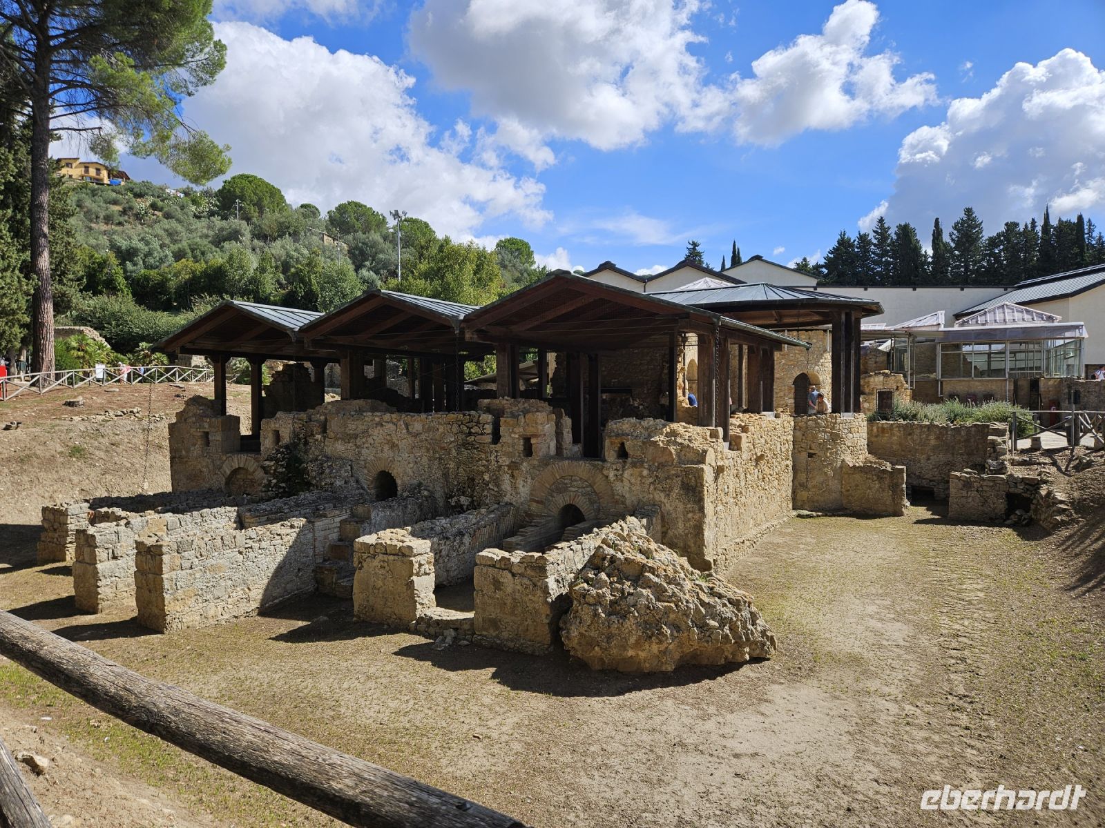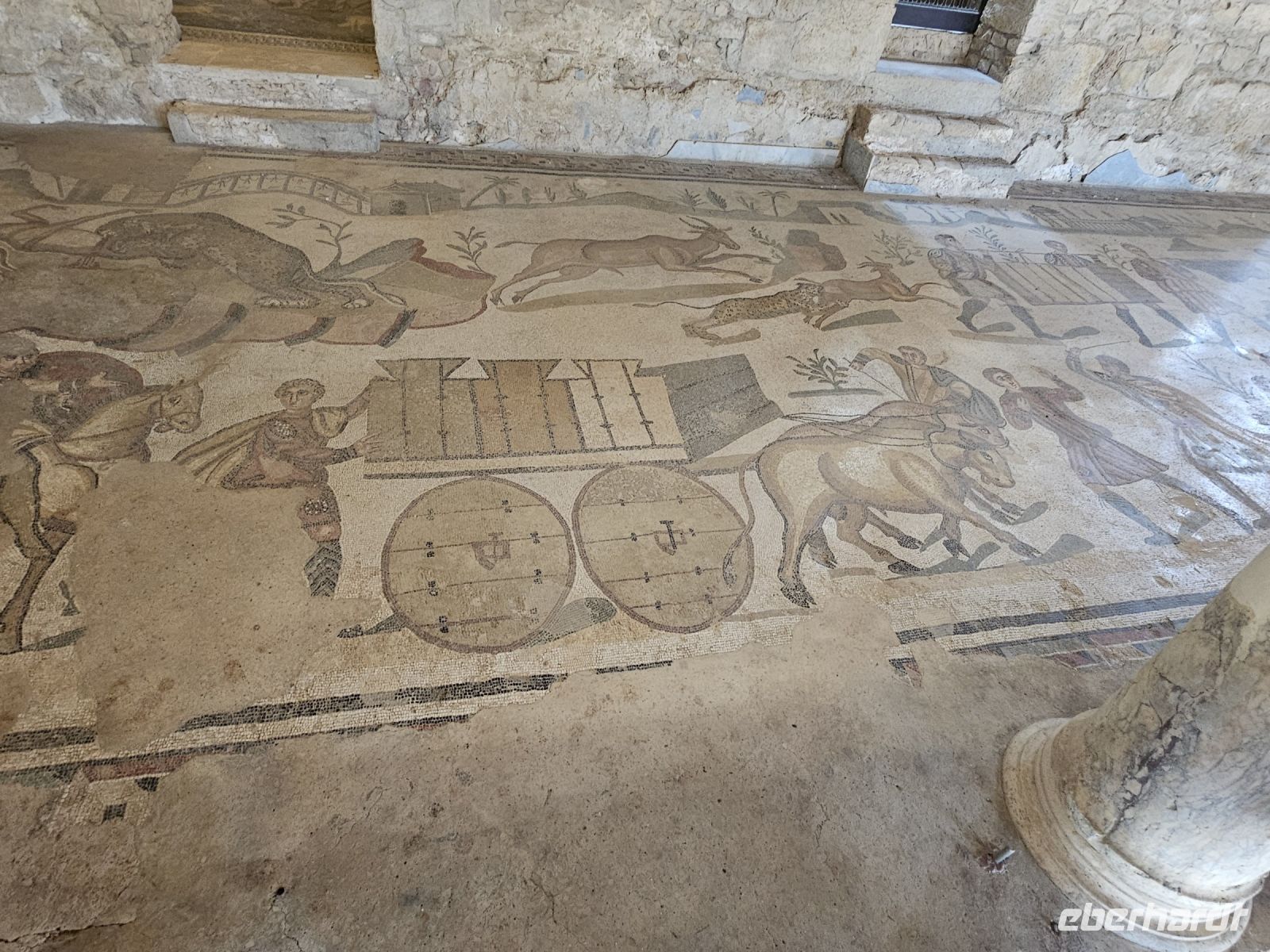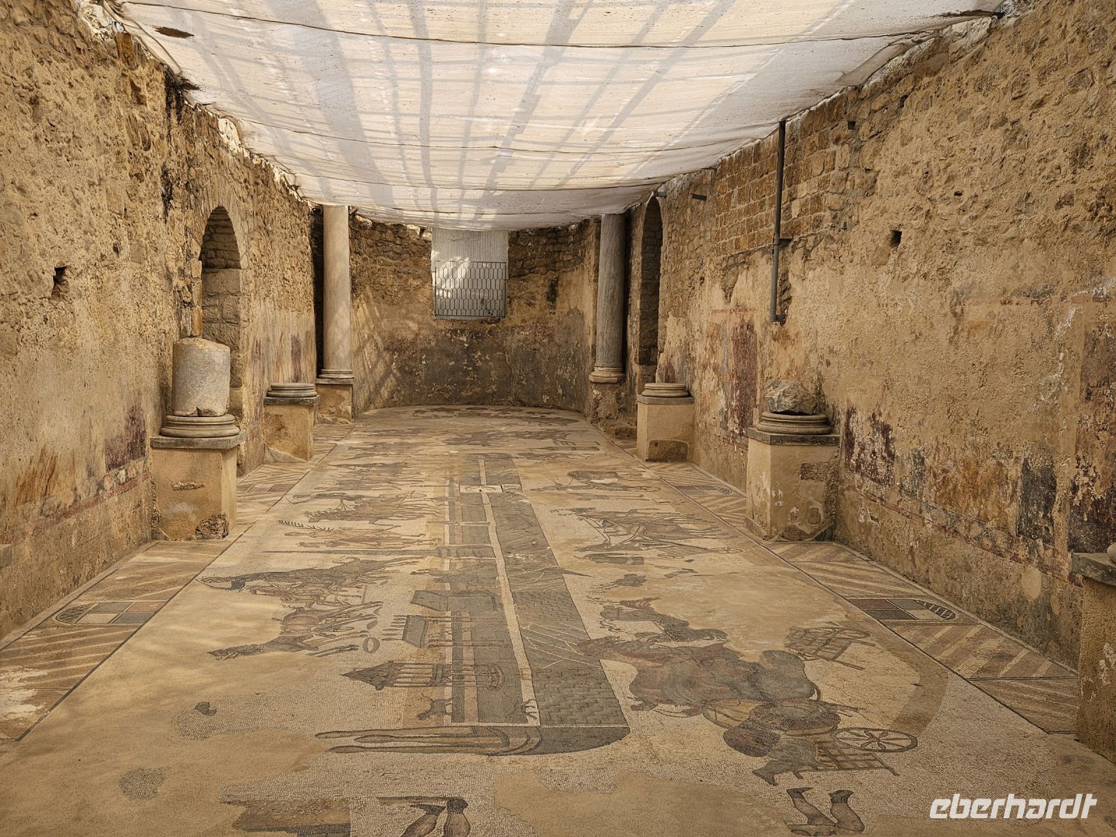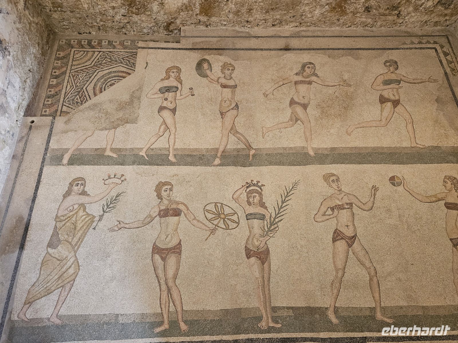 Nach dem Frühstück heisst es, Koffer fassen und verladen ( das macht unsere neue Busfahrerin Rosalba), denn wir verlassen die Ostküste Siziliens. Auf unserem Weg in den Südwesten passieren wir die Ebene von CATANIA bevor wir unser nächstes Ziel erreichen: die Ausgrabungsstätte der VILLA ROMANA DEL CASAL. Bei der Villa handelt es sich wohl um den Land- und Jagdsitz eines römischen Kaisers aus dem 4.Jhd. Der Grundriß der Anlage ist noch gut erkennbar. Wohn- und Repräsentationsräume, Thermen, Schlafkammern und Kammern für die Dienerschaft und unzählige Räume mehr. Besonders beeindruckend sind die gut erhaltenen Fußbodenmosaiken, die wohl zu den schönsten gehören, die aus der Antike überleifert sind. Und ein Lieblingsmotiv ist schnell gefunden: die "Bikini-Mädchen"- anmutig und schön.