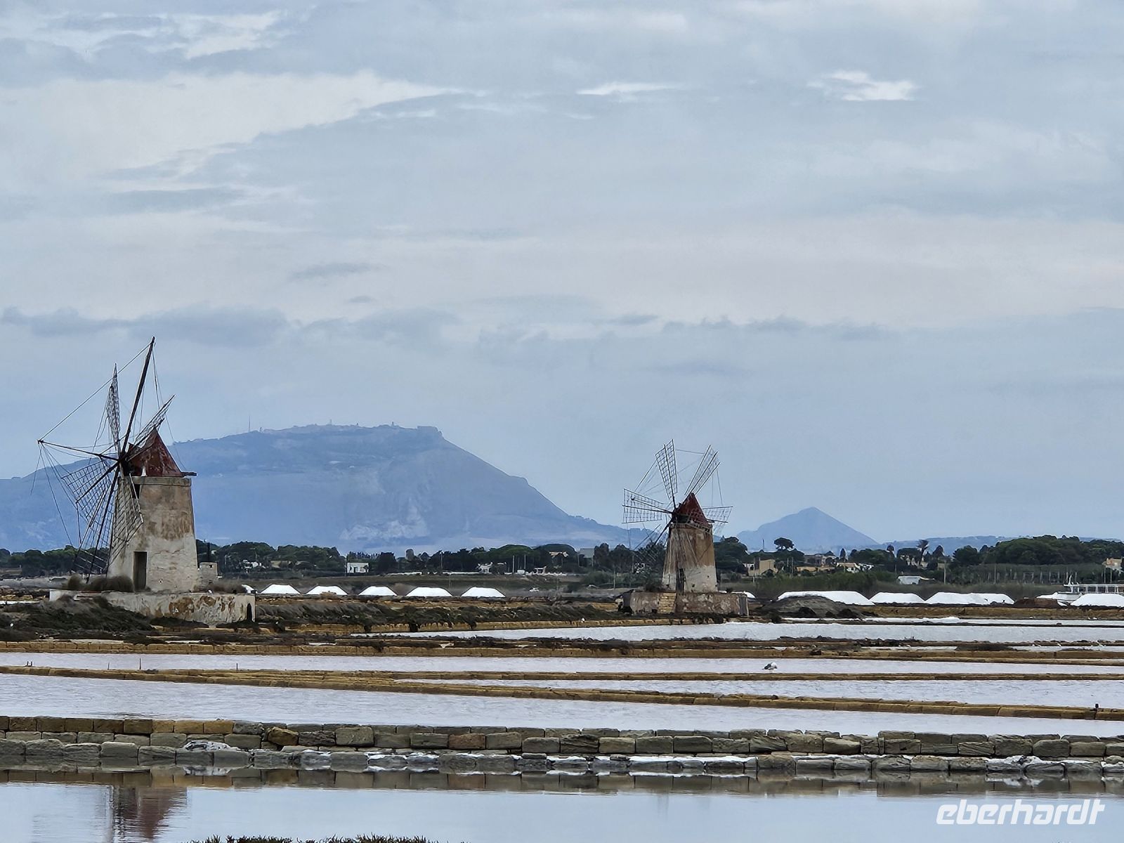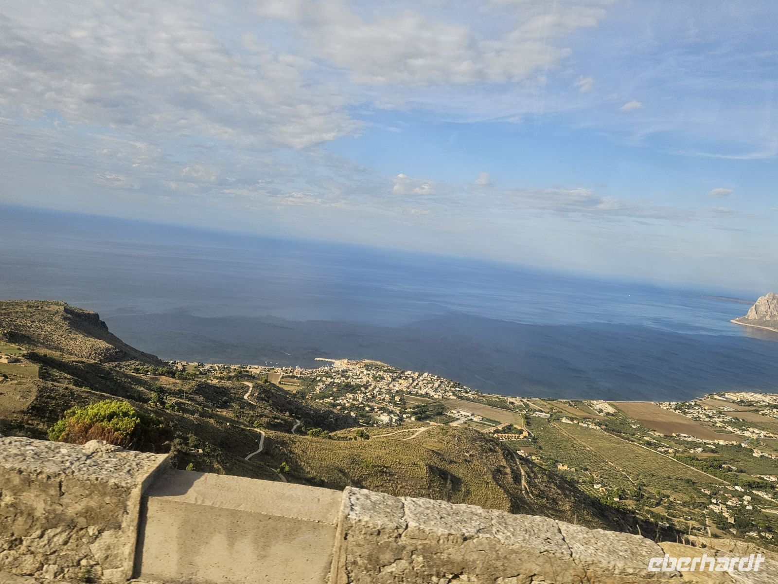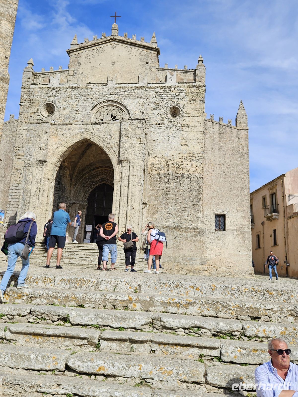 Das nächste Ziel ist ganz anders, wir fahren an der Küste entlang und die Salinenfelder scheinen kein Ende zu nehmen. Die Sonne hat sich beim Fotostopp an den Salinen bei Marsala versteckt und deshalb sind die Fotos nicht 1A, aber es ist angenehm warm und wir freuen uns schon auf das angekündigte sizilianische Mittagessen in der TENUTA FRATELLI SANACORE . ES SCHMECKT WIRKLICH 1A! Vom Essen ein wenig müde, kann man sich auf der Fahrt nach ERICE ausruhen, obwohl schon auf der Anreise spektakuläre Ausblicke auf den Berg und gleichnamigen Ort warten. Wir gehen durch die alten Eingangstore, weiter entlang der Stadtmauer, Kathedrale, vorbei am Turm von König Federico und der Venusburg mit ihren Wachtürmen, schlendern dann durch enge Gassen. Ein Stopp bei Maria gehört unbedingt dazu, ihr Mandelgebäck ist weithin bekannt . In ihrem Cafe/Bäckerei steppt der Bär, aber einige von uns können ihr Gebäck probieren und sogar einen Cappuccino dazu geniessen.