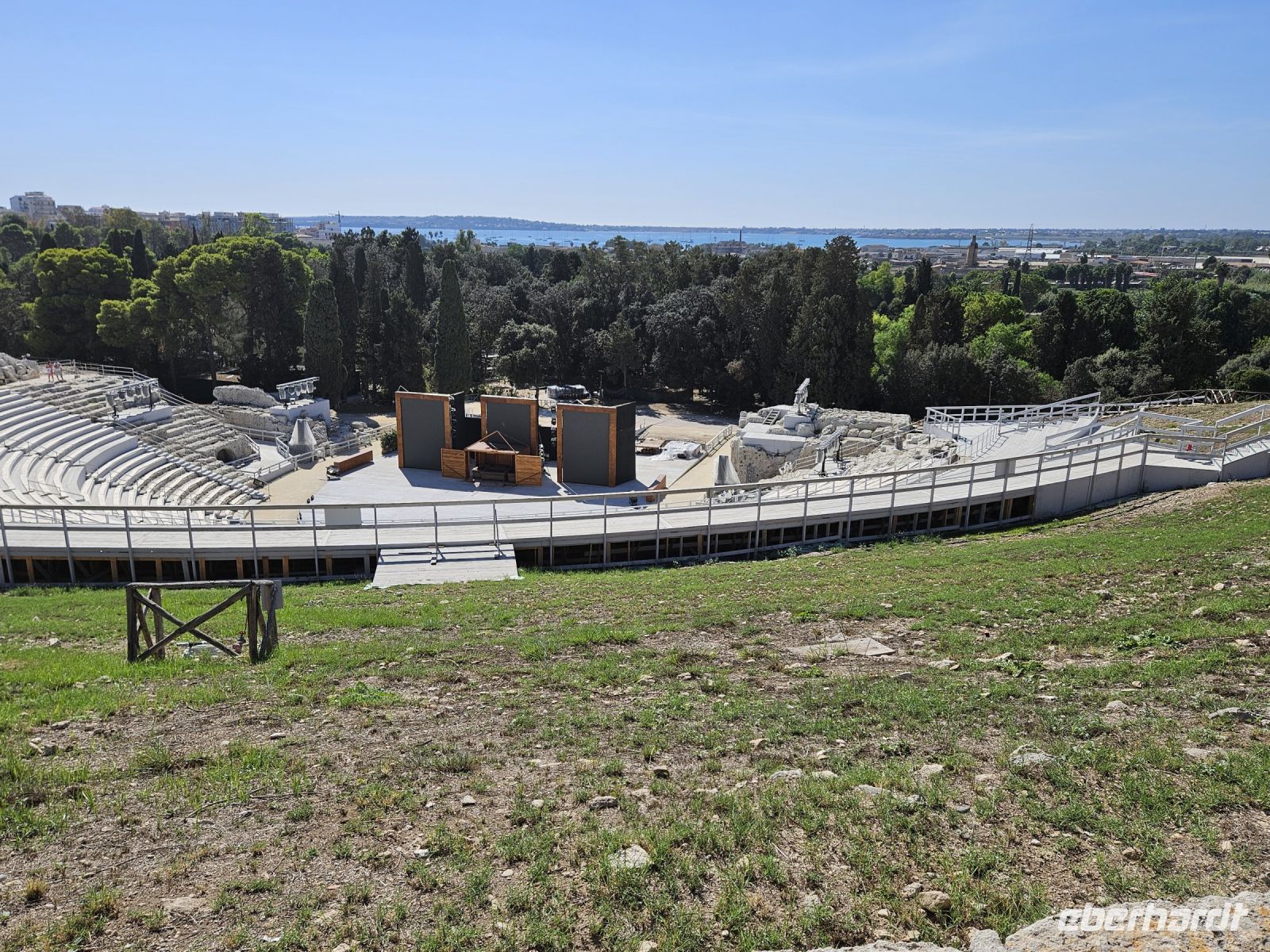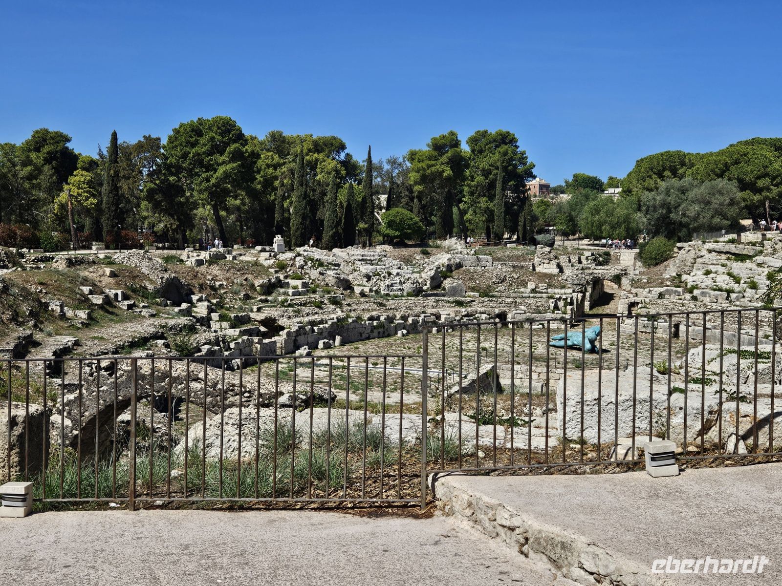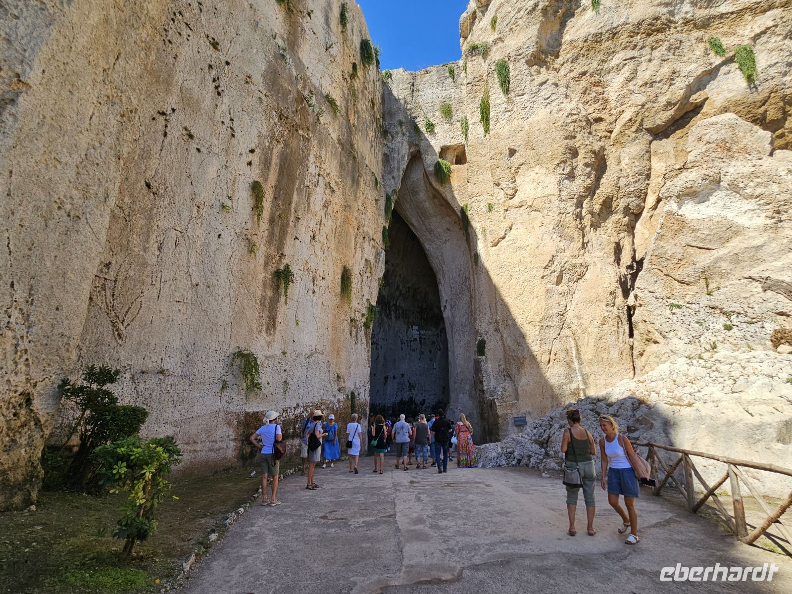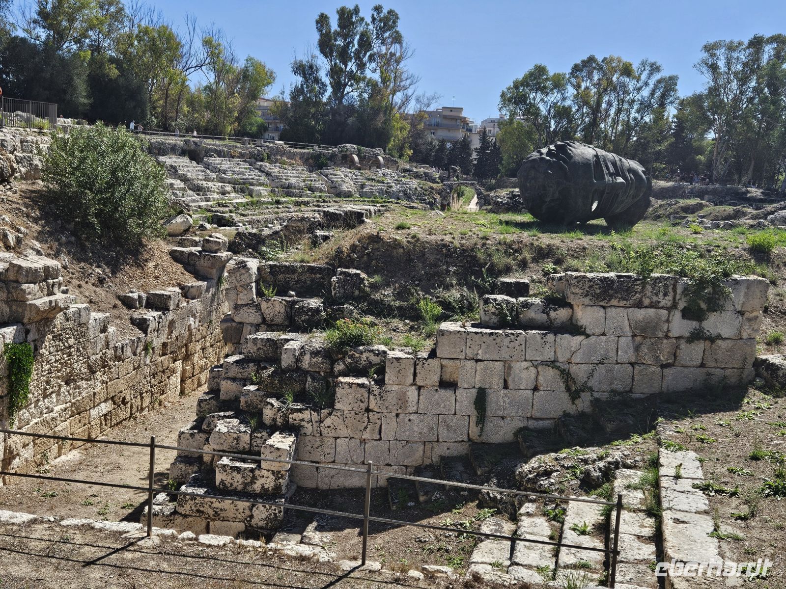 Nach dem Frühstück heisst es: auf zum nächsten Highlight - SYRAKUS - die weiße Stadt. Enza erwartet uns schon und nach kurzer nochmaliger Absprache über den Verlauf des Tages ( wir hatten am Vorabend entschieden, die Reihenfolge der Besichtigungen zu ändern) starten wir. Unser erstes Ziel an diesem Tag ist der zentral gelegene archäologische Park von NEAPOLIS mit seinen beiden Amphitheater (römisch und griechisch), der ehemalige Steinbruch, in dem auf Bäumen gleichzeitig 2 Zitrusarten wachsen - Zitrone und Orange. Das ganz besondere ist das ORECCHIO DI DIONISIO, eine Kalksteinhöhle, die wie ein menschliches Ohr geformt ist. Welch ein Zufall, dass wir die Besichtigung des archäologischen Parkes als erstes gewählt haben, er schliesst am späten Mittag, weil sich hoher Besuch ( G 7-Gipfel der Landwirtschaftsminister) angesagt hat.