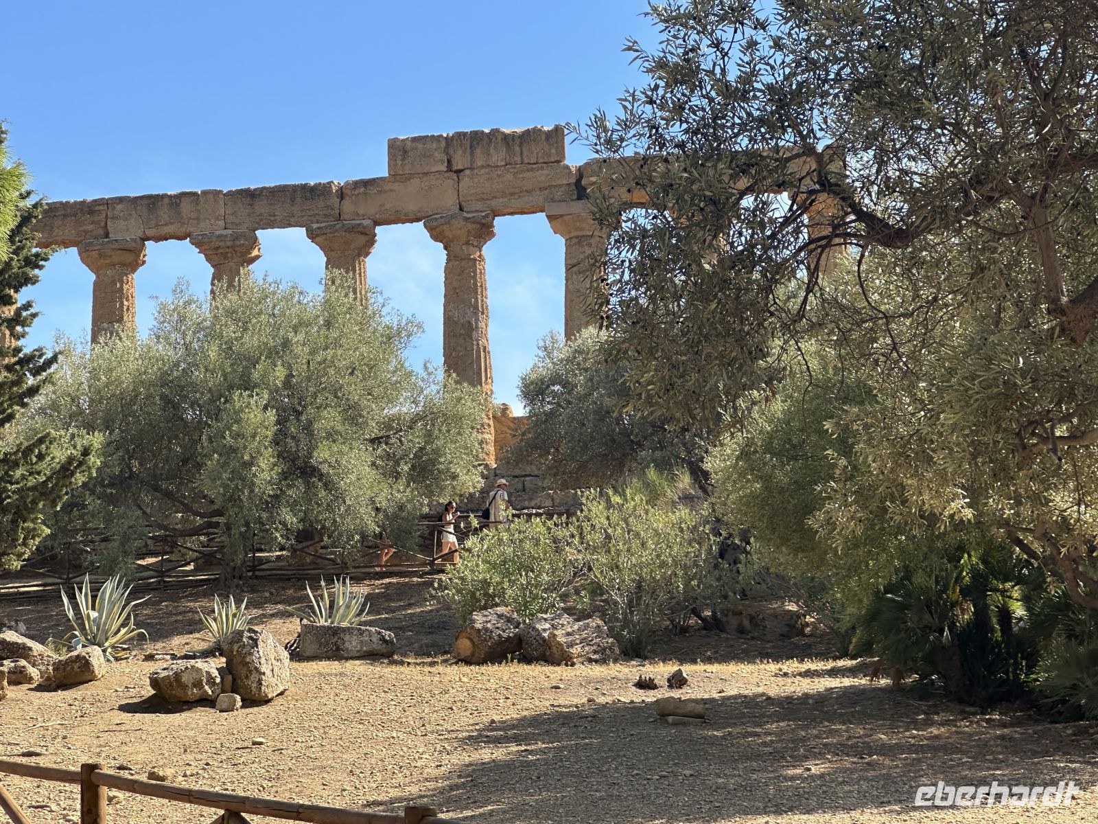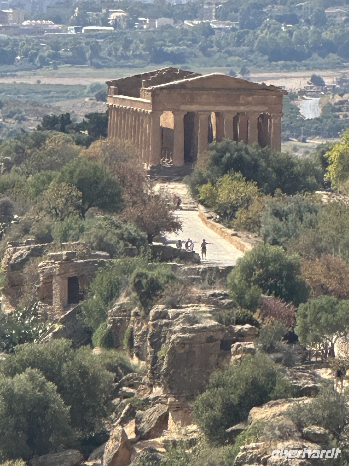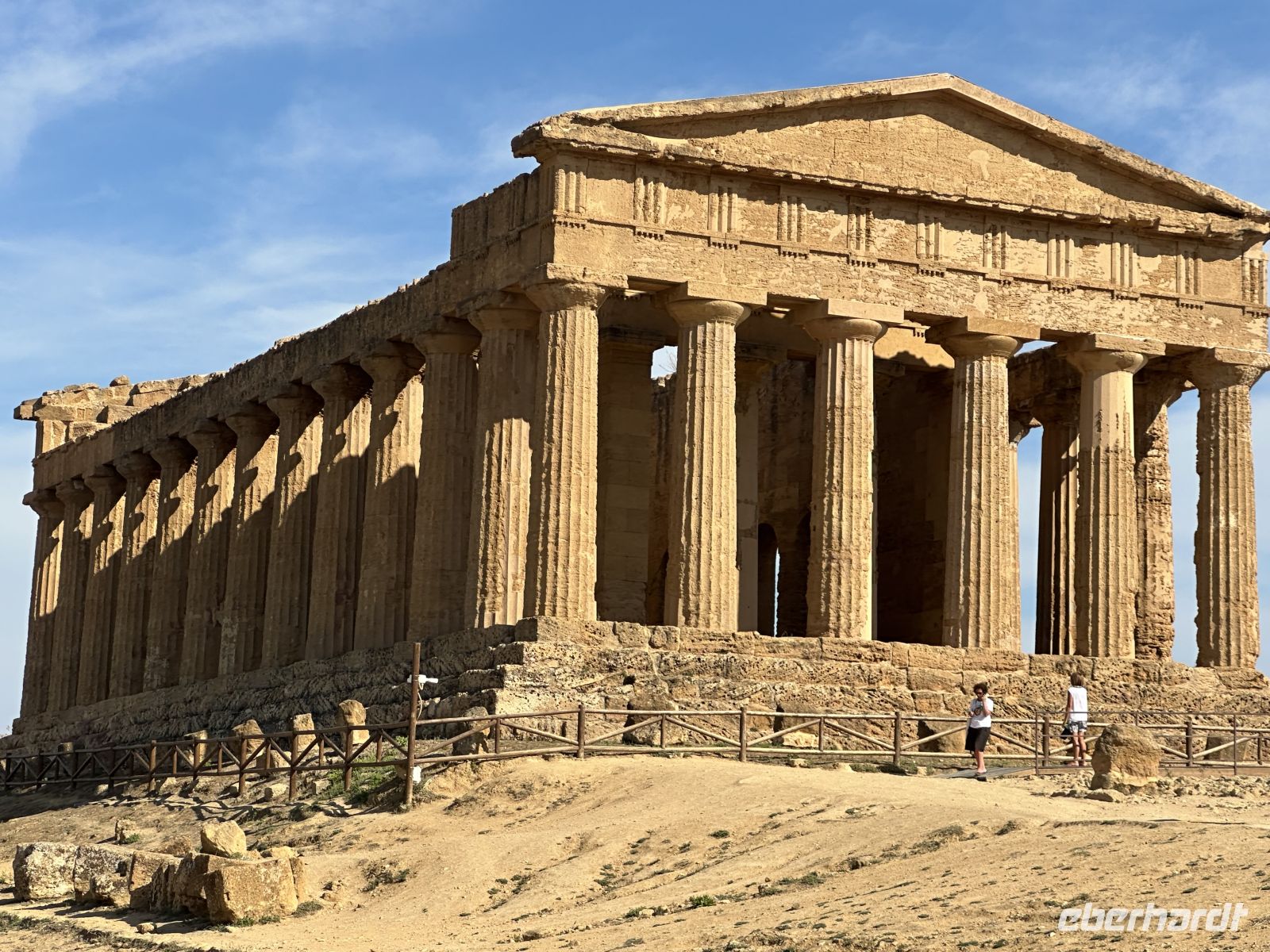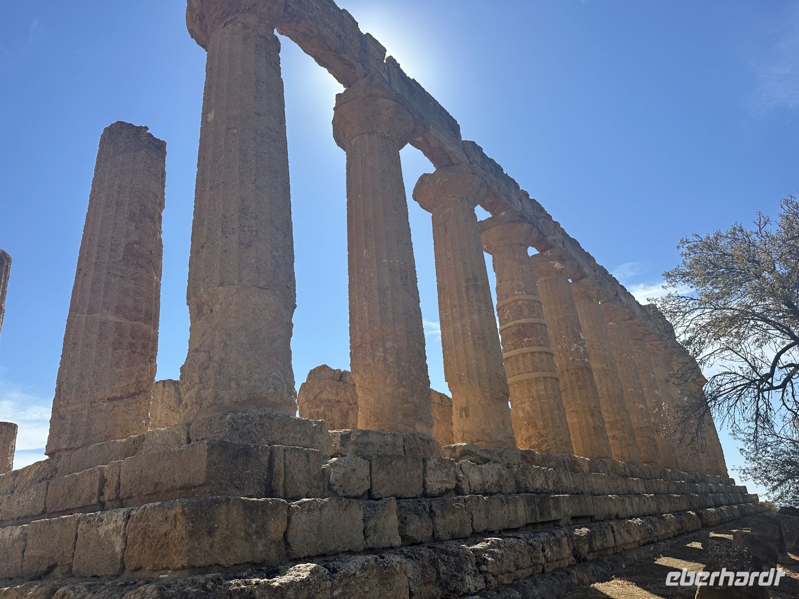 Nach dem Frühstück werden die Koffer verladen, wir wechseln heute das Hotel. Der Weg führt uns in den Südwesten Sizilien. Wir passieren die Ebene von Catania und erreichen nach erlebnisreicher Fahrt unsere erste Station die Ausgrabungsstätte Villa Romana. Es handelt sich hier wohl um den Land- und Jagdsitz eines römischen Kaisers aus dem vierten Jahrhundert .Unsere Reiseleiterin glänzt mit umfangreichen Geschichtswissen , was sie sehr verständlich rüberbringt. Die Villa Romana beeindruckt uns mit vielen Wohn- und Repräsentationräumen und einem umfangreichen Thermenbereich. Riesige Fußbodenmosaike in fast allen Räumen faszinieren alle Reise Gäste. Sie gehören zu den schönsten Mosaiken, die aus der Antike überliefert sind. In einem Raum sehen wir das bekannteste Motiv die Bikini Mädchen. Nach einer kurzen Stärkung fahren wir zur nächsten Station dem Tal der Tempel in Agrigent. Hier warten die Tempel der Hera, der Concordia und des Herakles auf uns. Alle sind beeindruckt! Noch einmal müssen wir 100 km überwinden und erreichen das Hotel Agricultura Case di Latomie . Es ist ein wunderschönes Hotel in Mitten traumhafter Natur. Viele Gäste nützen den Pool, um den Staub des Tages abzuspülen . Das Abendessen ist vorzüglich und reichhaltig voller sizilianischer Spezialitäten. Nach dem Abendessen sitzen wir unter Olivenbäumen und lassen die Eindrücke des Tages Revue passieren.
