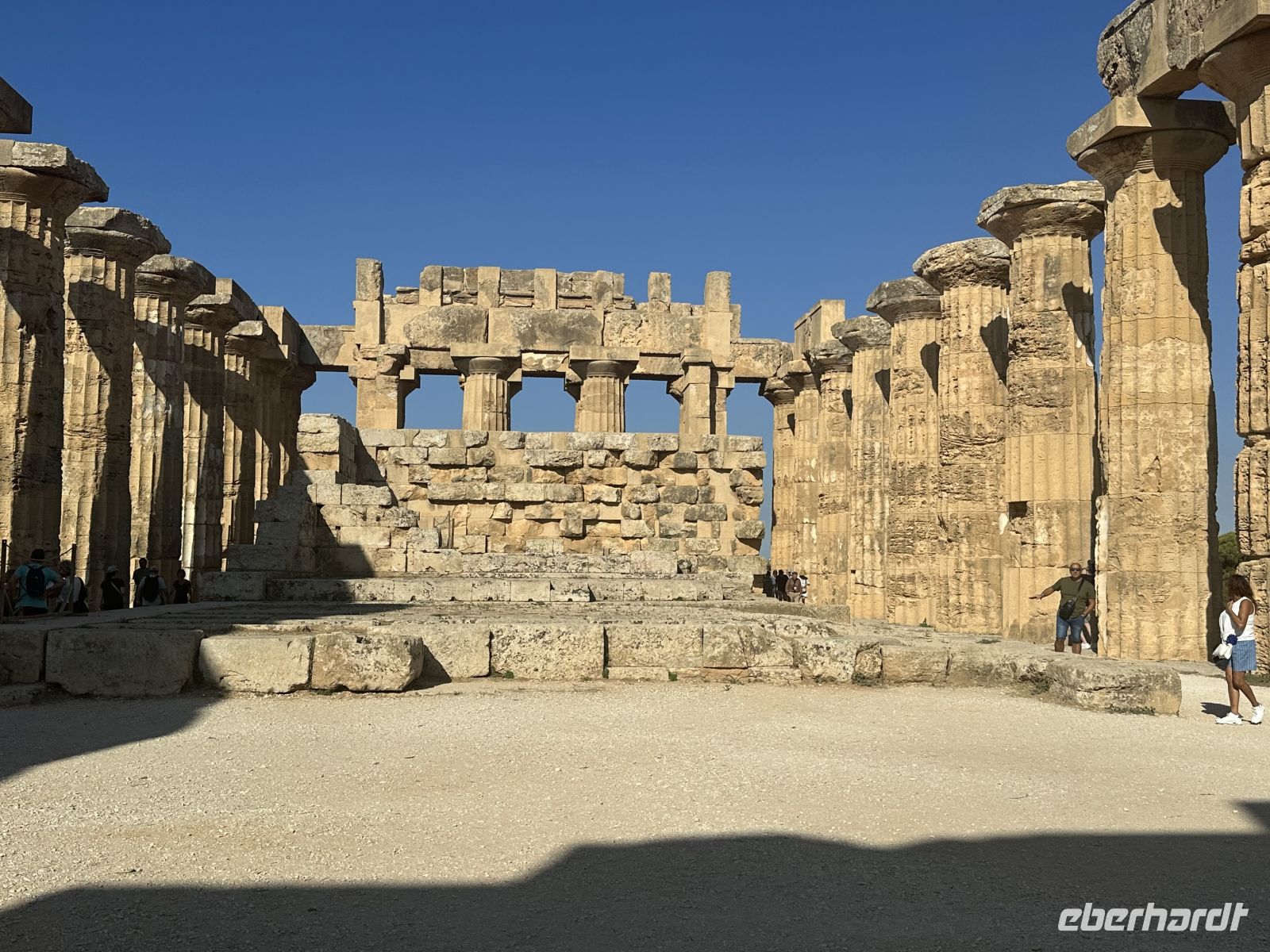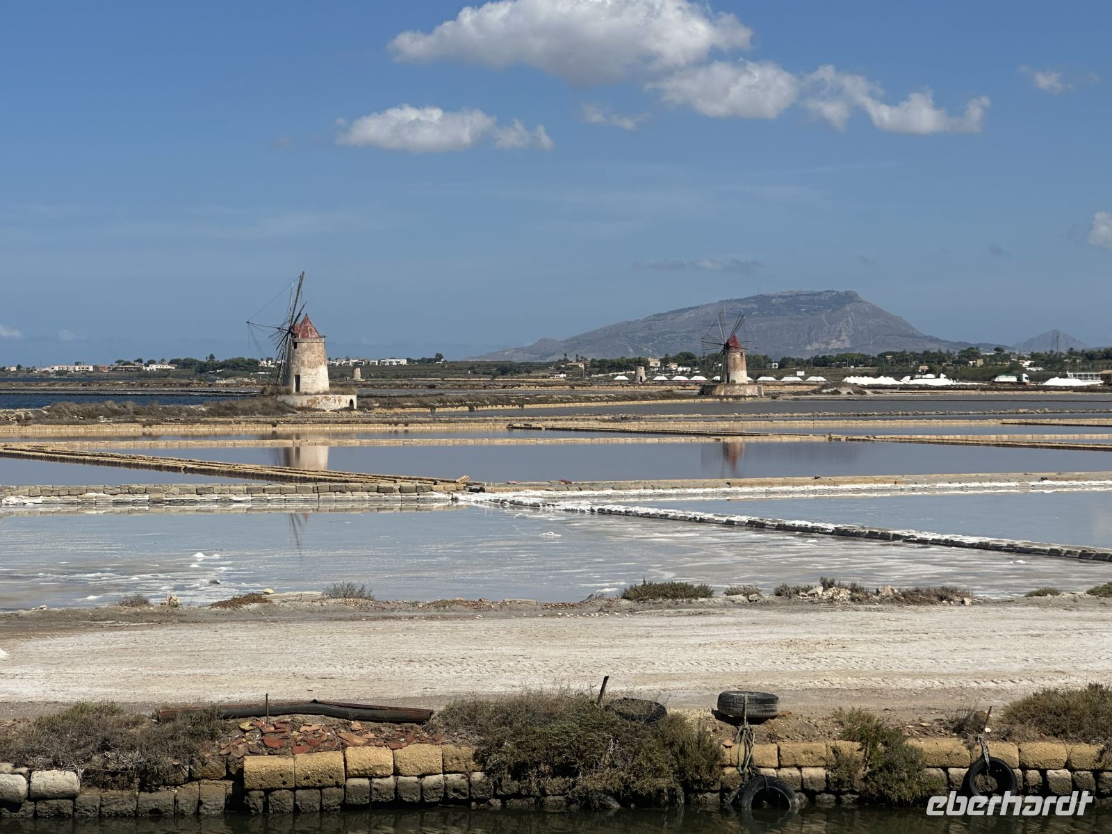 Nach dem Frühstück geht es los zu den Ausgrabungen von Selinunte . Wir sehen die Ausgrabungen von nicht weniger als acht griechischen Tempel und riesige Steine, die uns ihre Geschichte erzählen. Es handelt sich hier um die größte archäologische zusammenhängende Stätte Europas. Alles ist absolut faszinierend! Danach fahren wir an der Salzstraße an der Küste entlang und sehen mehrere Salinen. Der Blick zu den Windmühlen und Salinenfeldern ist wunderschön.
