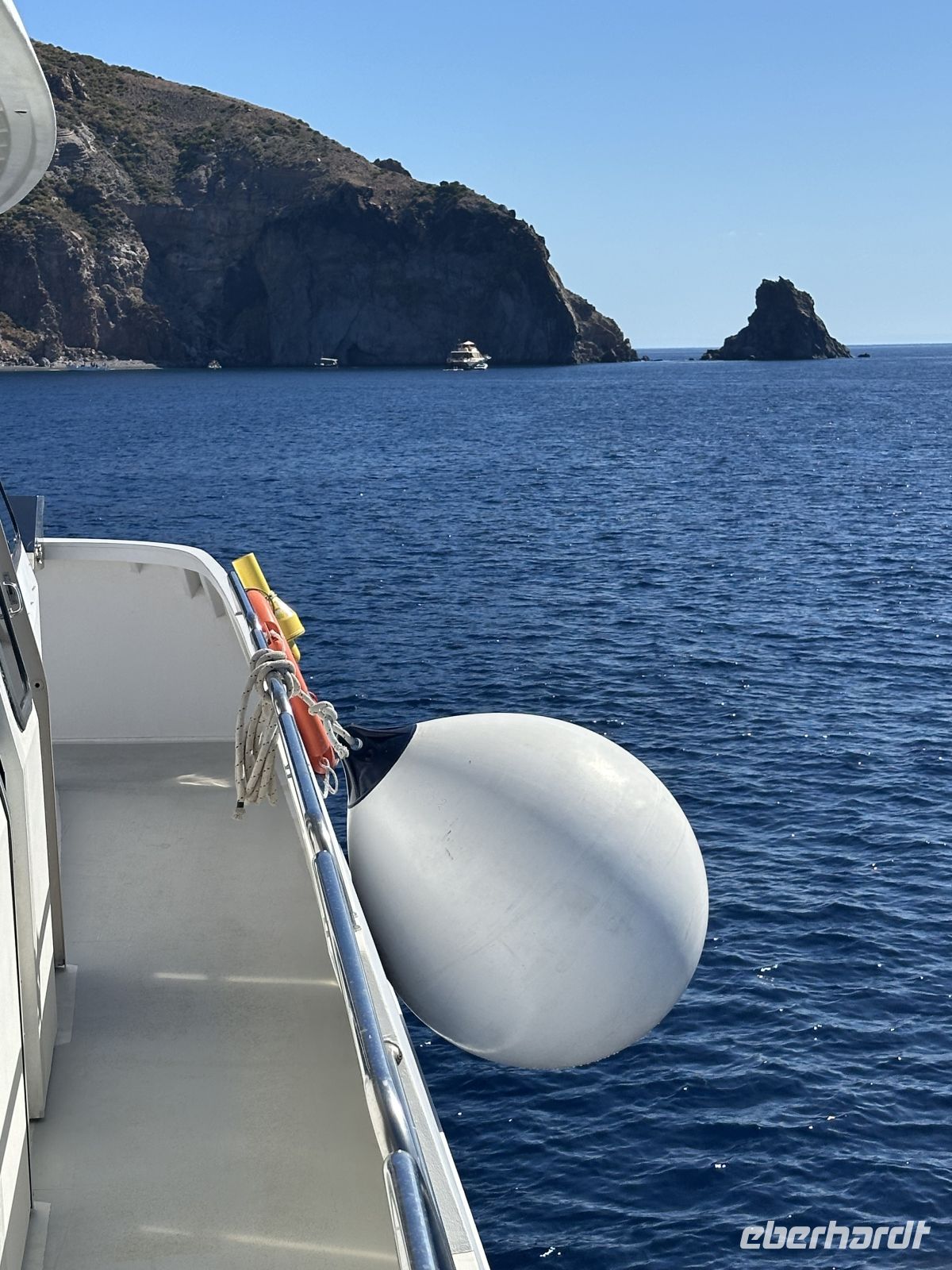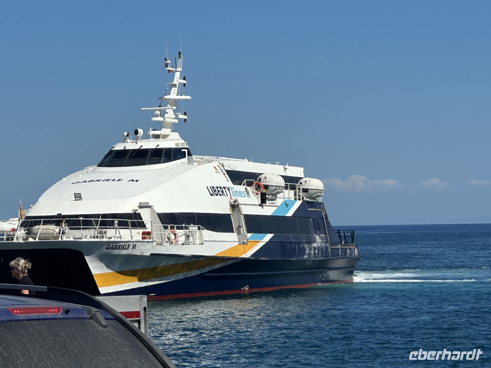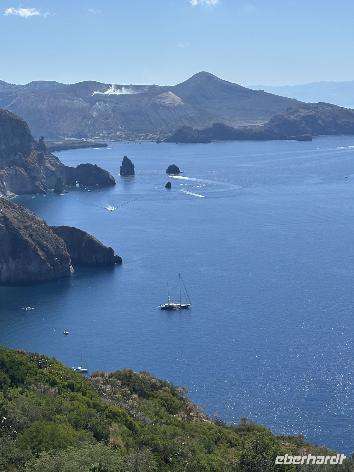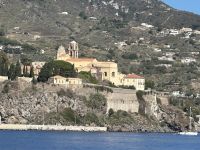 Das Meer ruft, heute erobern wir per Schiff die liparischen Inseln. Zuerst fahren wir mit dem Schiff an einer normannischen Festung am Hafen von Milazzo vorbei. Wir fahren zunächst an der Insel Vulcano vorbei und sehen immer wieder Spalten, aus denen Vulkangase entweichen. Die Schifffahrt dort ungefähr 1 Stunde, wir lassen uns den Wind um die Ohren wehen.Unser erster Halt ist auf der Insel Lipari. Dort erwartet uns ein Kleinbus, welcher uns rund um die Insel mit einem Fotostopp fährt. Wir genießen beeindruckende Aussichten und bewundern Flora und Fauna der Insel. Vom höchsten Aussichtspunkt der Insel haben wir eine weite Sicht auf andere Inseln. Wir erfahren, dass hier viele Filme gedreht wurden . Hier können wir Kapern probieren und kaufen.
