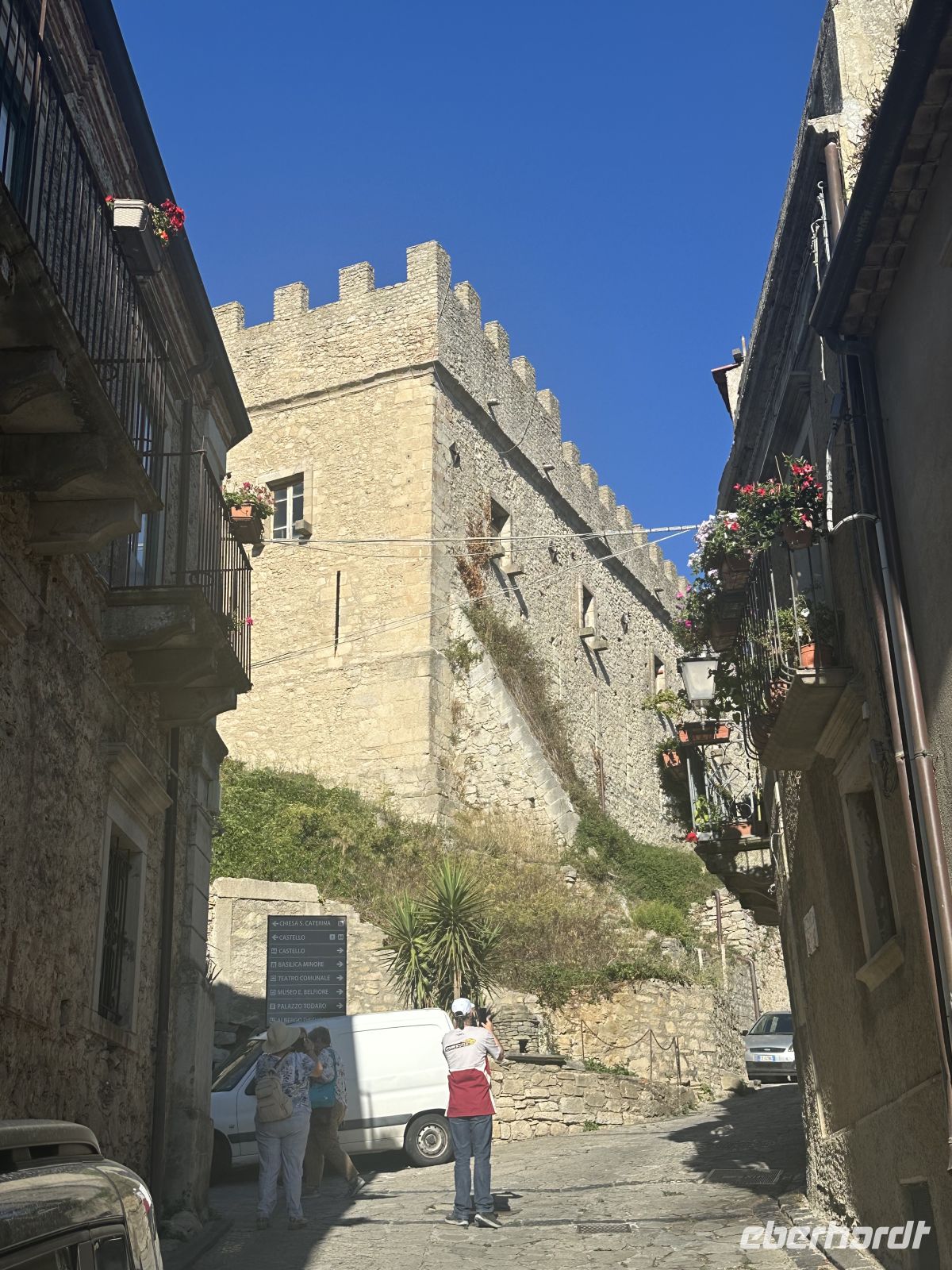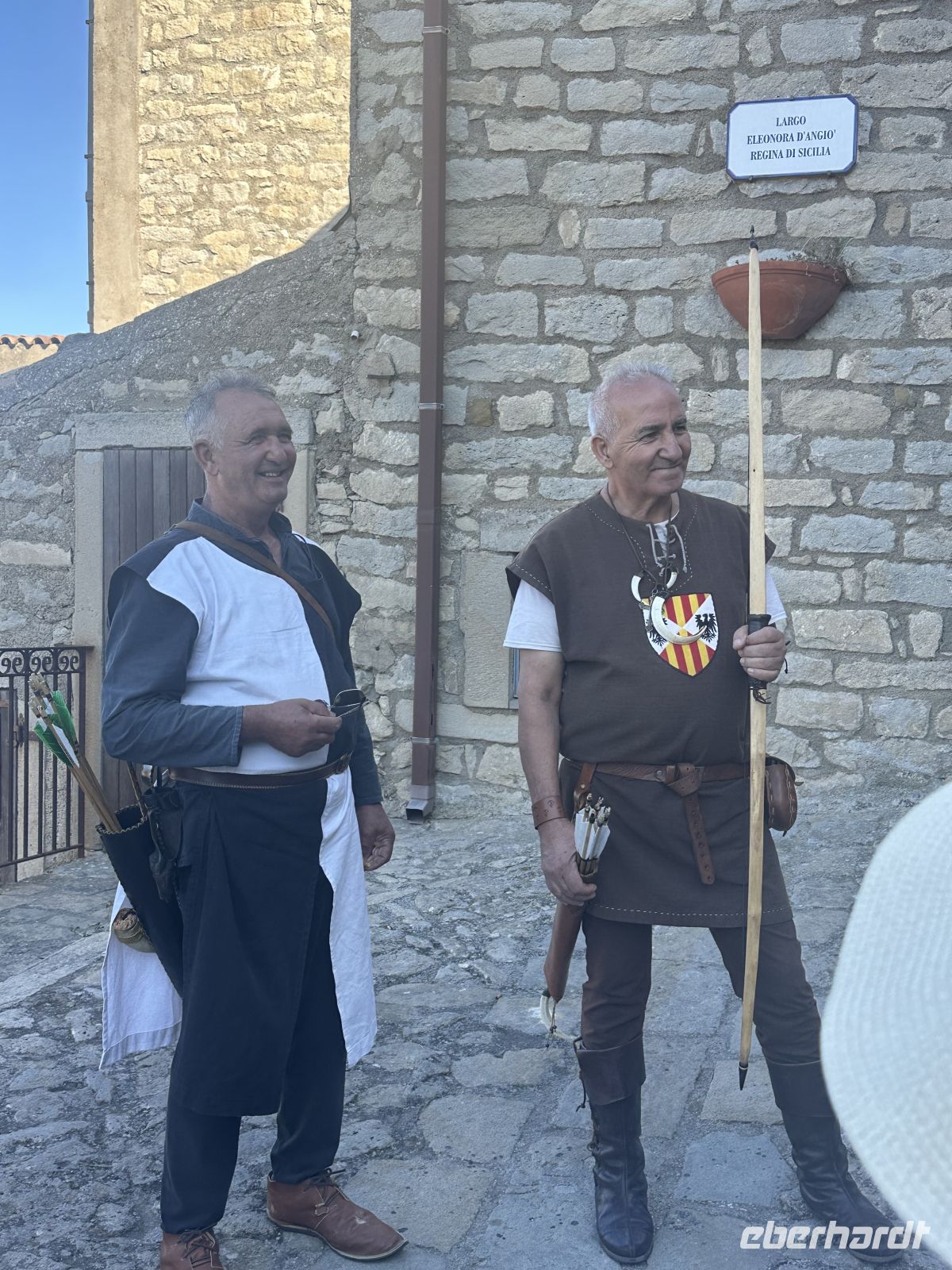 Heute durften wir etwas länger schlafen und sind um 9:00 Uhr ins Nebrodigebirge gestartet. Unser erster Stopp ist im Örtchen Montalbano Elicona. Es liegt in 900 m Höhe und wurde ebenfalls als schönstes Dorf in Italien ausgezeichnet. Blickfang des Dorfes ist das mittelalterliche Kastell. Der Hohen Staufer Friedrich II ist hier allgegenwärtig, er schenkte das Dorf seiner ersten Frau als Mitgift . Im Dorf fand gerade ein Bogen Schieß- Wettbewerb statt , wir konnten die Einwohner in prächtigen Kostümen bewundern. Die Fahrt führte uns weiter durch das Nebrodigebirge durch schöne Haselnuss Wälder. Auf der Hochebene von Argimusco hielten wir an und besichtigten gigantische Megalithen , sie sind wahrscheinlich durch Wind und Regen entstanden.