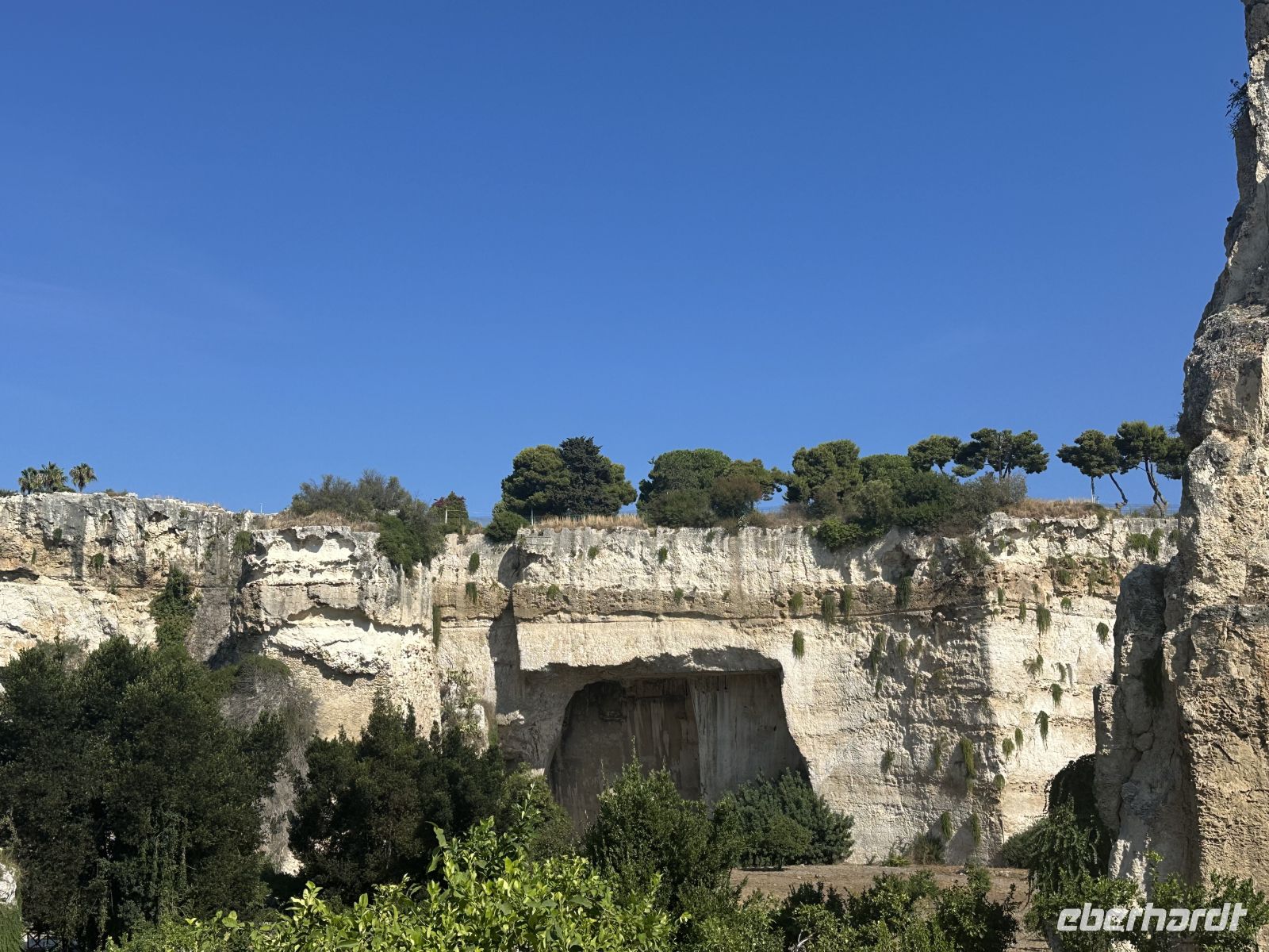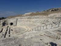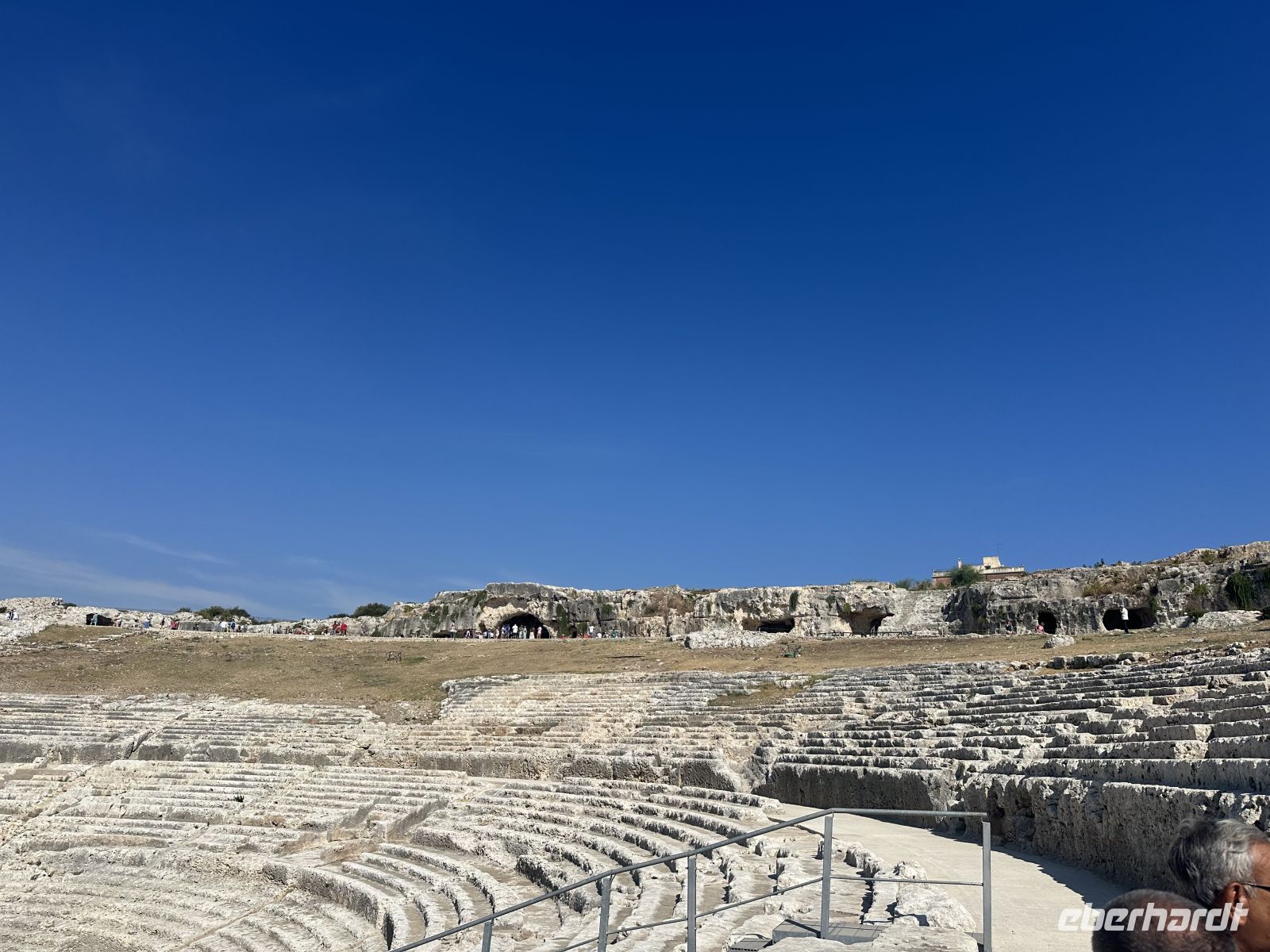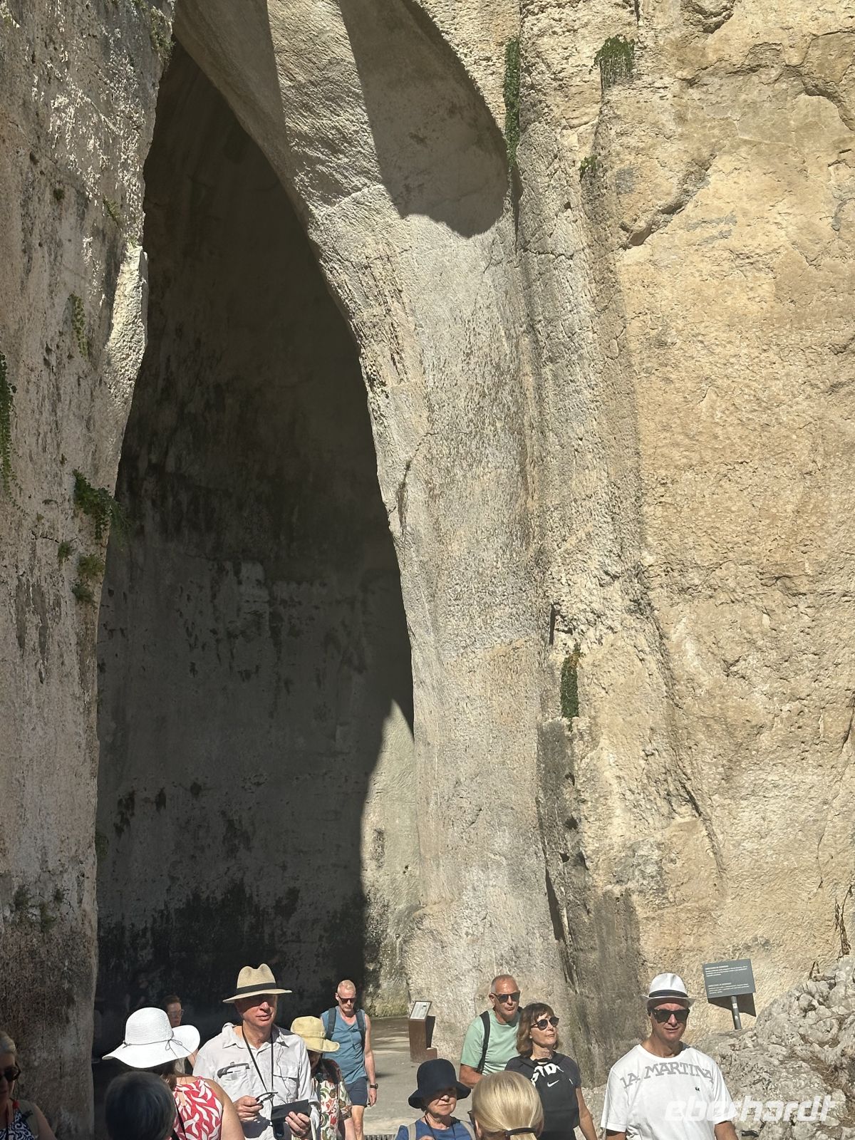 Heute führt uns ein fakultativer Ganztages Ausflug nach Syrakus. Syrakus war eins die größte griechische Stadt außerhalb Griechenlands. Bei wiederum wundervollen Wetter besichtigen wir zunächst die archäologische Zone, sehen die Latomie del Paradiso , den Steinbruch und den Opfer Altar des Hieron . Besonders beeindruckt uns die 23 m hohe Grotte Ohr des Dionysios , die aus dem Kalksteinfelsen herausgehauen wurde und in der eine beeindruckende Akustik herrscht. Ein weiteres Highlight ist das gut erhaltene römische Amphitheater, das ursprünglich 15.000 Sitzplätze hatte. Anschließend fährt uns der Bus zur Altstadt. Wir unternehmen gemeinsam einen Rundgang und sehen den Dom, die Arethusa-Quelle und den Hafen. Die Gruppe hat nach Freizeit und stärkt sich bei leckeren, sizilianischen Gerichten.