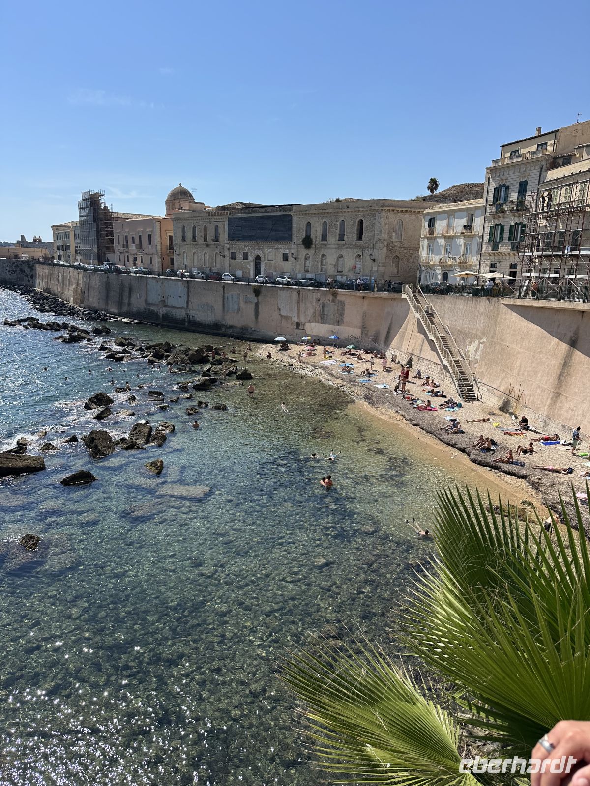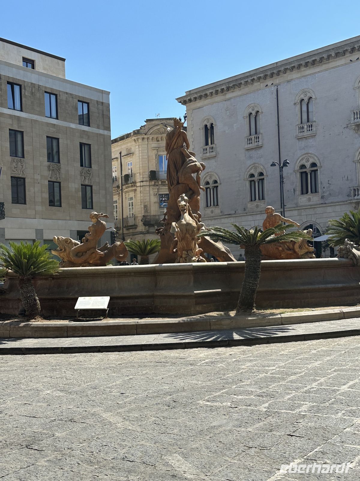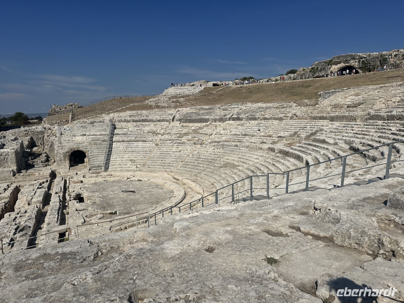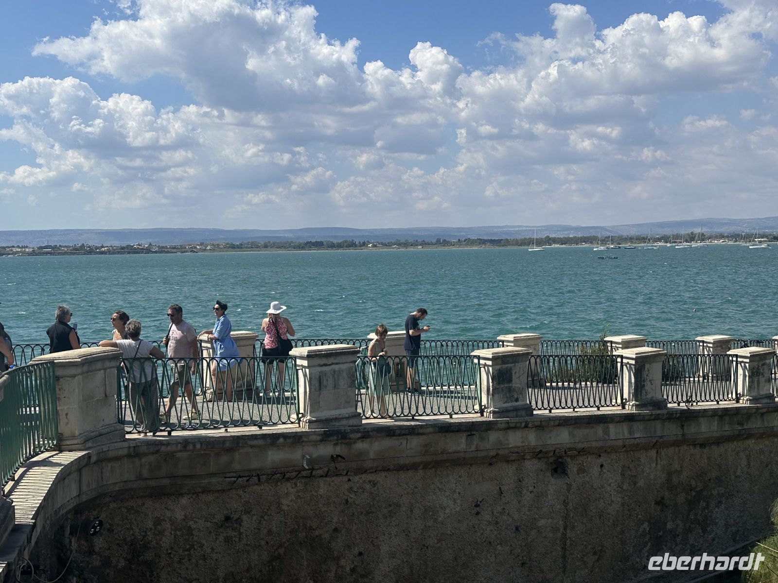 Heute führt uns ein fakultativer Ganztages Ausflug nach Syrakus. Syrakus war eins die größte griechische Stadt außerhalb Griechenlands. Bei wiederum wundervollen Wetter besichtigen wir zunächst die archäologische Zone, sehen die Latomie del Paradiso , den Steinbruch und den Opfer Altar des Hieron . Besonders beeindruckt uns die 23 m hohe Grotte Ohr des Dionysios , die aus dem Kalksteinfelsen herausgehauen wurde und in der eine beeindruckende Akustik herrscht. Ein weiteres Highlight ist das gut erhaltene römische Amphitheater, das ursprünglich 15.000 Sitzplätze hatte. Anschließend fährt uns der Bus zur Altstadt. Wir unternehmen gemeinsam einen Rundgang und sehen den Dom, die Arethusa-Quelle und den Hafen. Die Gruppe hat nach Freizeit und stärkt sich bei leckeren, sizilianischen Gerichten.