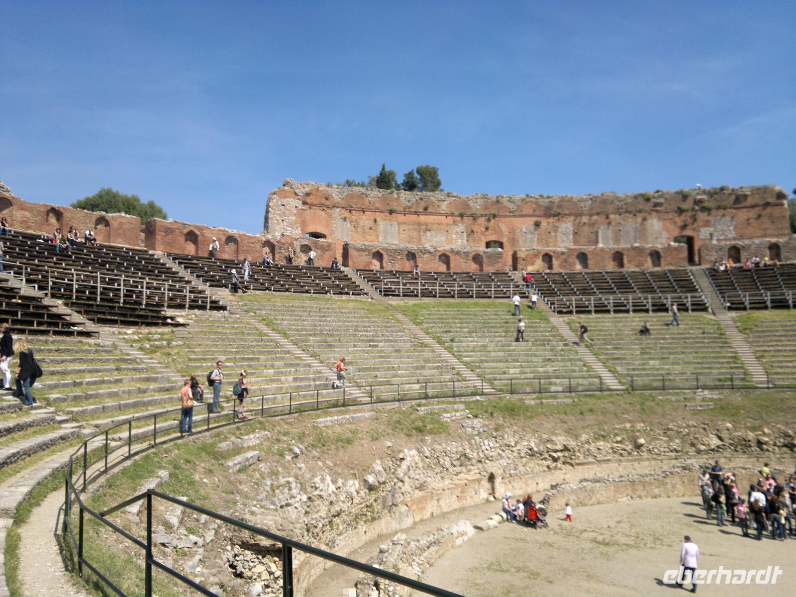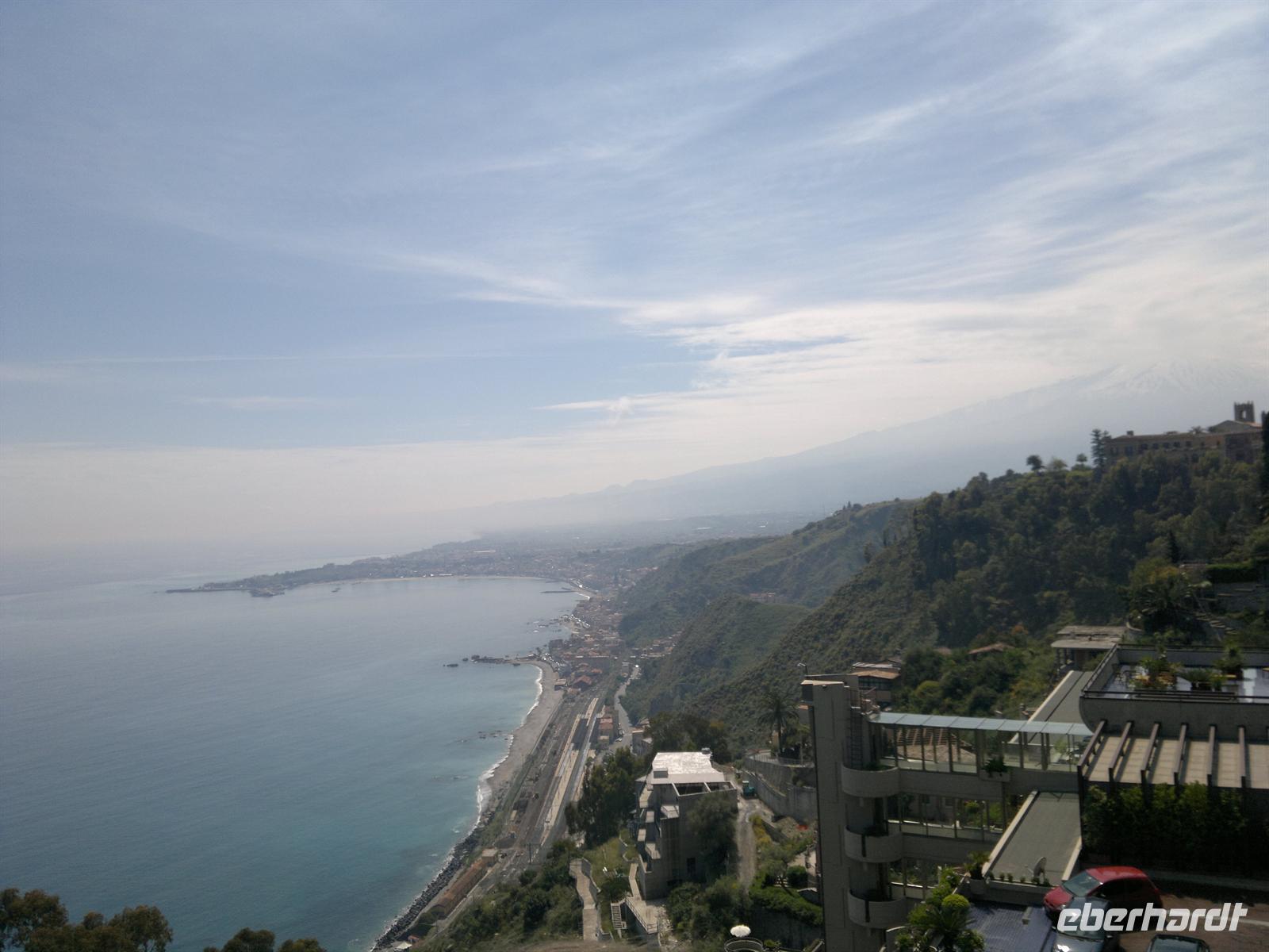 Am Nachmittag fahren wir zur schönsten Theaterkulisse der Welt - nach Taormina. In Taormina bummeln wir zunächst in den verwinkelten und schmalen Gassen und lassen uns von der Schönheit dieses typisch italienischen Städtchens beeindrucken. Man merkt, dass Taormina ein exklusiverer Ort ist. Sehr sauber, viele kleine Boutiquen, angesagte Modegeschäfte. Im botanischen Garten der Villa Comunale hätte man sicherlich noch länger verweilen und den Artenreichtum bewundern können. Das beeindruckende Teatro Greco ist zweifelsfrei das bedeutendste Bauwerk Taorminas. Über etliche Stufen erreicht man diese tolle Theaterkulisse. Anders, als der Name vermuten lässt, stammt das Theater keineswegs aus griechischer Zeit. Mit Platz für über 5000 Zuschauer war es nach Syrakus das zweitgrößte antike Theater Siziliens. Von den oberen, in den Fels geschlagenen Stufen fasziniert ein einzigartiger Rundblick über das Meer, die Küste und (bei klarer Sicht) auf den Ätna.