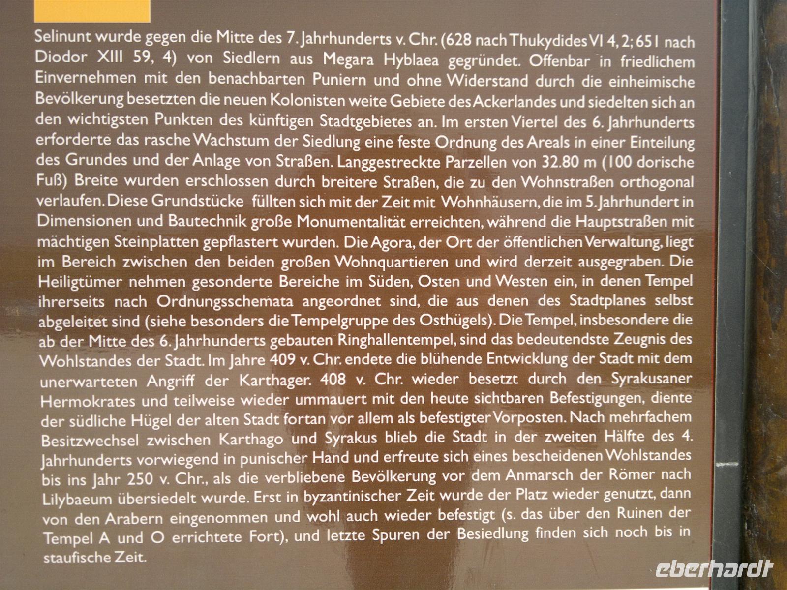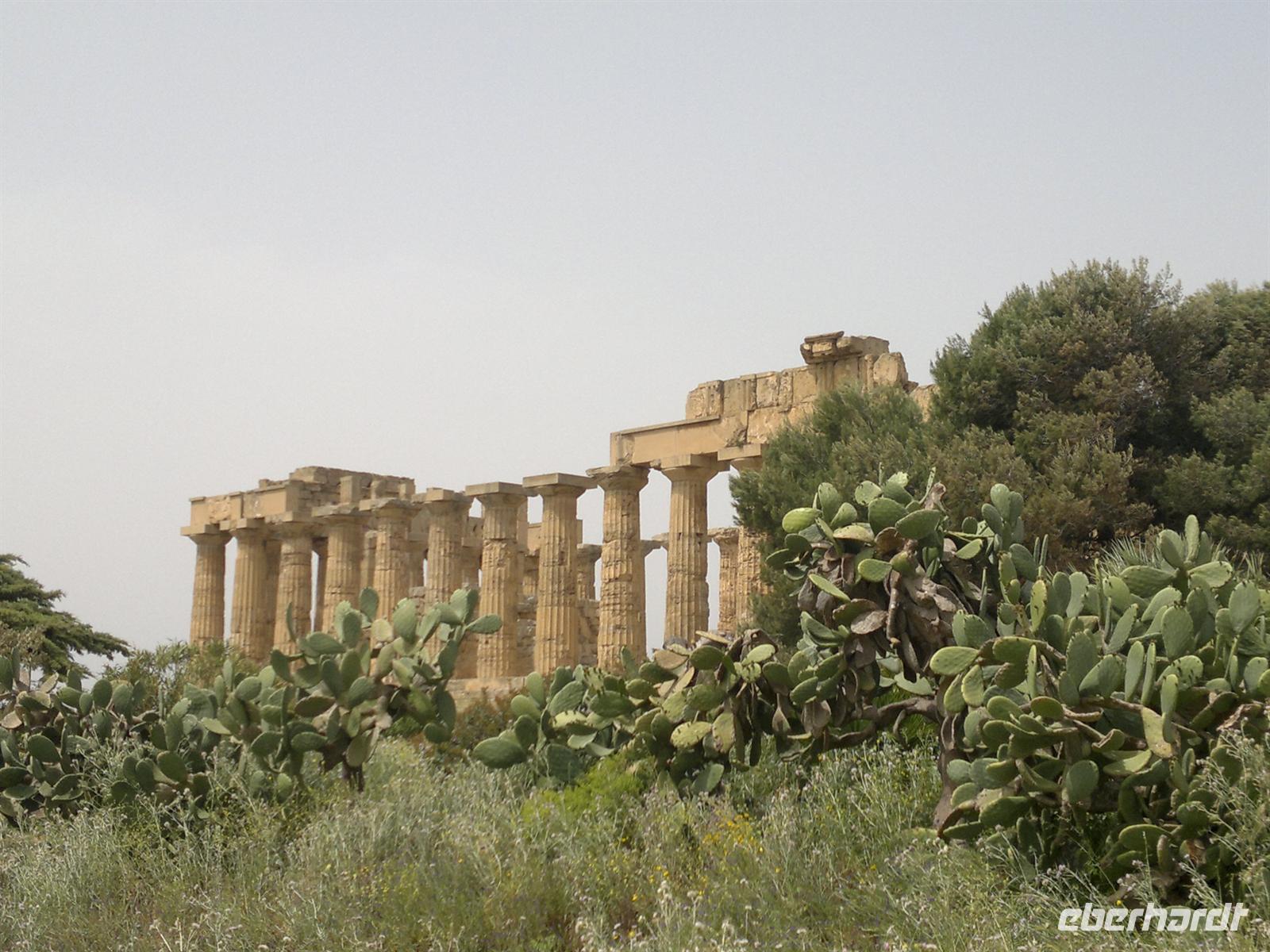 Gut gestärkt setzen wir unsere Besichtigung fort uns erreichen nach nur wenigen Minuten die Stadt Selinunte. Noch heute wächst hier der wilde Sellerie (griech. selinon), der der Stadt ihren Namen gab. Wir erreichen zunächst ein antikes Trümmerfeld, aus dem sich die mächtigen Säulen des Tempels E (Hera-Tempel) erheben. Eines der größten Bauvorhaben der griechischen Antike war der Apollon-Tempel (Tempel G), heute ein riesiger, eindrucksvoller Trümmerhaufen.