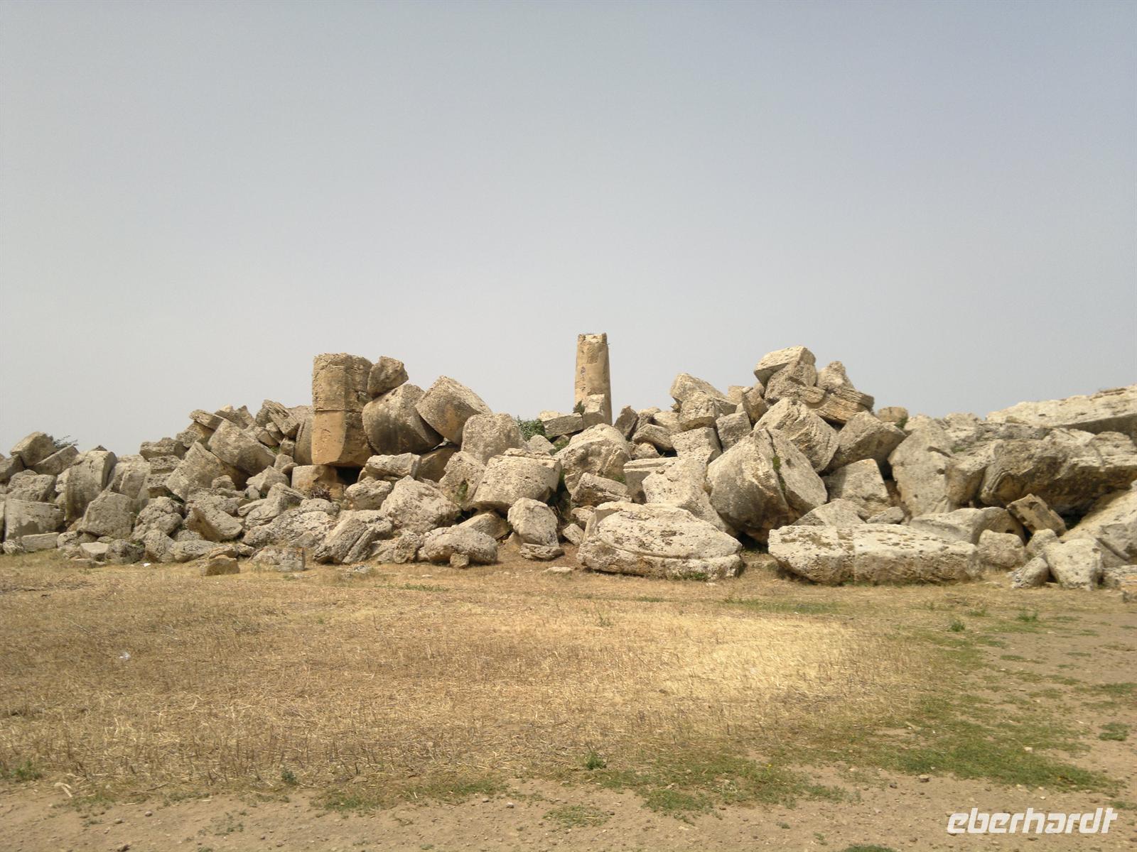 Jenseits der Via die Templi erreichen wir die gewaltigen Trümmer des Zeus-Tempels. Mit seinen riesigen Ausmaßen war er einst der größte dorische Tempel, errichtet mit Hilfe von 25.000 karthagischen Kriegsgefangenen.