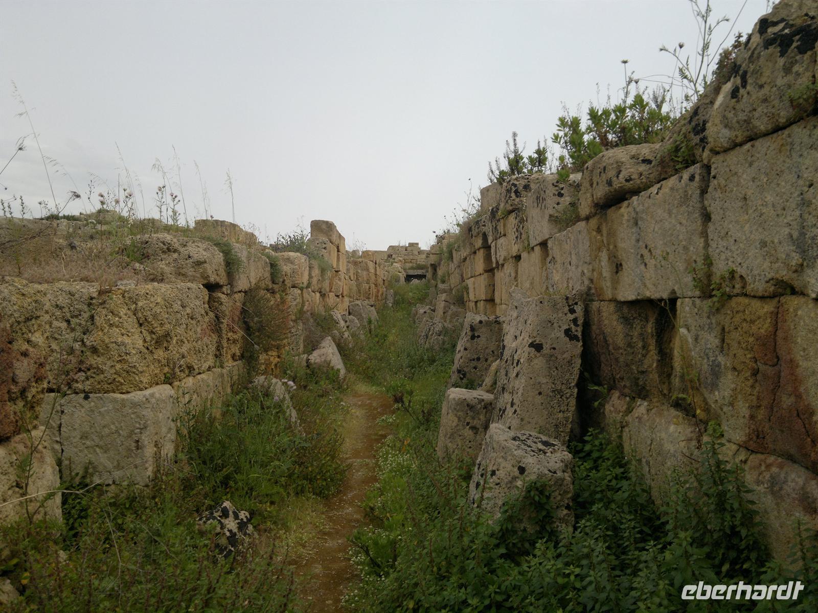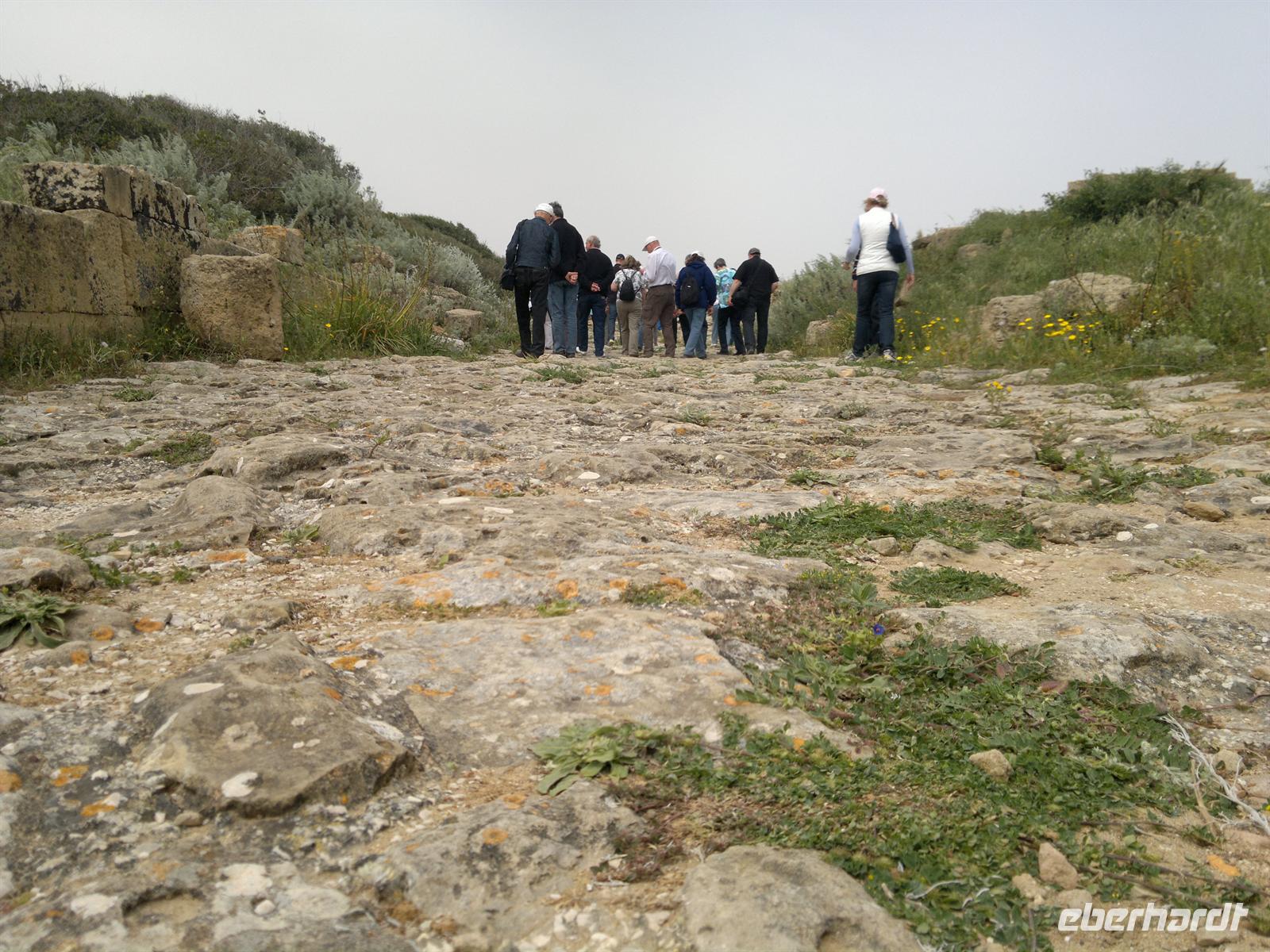 Über die Strada die Templi gelangen wir nun zum Eingang der Antiken Stadt mit der Akropolis. Noch immer duftet der Rosmarin und ein Blütenmeer gibt den alten Steinen eine mächtige Kulisse. Wir machen einen Spaziergang in der beeindruckenden Stadt und Alberto erzählt uns viel Wissenswertes über die Ausgrabungsstätte.