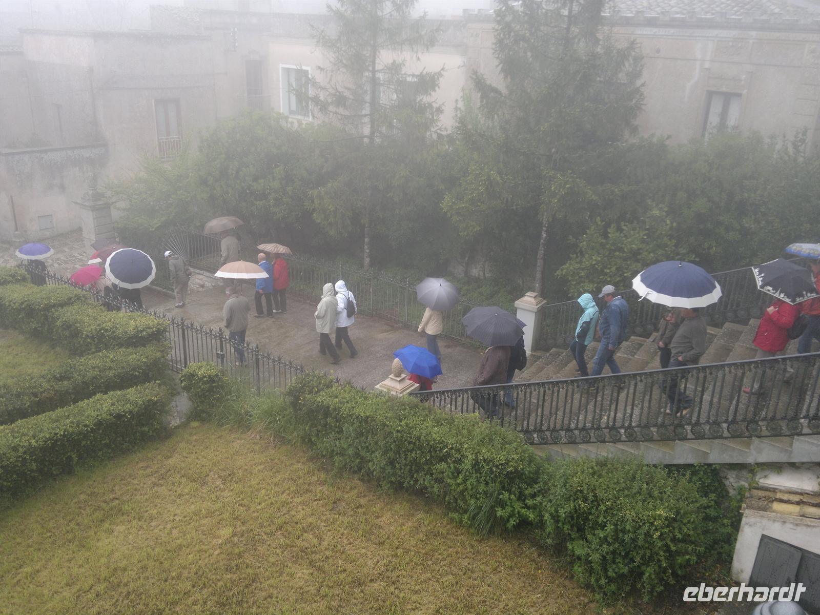 Pasquale lenkt den Bus sicher durch die engen Straßen und schließlich erreichen wir den Agriturismo „Bergi", wo wir bereits von zwei sizilianischen Musikanten herzlich begrüßt werden. Familie Pietschmann lässt es sich nicht nehmen, einen kleinen Tanz zu starten