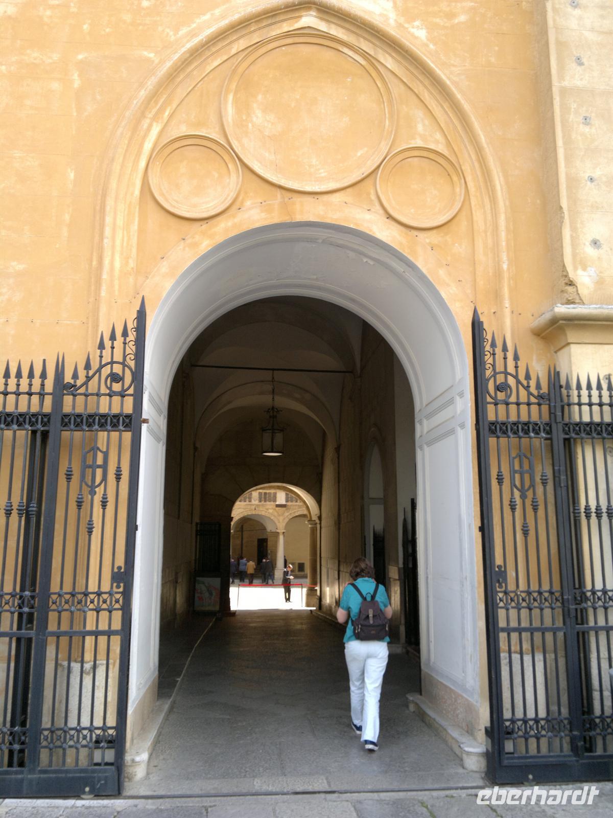 Der größte Teil der Gruppe entschied sich, den fakultativen Ausflug nach Palermo und nach Monreale zu unternehmen. Bereut hat es keiner. Schon kurz vor den Toren der Metropole im Norden Siziliens merken wir, dass es sich um eine turbulente, aufregende Stadt handelt. Ganz im Gegenteil zu den bisher besichtigten sizilianischen Orten. Großstadtflair, Verkehrschaos, viele Menschen - das ist Palermo! Zunächst kämpfen wir uns durch die engen Straßen Palermos und brauchen viel Geduld, um zum Königspalast zu kommen. Wir besichtigen die Capella Palatina und sind von den grandiosen Mosaikwerken begeistert. Jeder fragt sich, wie man solche Kunstwerke zu damaliger Zeit schaffen konnte. Ein Kleinod arabisch-normannischer Kunst! Wir spazieren durch die Porta Nouva und erreichen die Altstadt. Hier an der Piazza Cattedrale erhebt sich der monumentalste Sakralbau der Stadt, die Cattedrale Maria Santissima Assunta. Der Innenraum der Kathedrale ist schlicht und einfach. Hauptanziehungspunkt sind zwei Kapellen, die als Grablege des normannisch-staufischen Königshauses dienen.