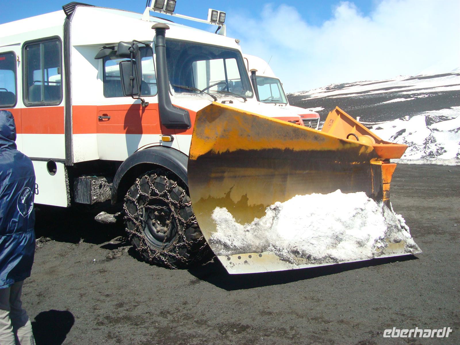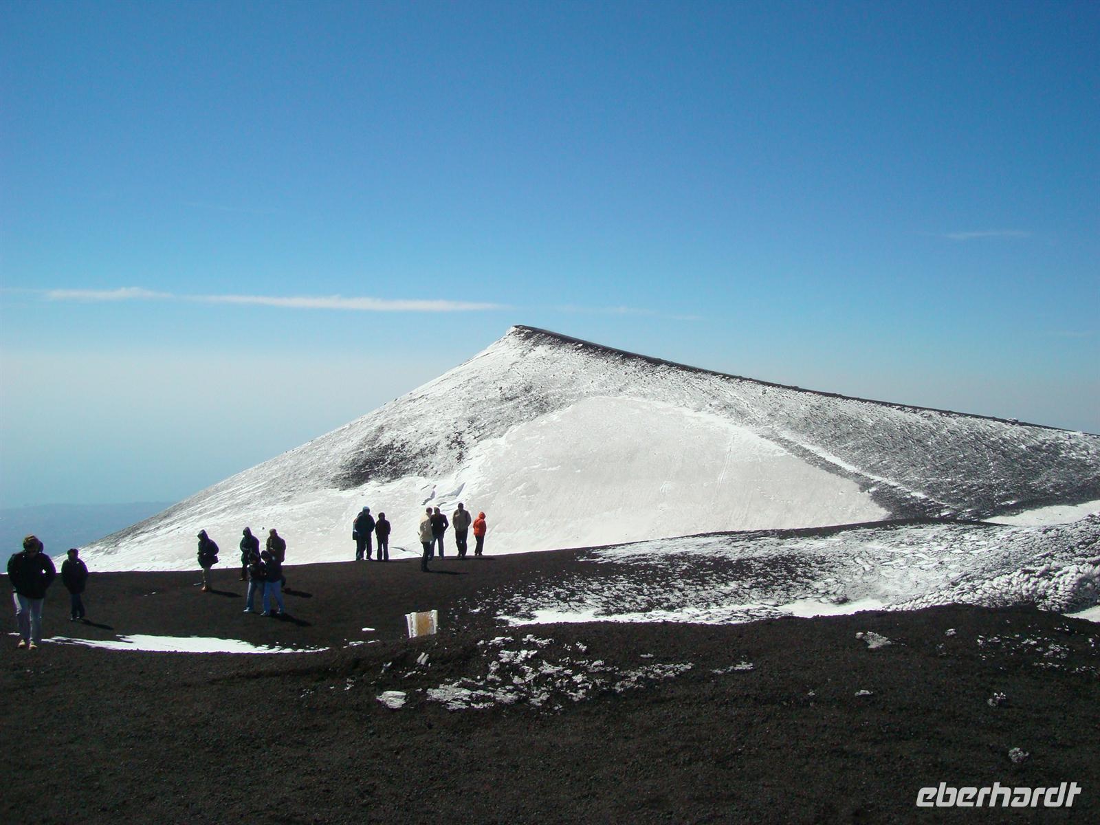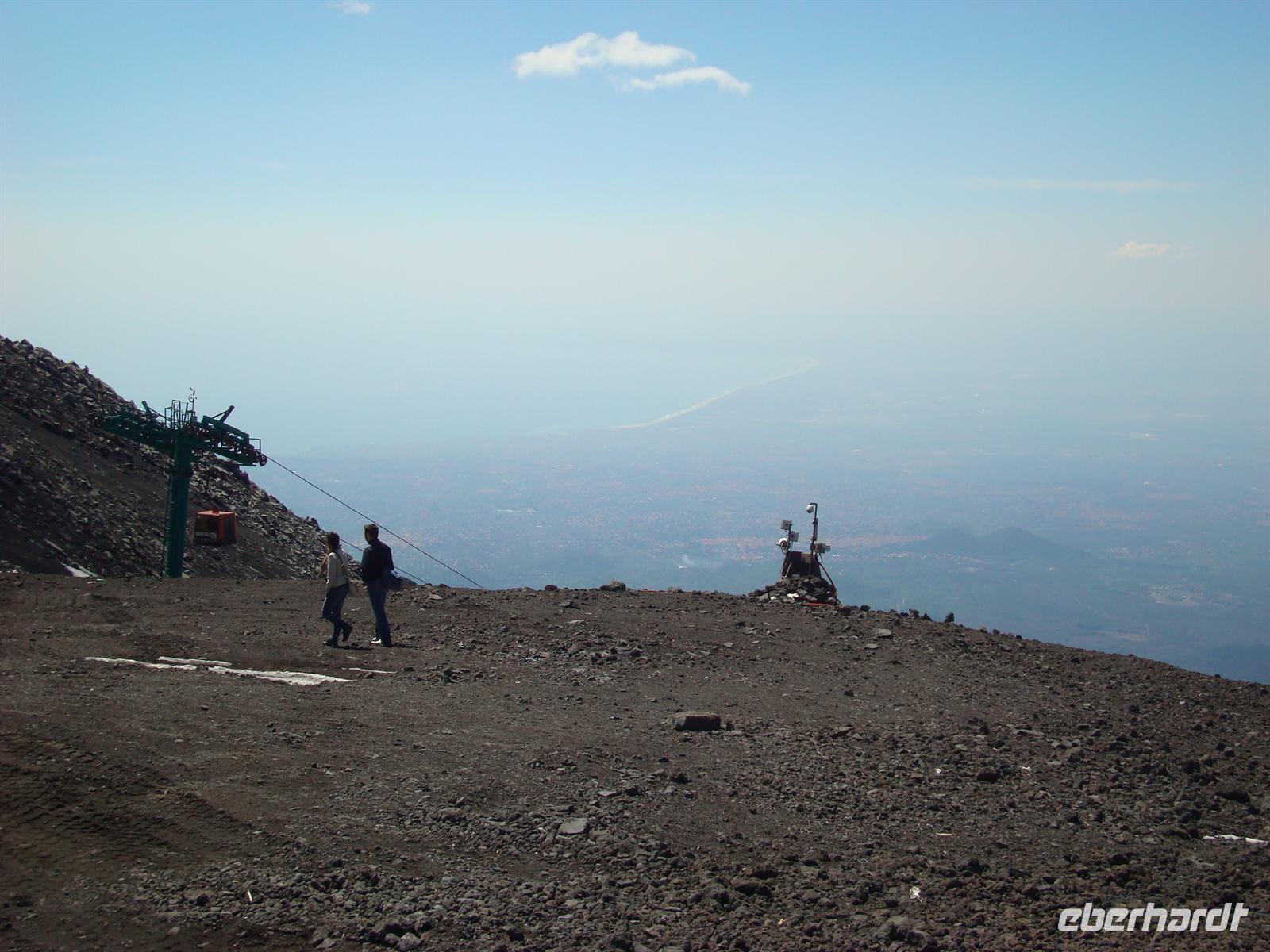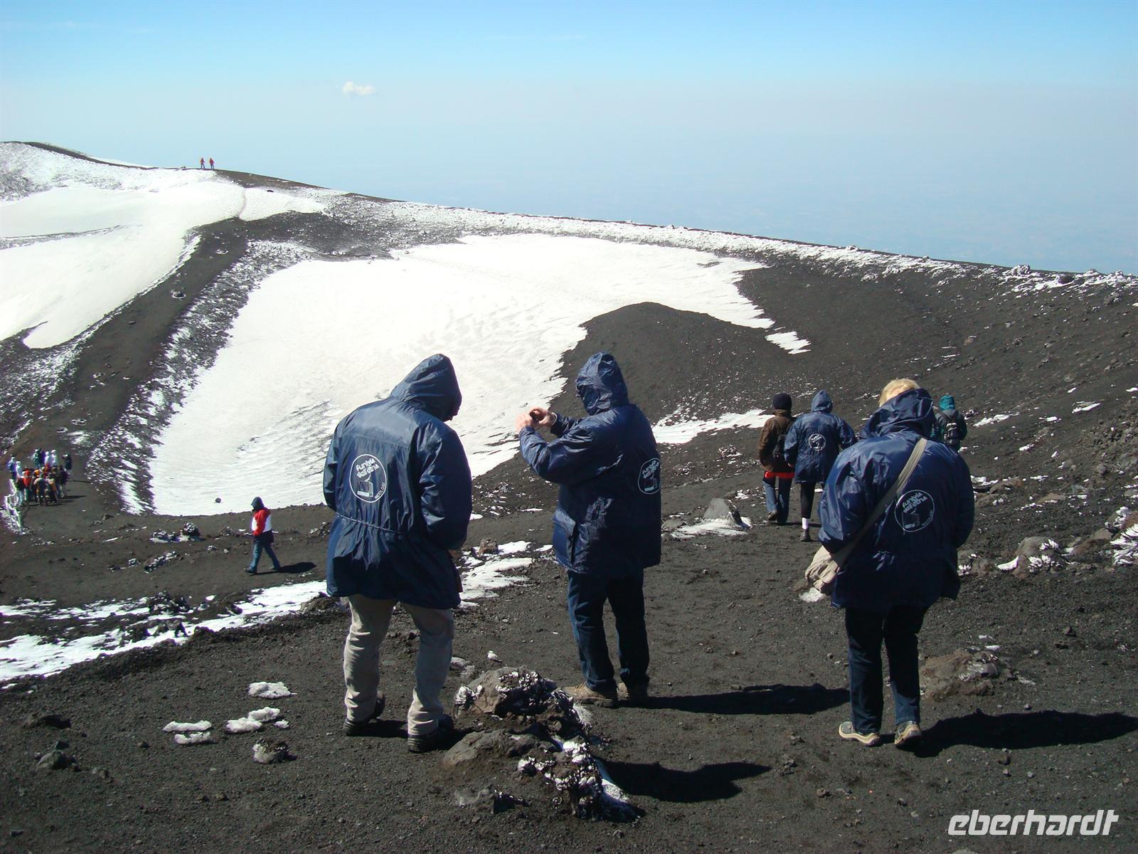 Beste Wettervoraussetzungen für den Ätna :-) Auf zum größten Vulkan Europas, 3.323 Meter! Mit dem Bus fahren wir zunächst zur Seilbahnstation auf 1.910 m Höhe. Die Luft wird dünner und einige Gäste merkten das sofort. Nun musste man sich entscheiden: Entweder fährt man mit der Seilbahn bis zur Bergstation und erkundet die karge Mondlandschaft auf eigene Faust oder man fährt mit speziellen Jeeps bis zum Hauptkrater. Die meisten wollten natürlich bis nach oben zum Filosofo auf 2.917 m, wenn schon denn schon .