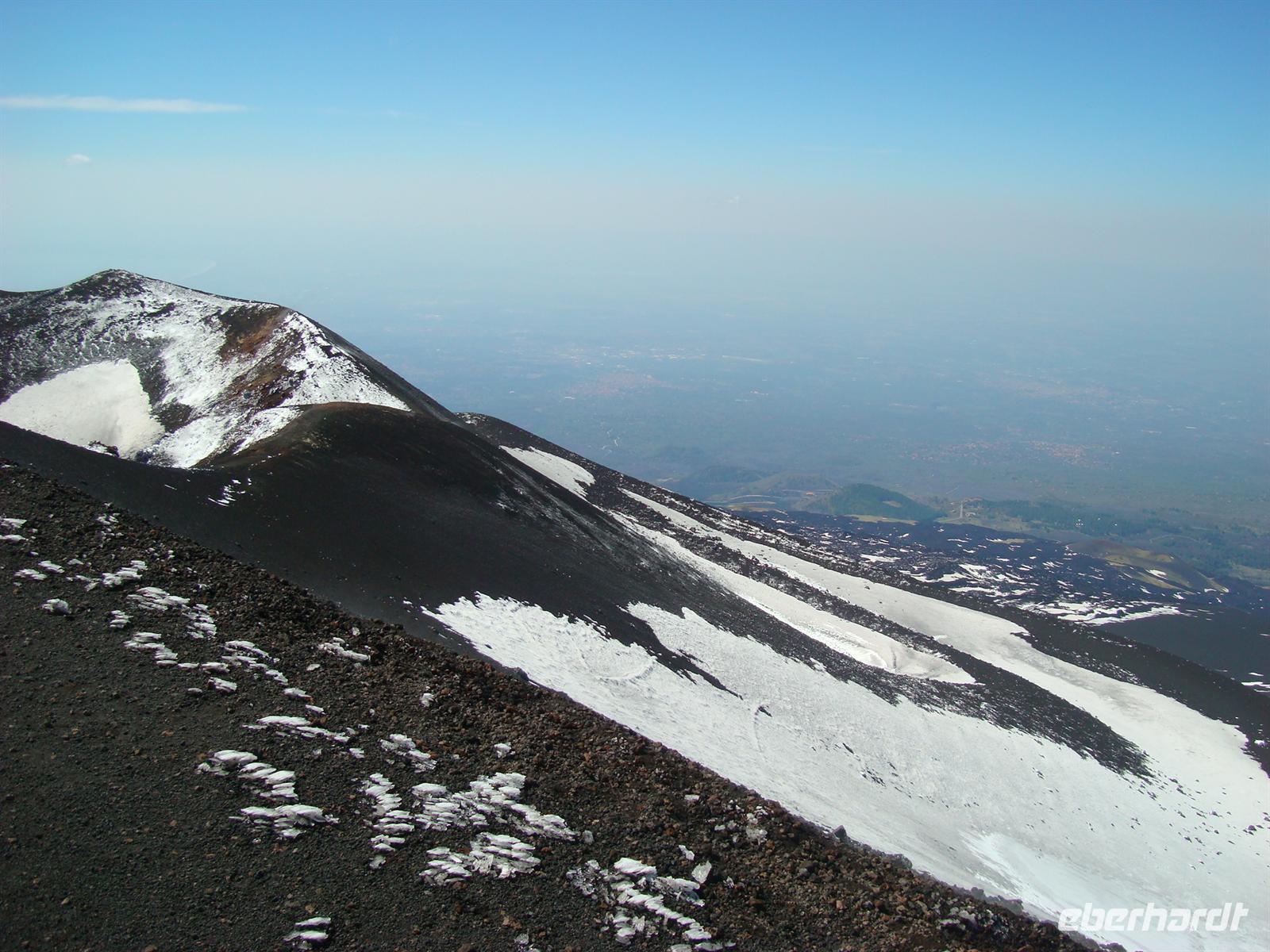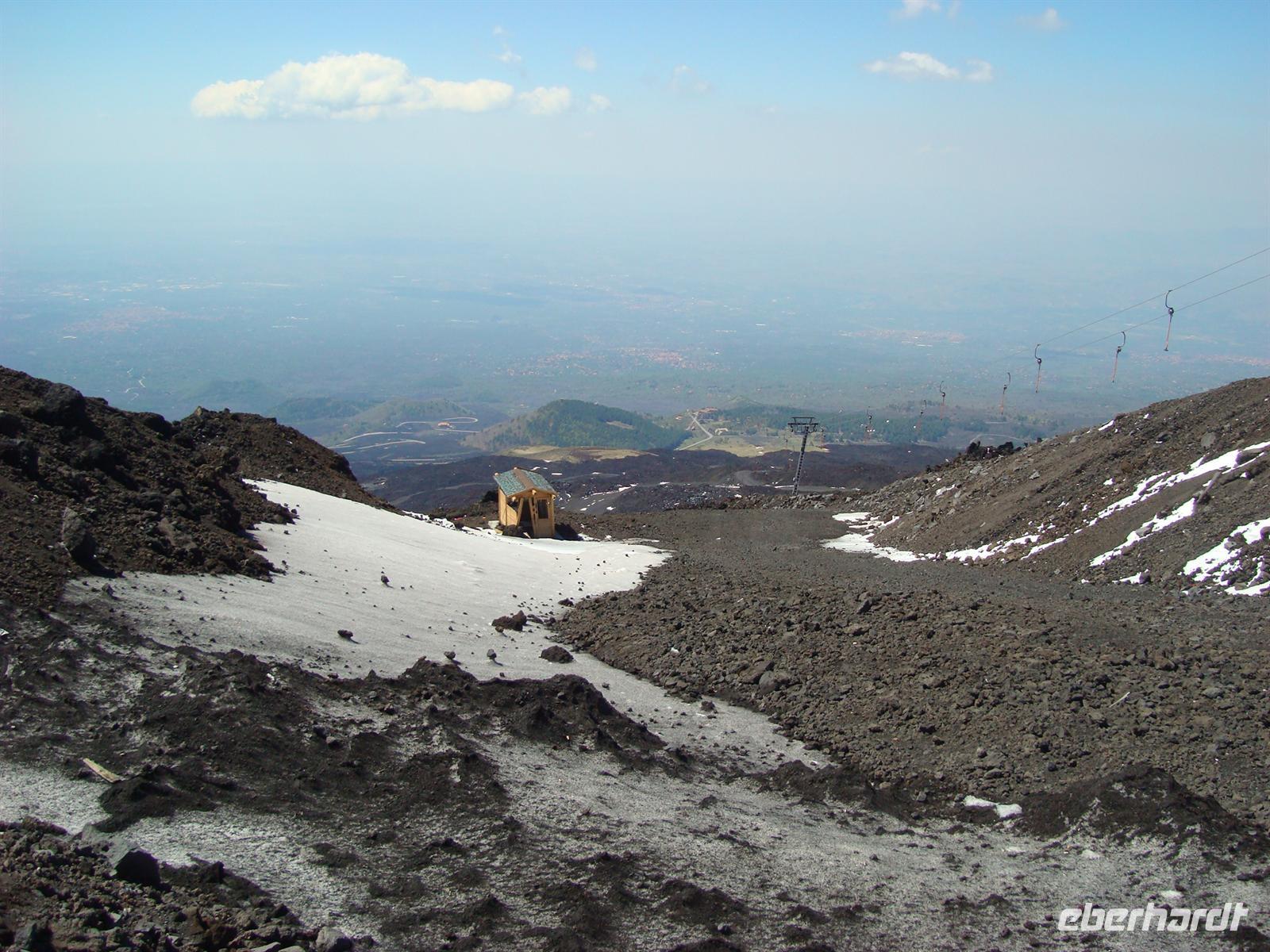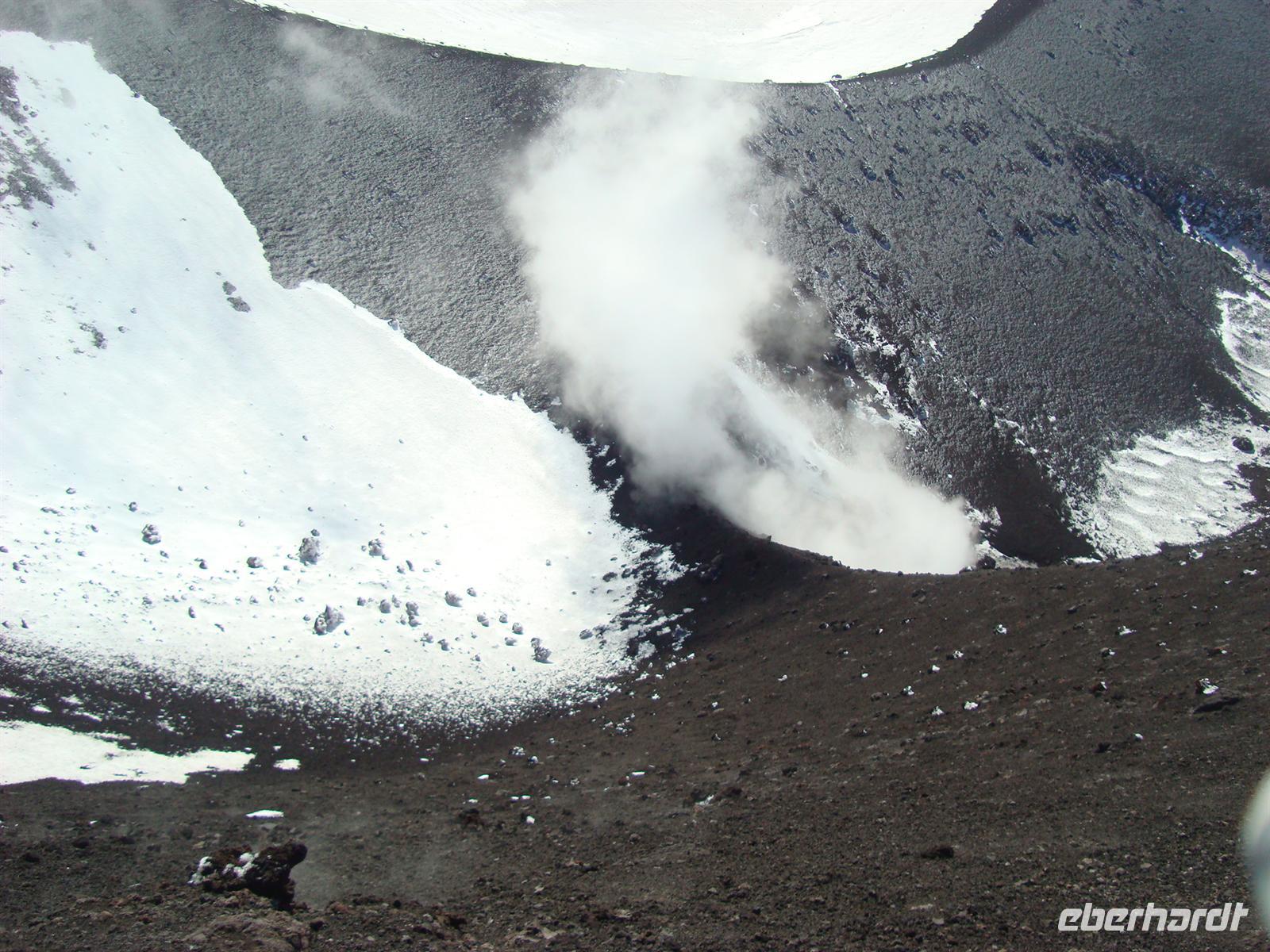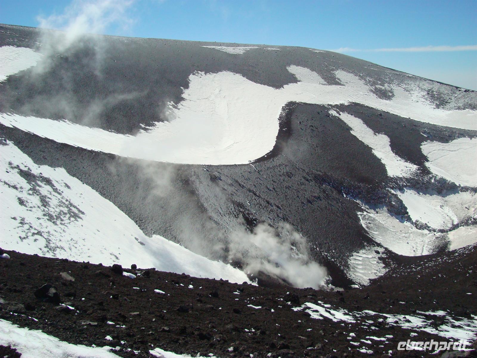Beste Wettervoraussetzungen für den Ätna :-) Auf zum größten Vulkan Europas, 3.323 Meter! Mit dem Bus fahren wir zunächst zur Seilbahnstation auf 1.910 m Höhe. Die Luft wird dünner und einige Gäste merkten das sofort. Nun musste man sich entscheiden: Entweder fährt man mit der Seilbahn bis zur Bergstation und erkundet die karge Mondlandschaft auf eigene Faust oder man fährt mit speziellen Jeeps bis zum Hauptkrater. Die meisten wollten natürlich bis nach oben zum Filosofo auf 2.917 m, wenn schon denn schon .