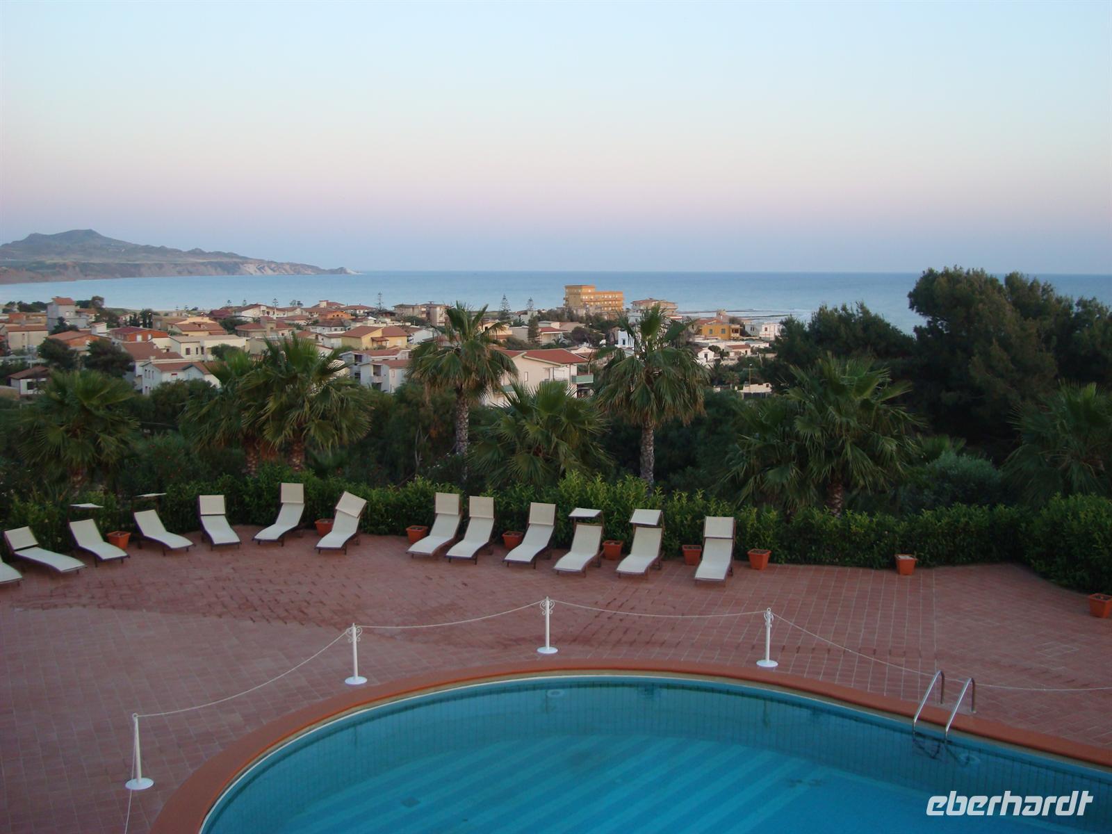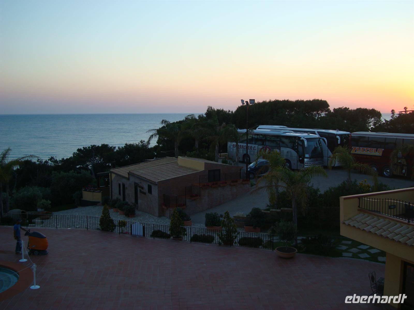 Der starke Wind machte uns zu schaffen, aber wir blieben stark und erkundeten die Umgebung. Ein tolles Erlebnis, was keiner so schnell vergessen wird! Treffpunkt für alle war 13 Uhr am Bus. Alberto und Pasquale haben für unsere Gäste ein wunderschönes Picknick organisiert. Es gab reichlich, Wein, Brot, Käse, Tomaten, Oliven und natürlich auch ein Verdauungsschnaps zum Schluss. Das war eine sehr gute Idee von den Beiden und hat uns sehr gut gefallen! Gut angeheitert von dem guten Wein fuhren wir zur Villa Romana. Sie ist eine römische Luxusvilla mit vielen Mosaiken und außergewöhnlichen Motiven. Leider ist zur Zeit wegen Restaurierungsarbeiten nur ein Drittel der beeindruckenden Anlage zu besichtigen. Unsere Fahrt führt weiter durch die hügelige Landschaft des Inselinneren bis nach Agrigento. Ganz in der Nähe befindet sich unser 4-Sterne-Hotel „Baia di Ulisse" direkt am Meer.