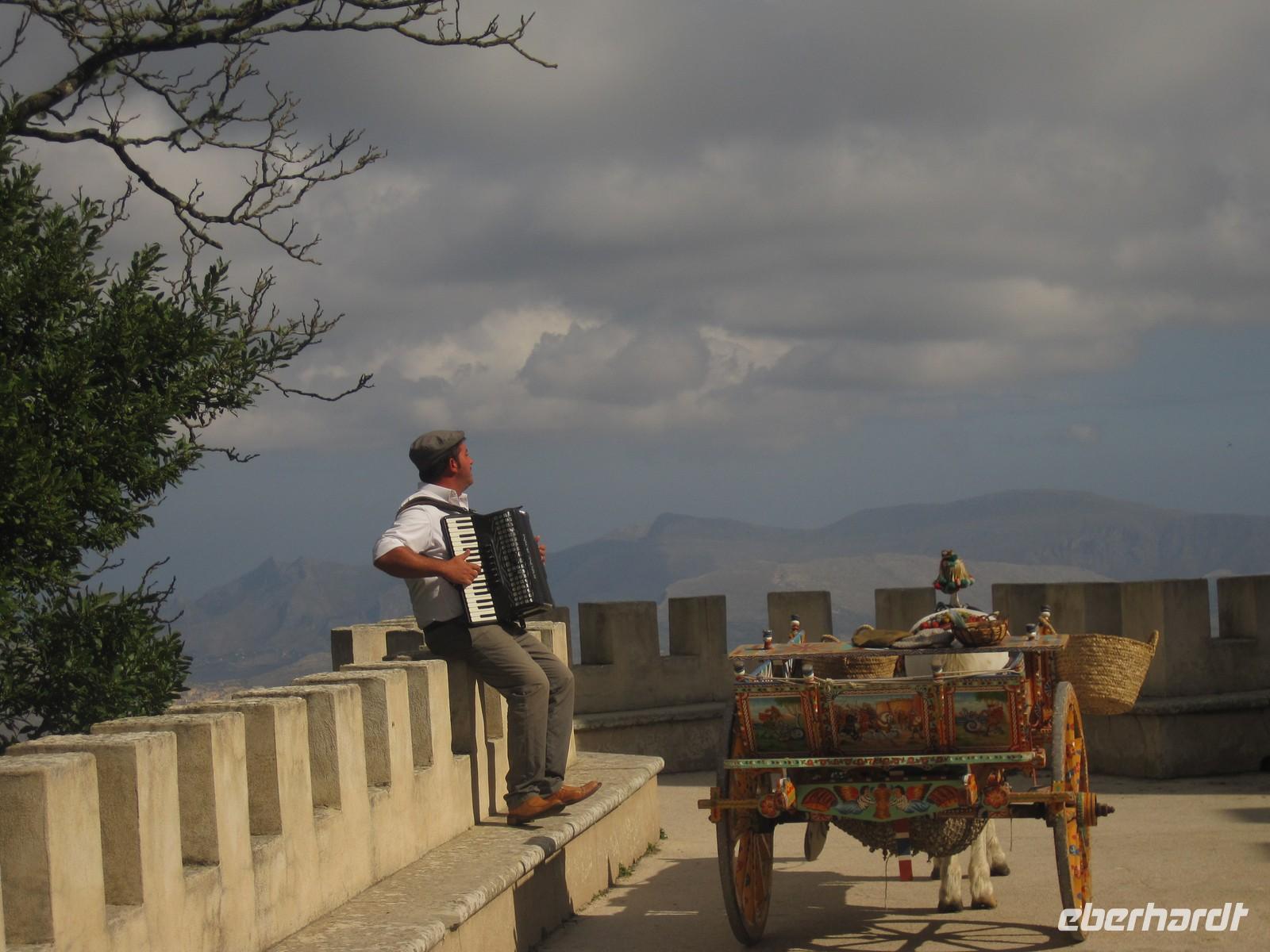 Richtung Venusberg, wo eine kleine Überraschung Auf uns wartete. Empfangen wurden wir von einem singenden Sizilianer, der samt Pferd und Akkordeon allen ein Lächeln auf die Lippen zauberte und dem Einen oder Anderen Eberhardt- Gast ein sanftes Hüftewackeln entlockte. Wer tanzt, hat sich natürlich auch eine Belohnung verdient, welche im Café von Maria di Grammatico bereits auf uns wartete. Bei einer Tasse Kaffee und leckerem Mandelgebäck genießen wir das Ambiente im Wohnzimmer von Maria. Die Serpentinen wieder hinab, machen wir uns auf den Rückweg in Richtung Palermo, wo wir unser letztes Hotel beziehen und den Abend ausklingen lassen.