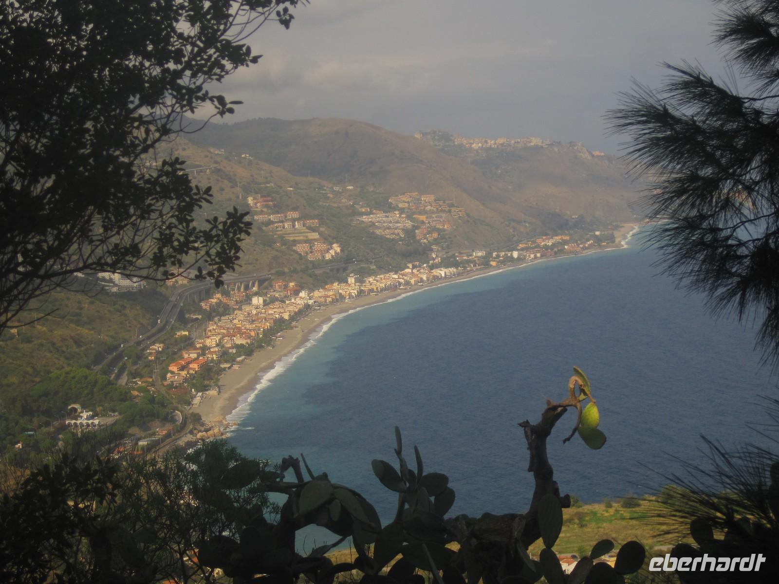 Zusammentreffen mit unserem Busfahrer Pasquale verlief sehr herzlich, so dass unser Urlaub beginnen konnte. Schon auf der kurzen Fahrt nach Giardini Naxos machte uns Mario seine Insel schmackhaft, indem er uns in die kulinarische Küche Siziliens einführte und jeder Lust auf das Abendessen bekam. Naxos ist die erste griechische Kolonie auf Sizilien welche aber wenig später von Syrakus vollständig zerstört wurde. Heute ist Giardini Naxos ein beliebter Badeort mit einer herrlichen Bucht und einer langen Strandpromenade. Unser erster Stopp war eine kleine Bar mit Blick auf das Meer, wo wir bei einem leckeren Cappuchino und Stück Tiramisu die Seele baumeln lassen konnten und einen ersten schönen Blick auf die Ortschaft Taormina hatten, welche uns schon am nächsten Tag erwartete. Die Zeit bis zum Abendessen verbrachten wir mit einem kleinen Bummel durch die herrliche Gartenanlage des Hotels und einem Abstecher zum Meer. Nach einer ersten sizilianischen Mahlzeit ließen wir bei einem Glas einheimischen Wein die Eindrücke des ersten Tages sacken.