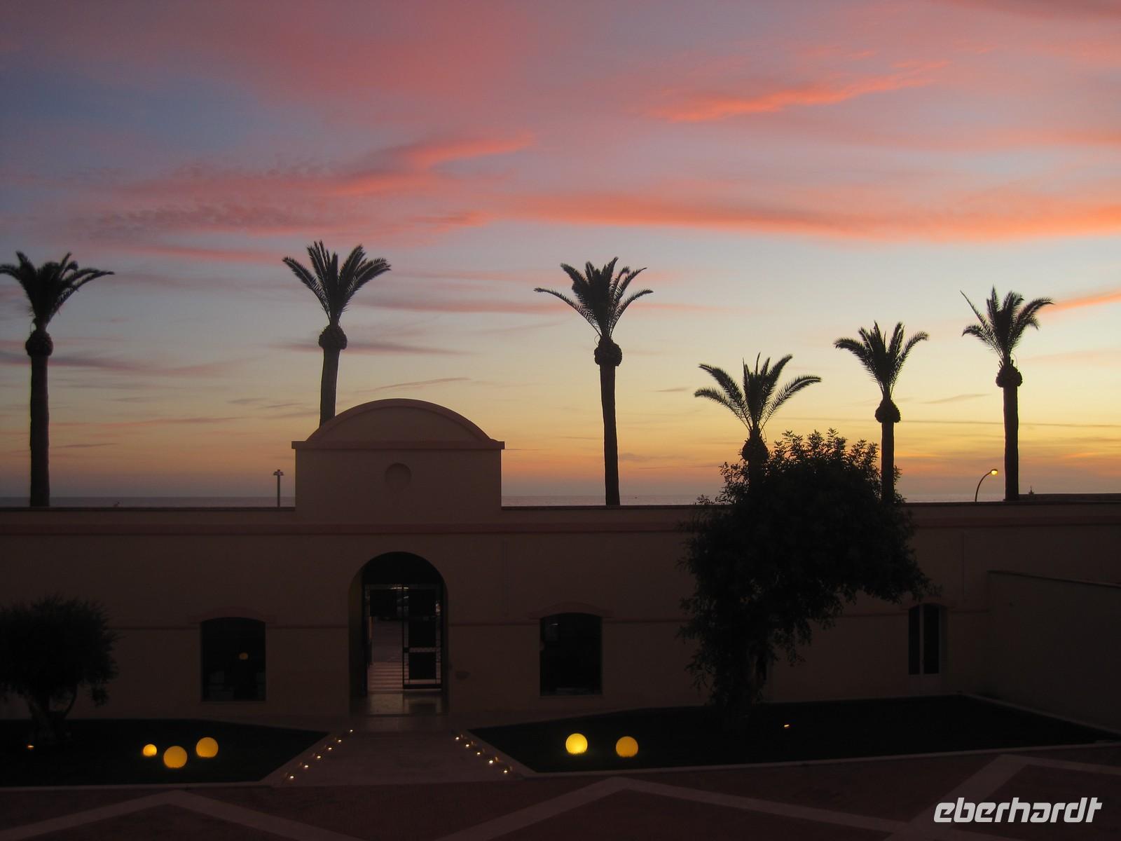 etwas größer- das Mosaik der freizügigen Bikini- Mädchen. Auf der Rückfahrt in Richtung Agrigento sehen wir schon in weiter Ferne die Tempelanlagen, welche Mario so inspirierten, dass wir einen spontanen Stopp beim "Tempel der göttlichen Erleichterung" einlegten. Auf dem letzten Teil der Busfahrt lauschten wir den Klängen sizilianischer Volksmusik und schwangen dazu leicht die Hüften in unserem Bussitz. Sogar Pasquale chauffierte uns im Takt der Heimatklänge sicher zu unserem nächsten Hotel in San Leone. Bei einem kleinen Strandspaziergang bot sich uns ein herllicher Sonnenuntergang.