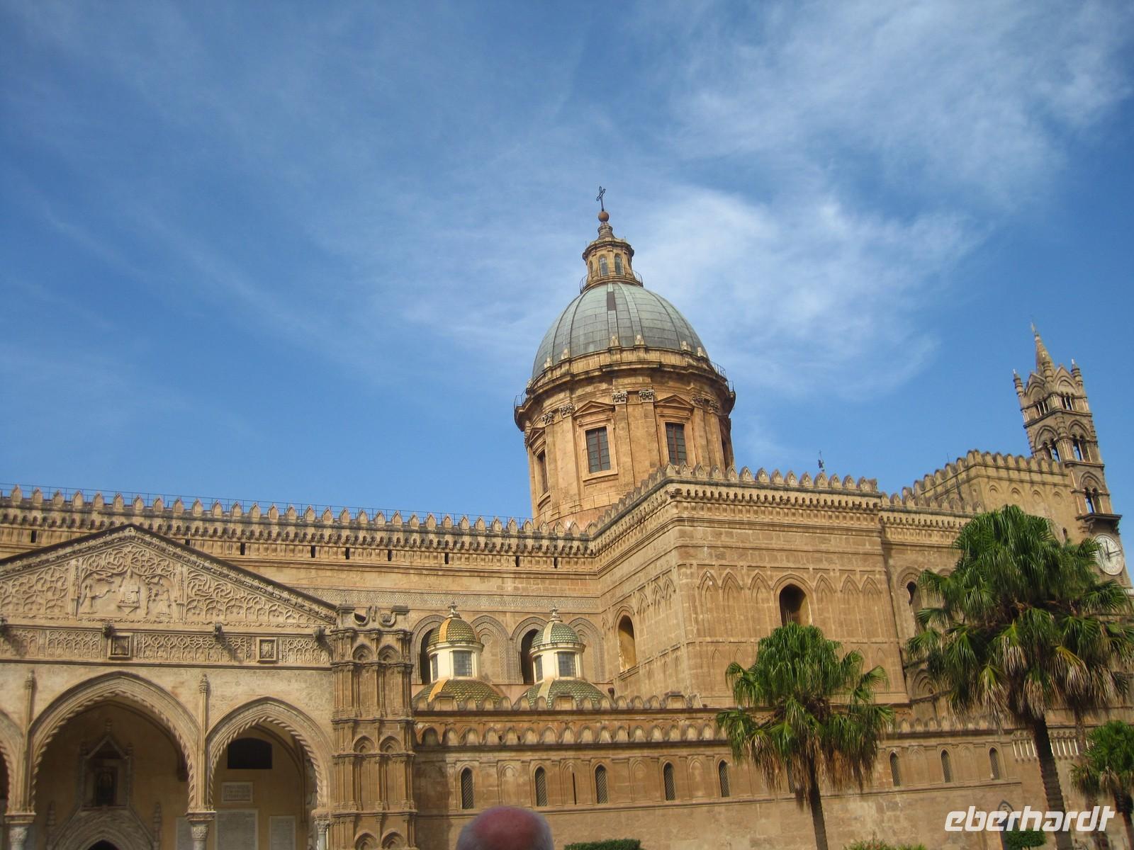 "Goldene Muschel" bezeichnet wird, eingegrenzt von Meer und Bergen. In der Ferne erstreckt sich aber auch noch der Monte Pellegrino über der Bucht von Palermo. Mit knapp 750.000 Einwohnern ist Palermo eine der größten Städte Europas und schon beim Hereinfahren spürten wir, wie nahe Glanz, Glamour und Verfall lagen. Auch zum Sonntag herrschte reger Verkehr auf den palermitanischen Straßen und Pasquale überzeugte mit sizilianischer Ruhe und Geduld. In Palermo besichtigten wir gemeinsam mit Valentina den prunkvollen Königspalast, dessen eindrucksvoller Innenraum alle erstaunen ließ. Marmorverzierungen, Mosaikbilder auf goldenem Grund und die hölzerne Decke bildeten eine einzigartige Einheit. Durch einen schönen Palmengarten gelangten wir zur Kathedrale von Palermo, welche nach diesen prunkvollen Innenräumen überraschend kühl und einfach wirkte. Bereichert von so viel geschichtlichen Eindrücken begeben wir uns auf einen kleinen Spaziergang durch das arabische Viertel von Palermo, mit verfallenen Häuserfassaden und schmutzigen Gassen bis hin zu einem kleinen Markt. Zum Abschluss begeben wir uns in Richtung Hafen, wo wir uns bei einem kleinen Picknick im Park stärken konnten. Köstlichkeiten aus Palermo wie Reisbällchen und ein Glas Weißwein bildeten den perfekten Abschluss des Tages. Meine kleine Überraschung aus Castelbuono, ein Fläschen Kaktusfeigenlikör, rundete den schönen Urlaub ab. Auf dem Rückweg zum Hotel sahen wir ein anderes Palermo- prächtige Bauten und den 170 Jahre alten Ficus Magnoliabaum. Noch lange saßen wir in der Hotelbar bei einem letzten Glas Wein oder Ramazotti beisammen und ließen die schönen Momente Revue passieren.