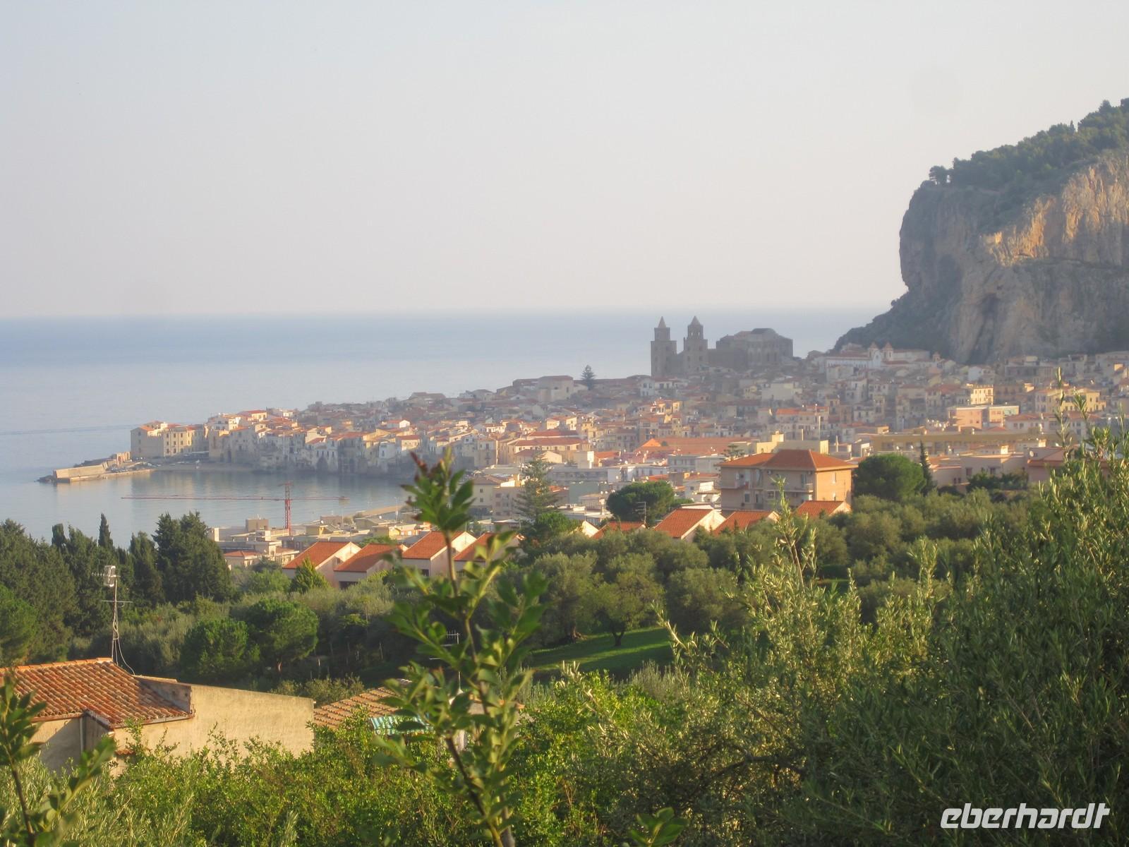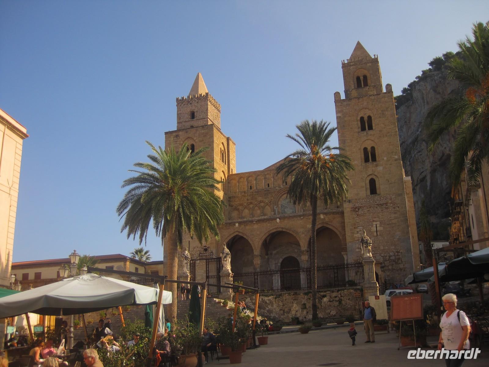 sizilianischen Flair. Aufgrund seiner herrlichen Lage zwischen Meer und Bergen, zählt Cefalu zu den beliebtesten Urlaubszielen. Auch bei der Eberhardt Reisegruppe ruft dieses kleine Städtchen Begeisterung hervor. Der kleine Spaziergang durch den Ort führt uns zum Piazza del Duomo, wo der Dom das kleine Städtchen majestätisch überragt. Wieder einmal erfahren wir alle interessanten Details zur Baugeschichte des Doms von Mario. Dieser entstand bereits 1131 aus einer Legende von Roger dem Zweiten heraus, welcher auf hoher See in einen Sturm geriet und daraufhin versprach, genau dort ein Gotteshaus zu errichten, wo er das rettende Ufer erreicht. Dies sollte in Cefalu sein. Wenig später konnten wir auf eigene Faust das Städtchen erkunden und viele erreichten durch verwinkelte Gassen sogar den schönen weißen Sandstrand, wo man selbst im Oktober noch Badegäste sah. Schweren Herzens nahmen wir Abschied von Cefalu, freuten uns aber auch schon auf die imposante Gebirgskette. Inmitten üppig grüner Vegetation schimmern auf den Bergkuppen malerische Bergdörfer. Aus der Ferne erstreckt sich der Pizzo Carbonara vor uns, nein keine Carbonarapizza, sondern der zweithöchste (knapp 2000m) Berg Siziliens. Viele Serpentinen führen uns immer weiter ins Gebirge bis hin zum Agriturismo, wo wir wieder einmal singend von 2 sizilianischen Musikern empfangen werden. Ein Festmahl aus vielen einheimischen Köstlichkeiten wurde uns serviert, so dass wir längere Zeit in der Finca
