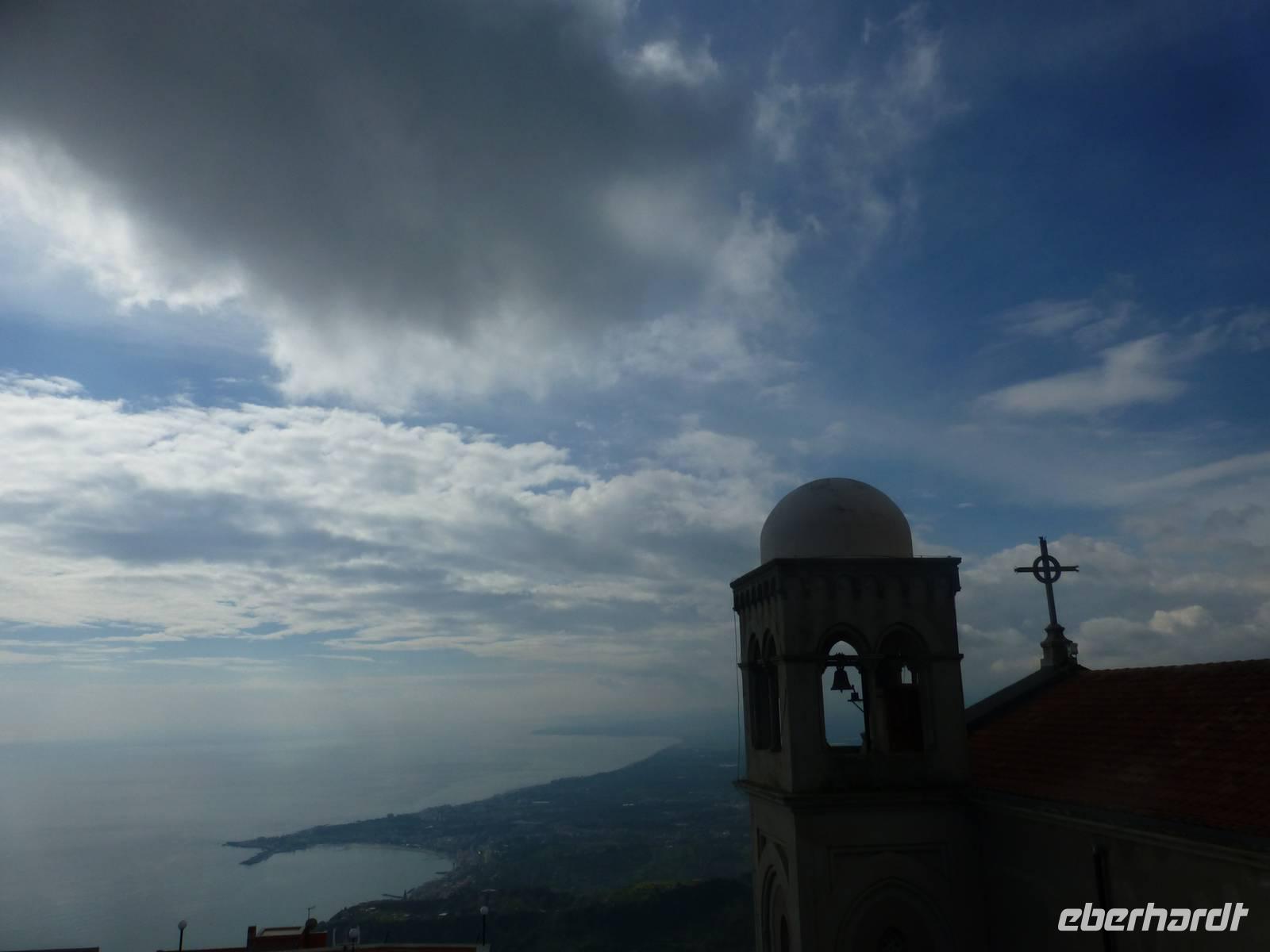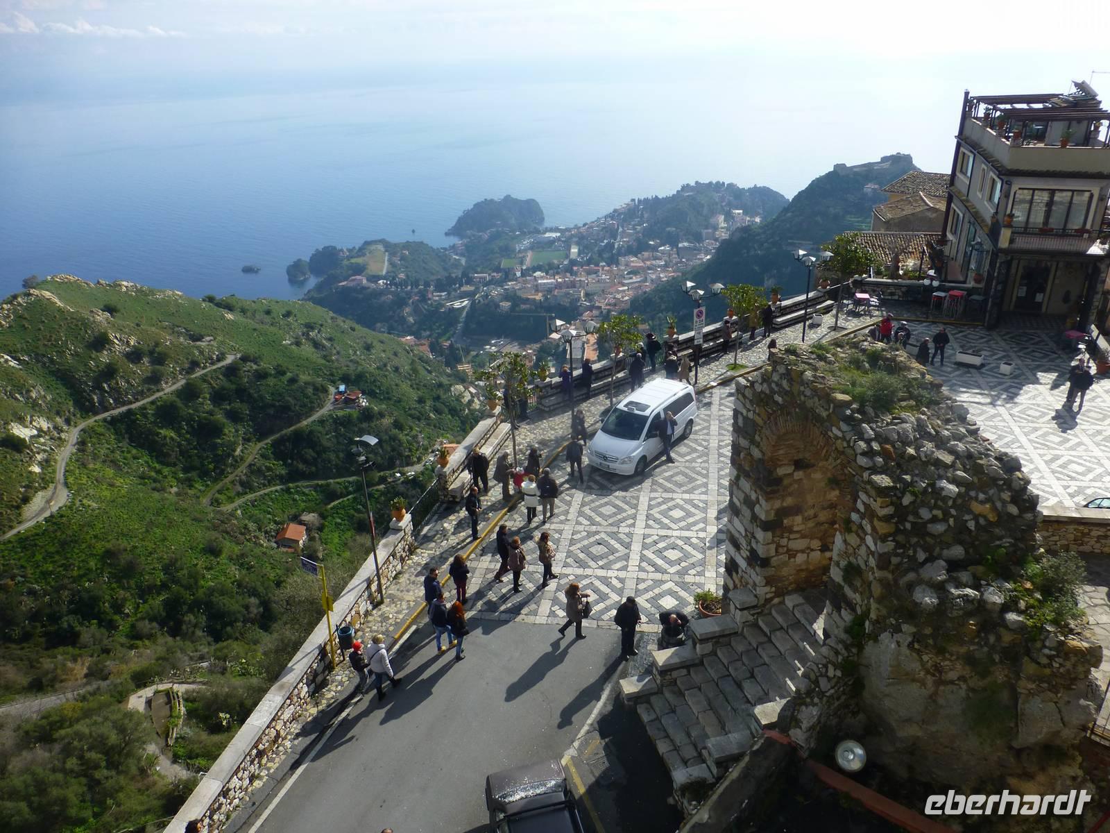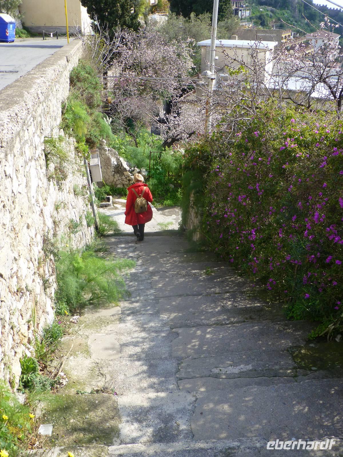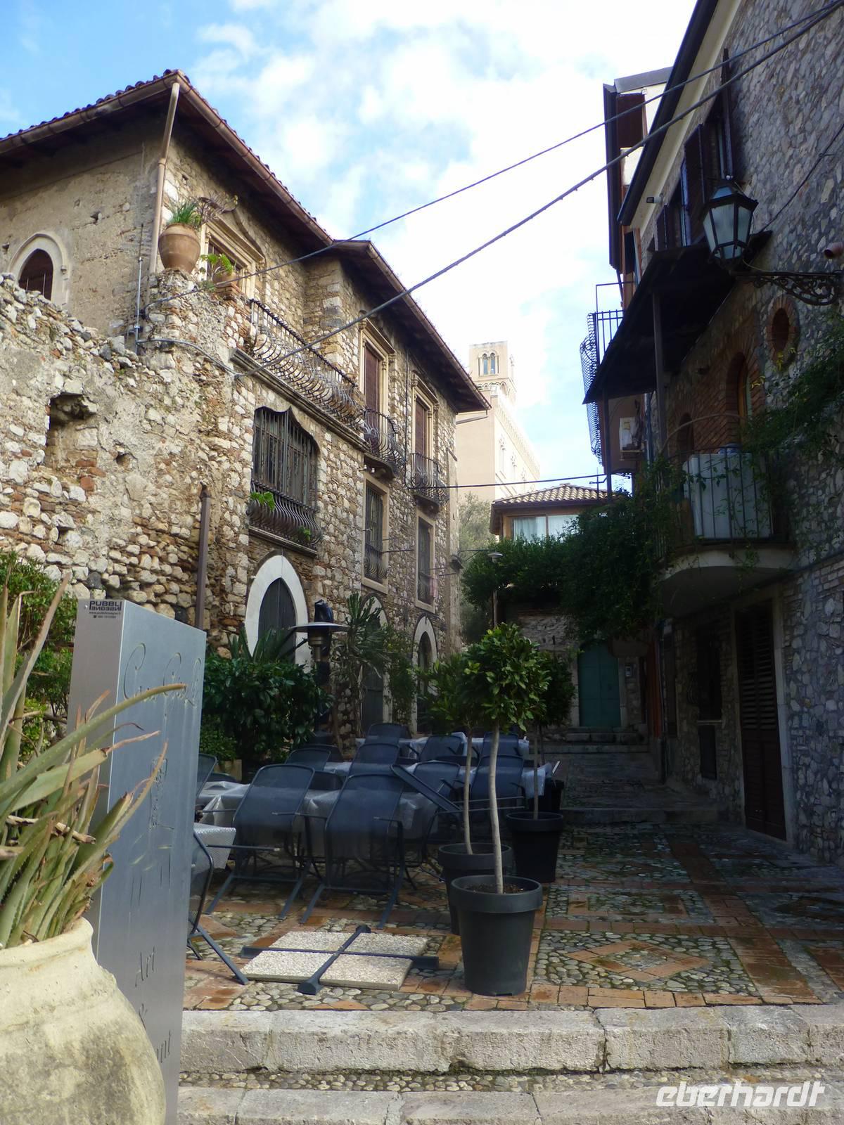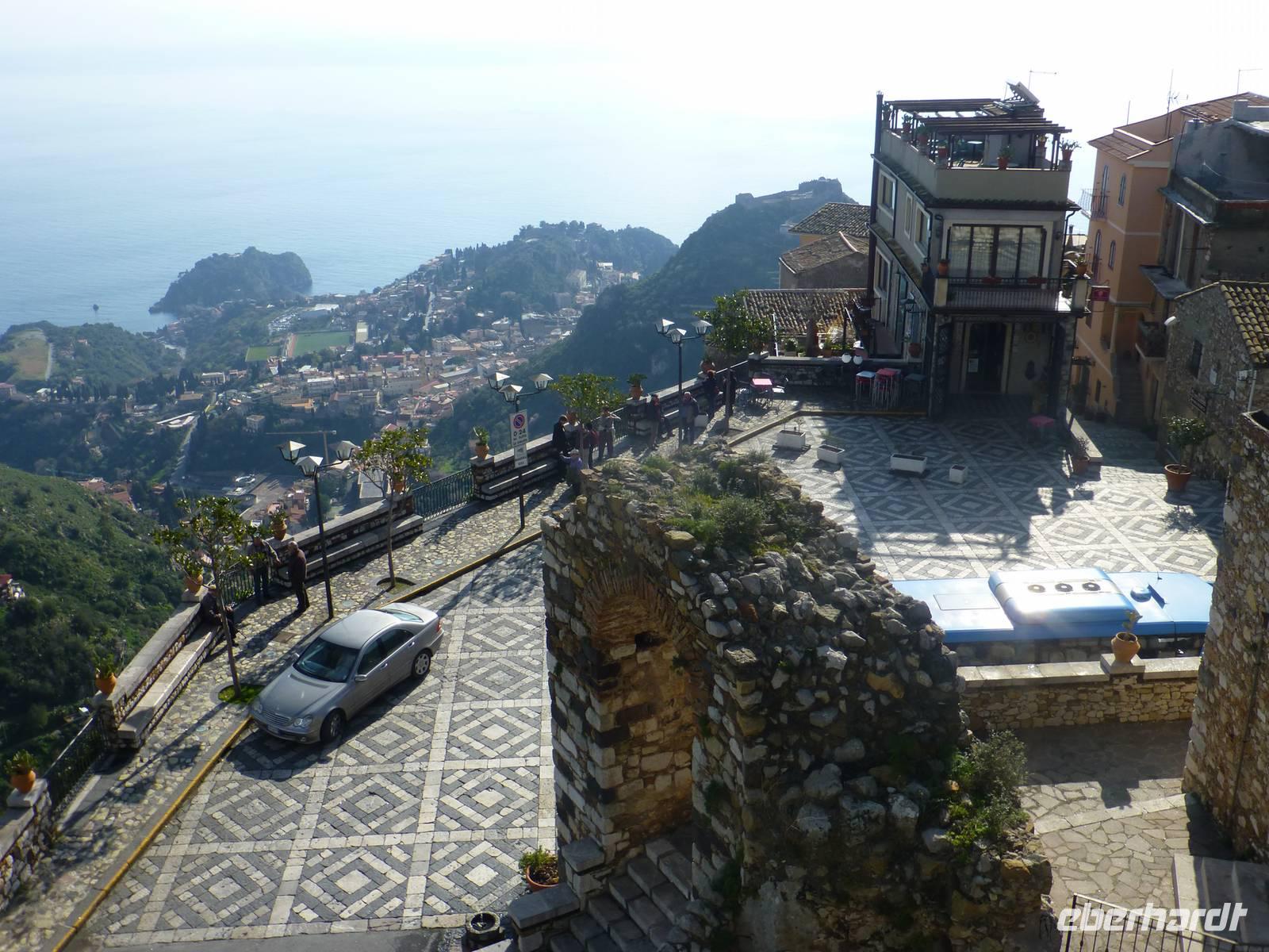 Die Sonne kam zum Vorschein und einige unternahmen einen Strandspaziergang und fuhren am Mittag mit dem Linienbus nach Taormina. In der schönen Altstadt lohnte ein Bummel durch die Gassen und natürlich der Besuch im griechischen Theater. Ich fuhr am Morgen mit dem Linienbus hinauf nach Castelmola. Dieser Ort liegt oberhalb von Taormina und ist von Touristen noch weniger bekannt und von daher noch nicht überlaufen. Also momentan noch ein echter Geheimtipp für Sizilien-Freunde. Bekannt ist der Ort auch für seinen Mandelwein. Ein schöner Blick auf die Bucht und ein kurzer Blick hinüber zum Ätna belohnte schon die Auffahrt. Eine fast absolute Stille bevor ein Reisebus mit einer Gruppe Italiener eintraf. Gemütlich ging es zu Fuß bergab nach Taormina bis zum Domplatz.