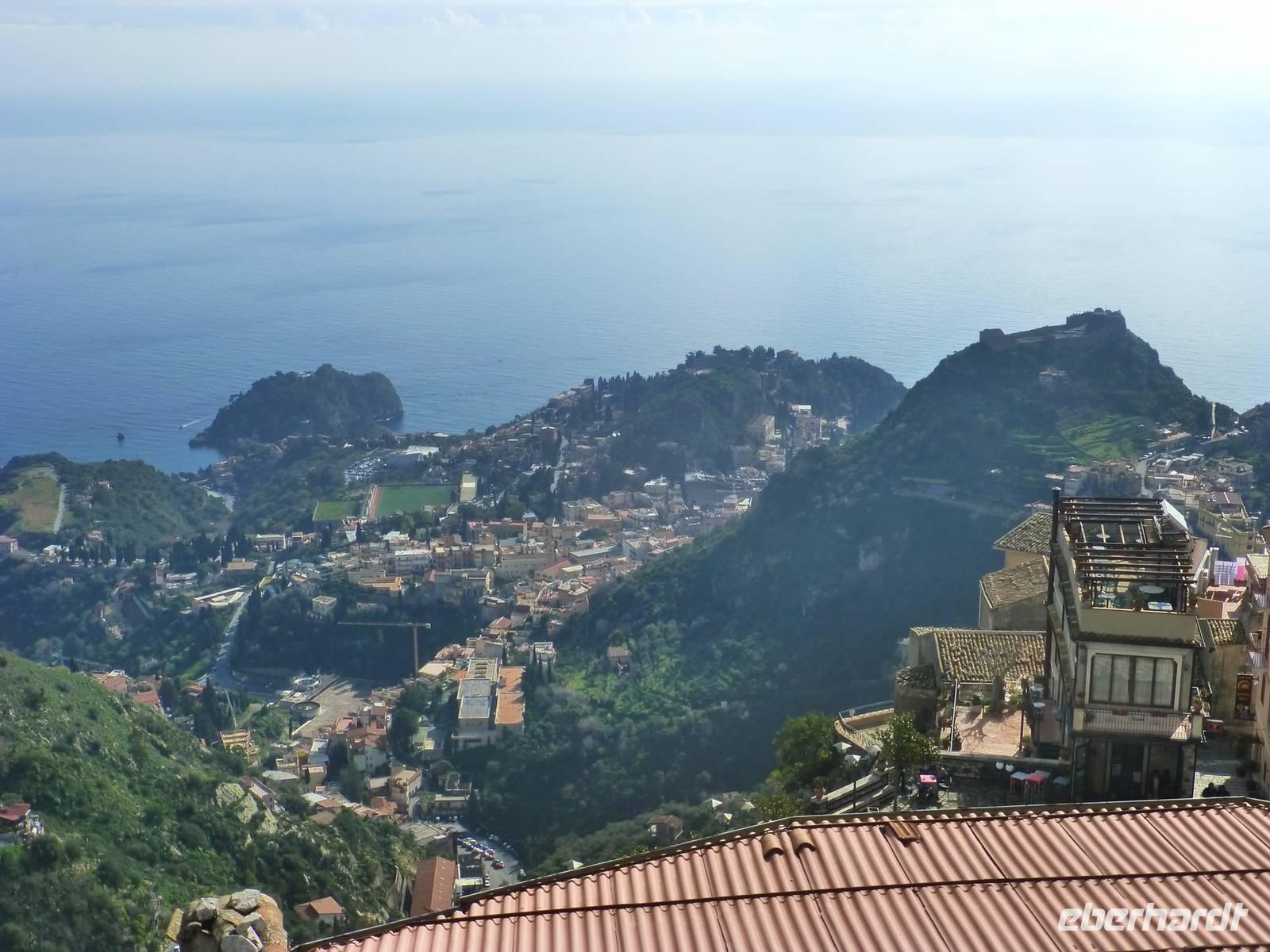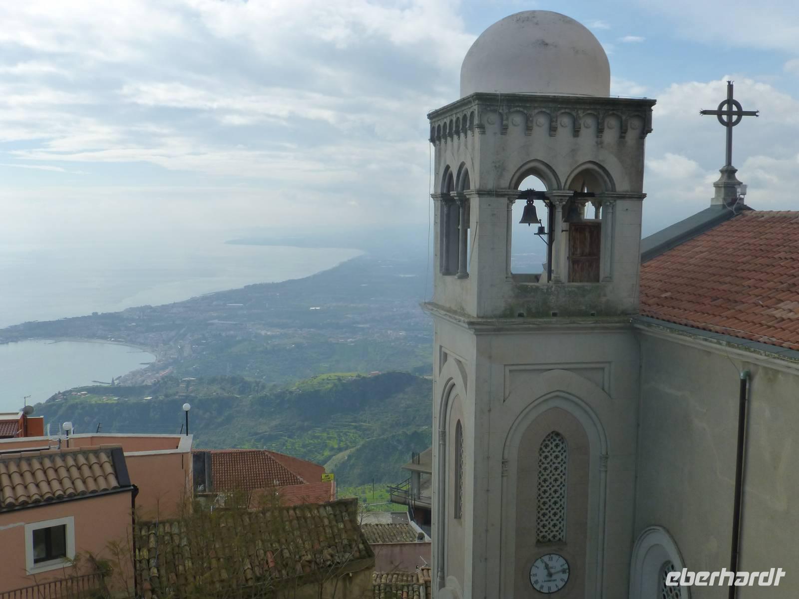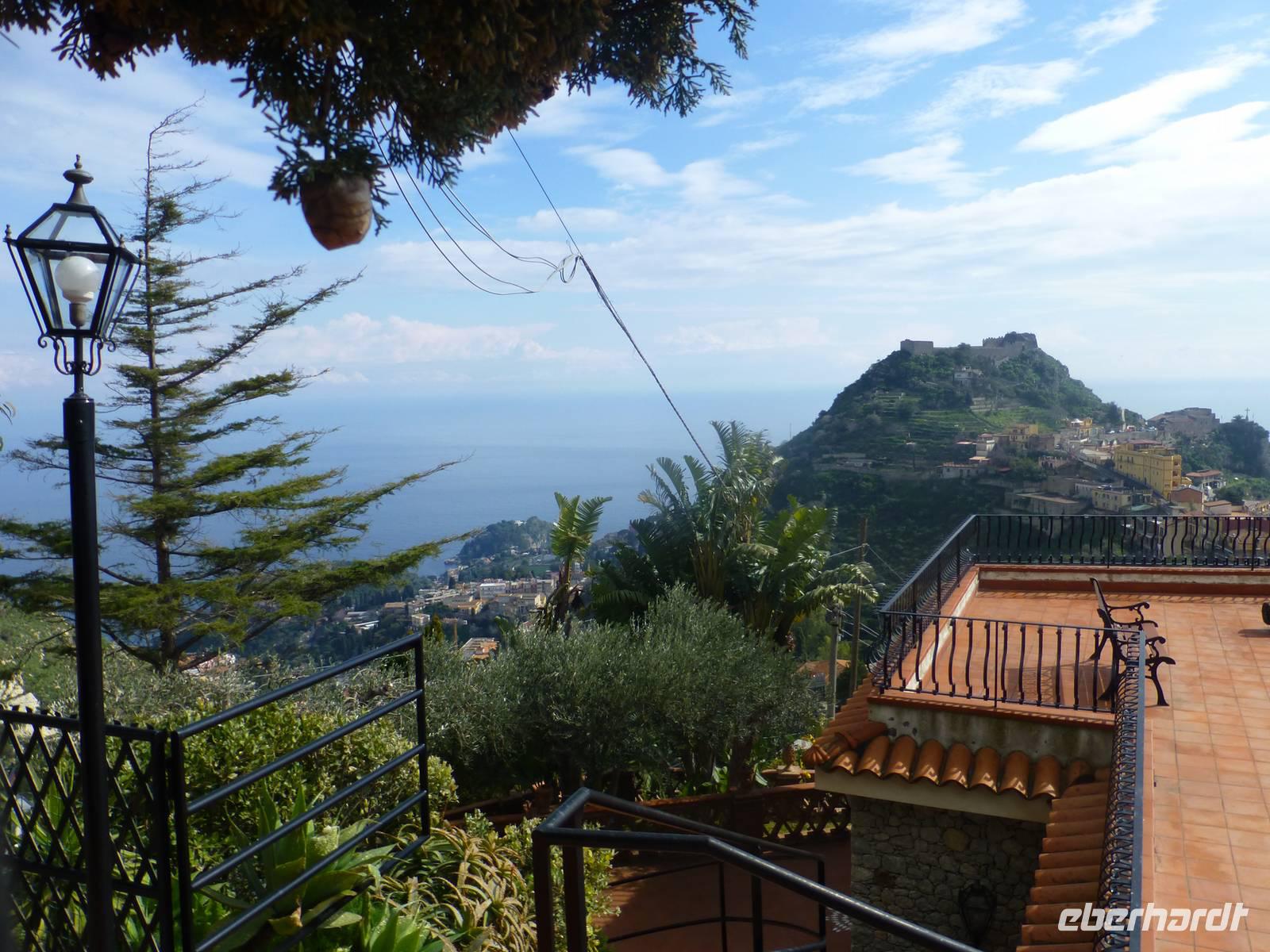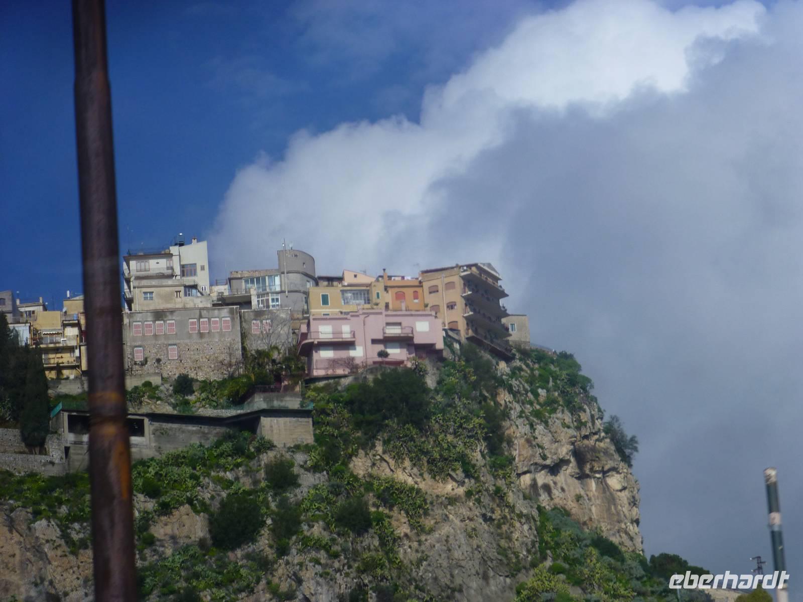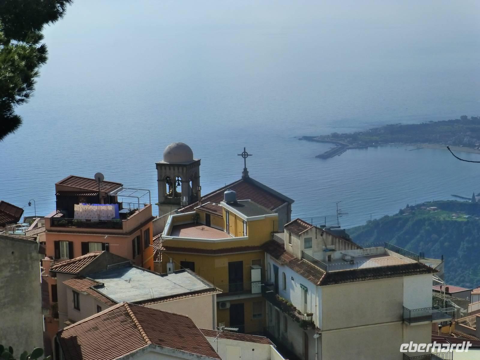 Die Sonne kam zum Vorschein und einige unternahmen einen Strandspaziergang und fuhren am Mittag mit dem Linienbus nach Taormina. In der schönen Altstadt lohnte ein Bummel durch die Gassen und natürlich der Besuch im griechischen Theater. Ich fuhr am Morgen mit dem Linienbus hinauf nach Castelmola. Dieser Ort liegt oberhalb von Taormina und ist von Touristen noch weniger bekannt und von daher noch nicht überlaufen. Also momentan noch ein echter Geheimtipp für Sizilien-Freunde. Bekannt ist der Ort auch für seinen Mandelwein. Ein schöner Blick auf die Bucht und ein kurzer Blick hinüber zum Ätna belohnte schon die Auffahrt. Eine fast absolute Stille bevor ein Reisebus mit einer Gruppe Italiener eintraf. Gemütlich ging es zu Fuß bergab nach Taormina bis zum Domplatz.