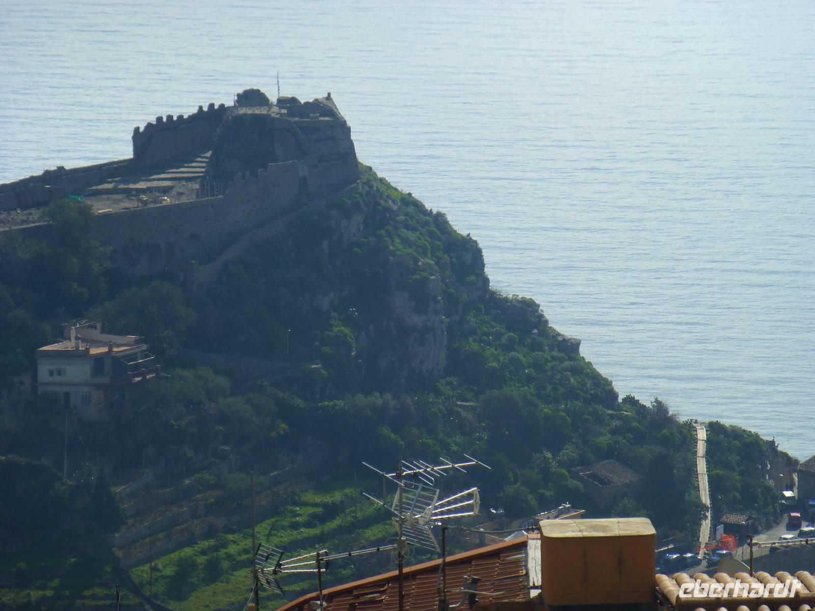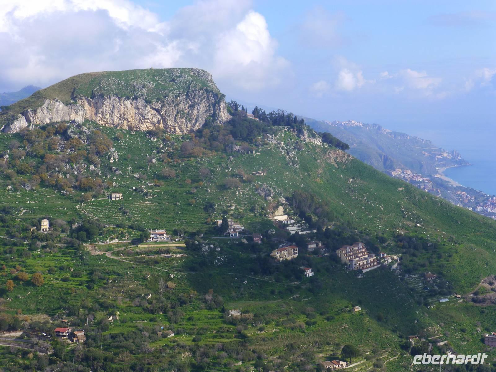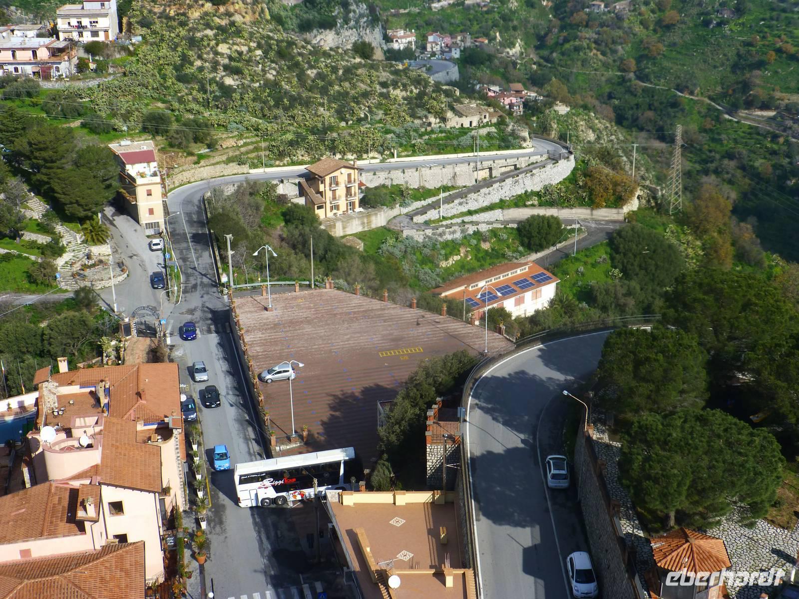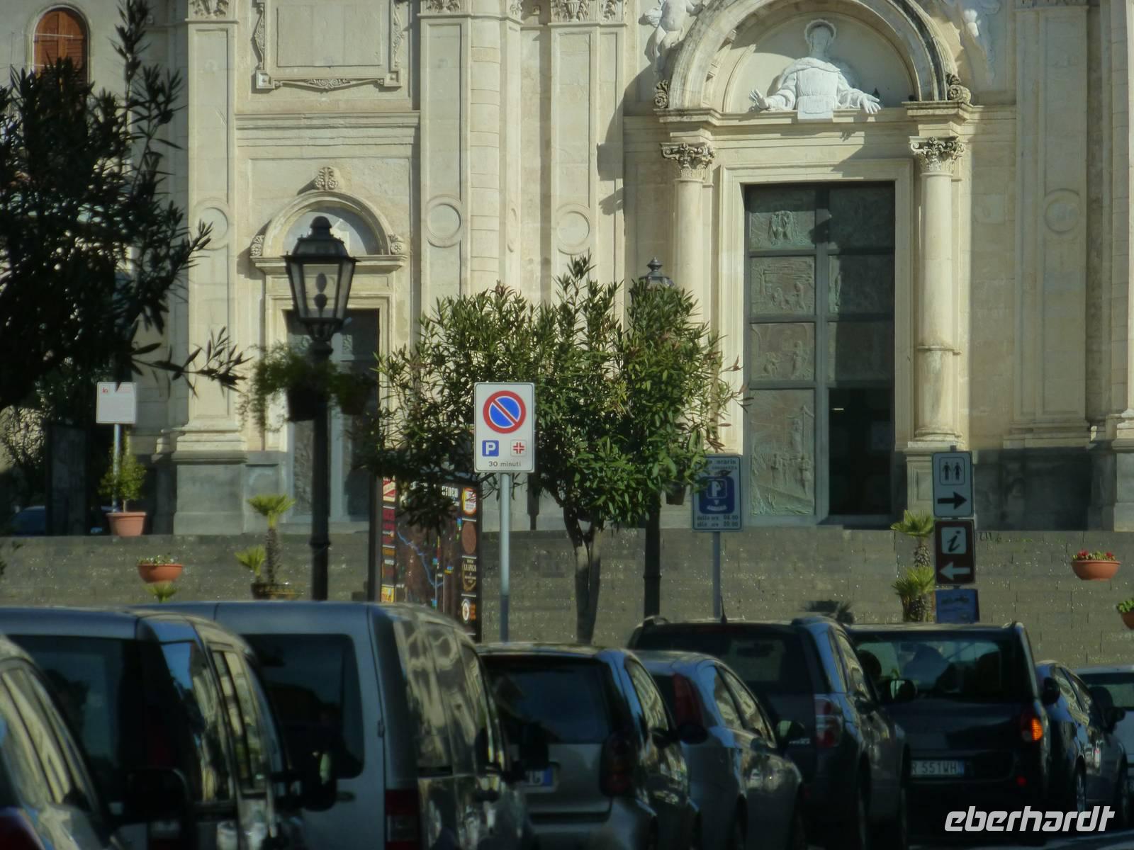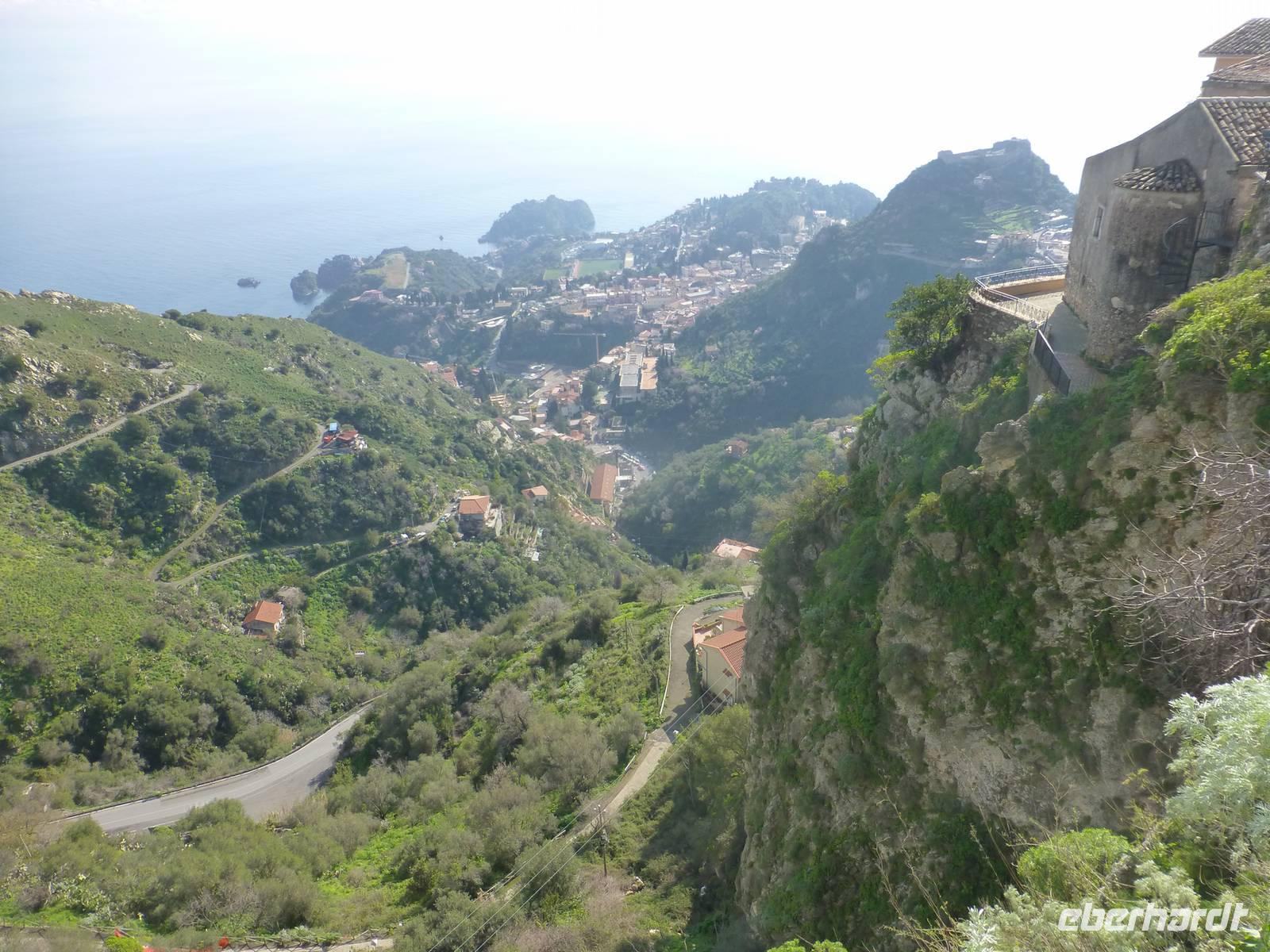 Die Sonne kam zum Vorschein und einige unternahmen einen Strandspaziergang und fuhren am Mittag mit dem Linienbus nach Taormina. In der schönen Altstadt lohnte ein Bummel durch die Gassen und natürlich der Besuch im griechischen Theater. Ich fuhr am Morgen mit dem Linienbus hinauf nach Castelmola. Dieser Ort liegt oberhalb von Taormina und ist von Touristen noch weniger bekannt und von daher noch nicht überlaufen. Also momentan noch ein echter Geheimtipp für Sizilien-Freunde. Bekannt ist der Ort auch für seinen Mandelwein. Ein schöner Blick auf die Bucht und ein kurzer Blick hinüber zum Ätna belohnte schon die Auffahrt. Eine fast absolute Stille bevor ein Reisebus mit einer Gruppe Italiener eintraf. Gemütlich ging es zu Fuß bergab nach Taormina bis zum Domplatz.
