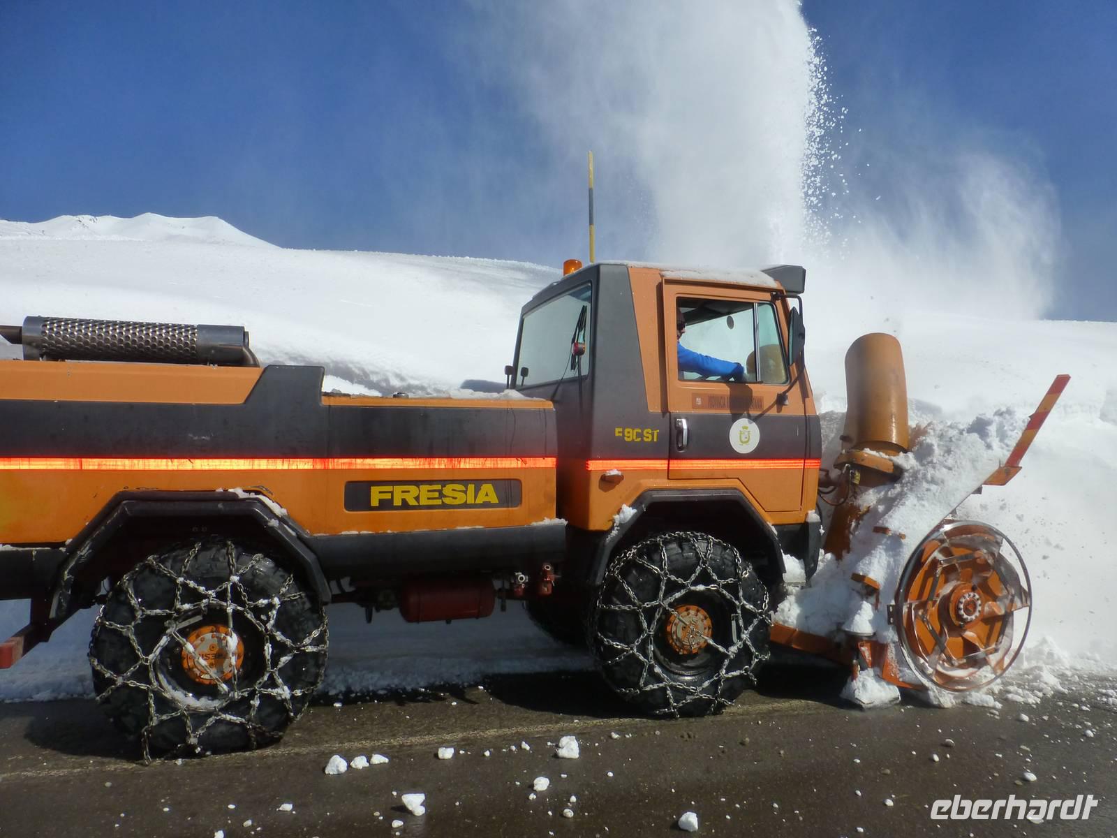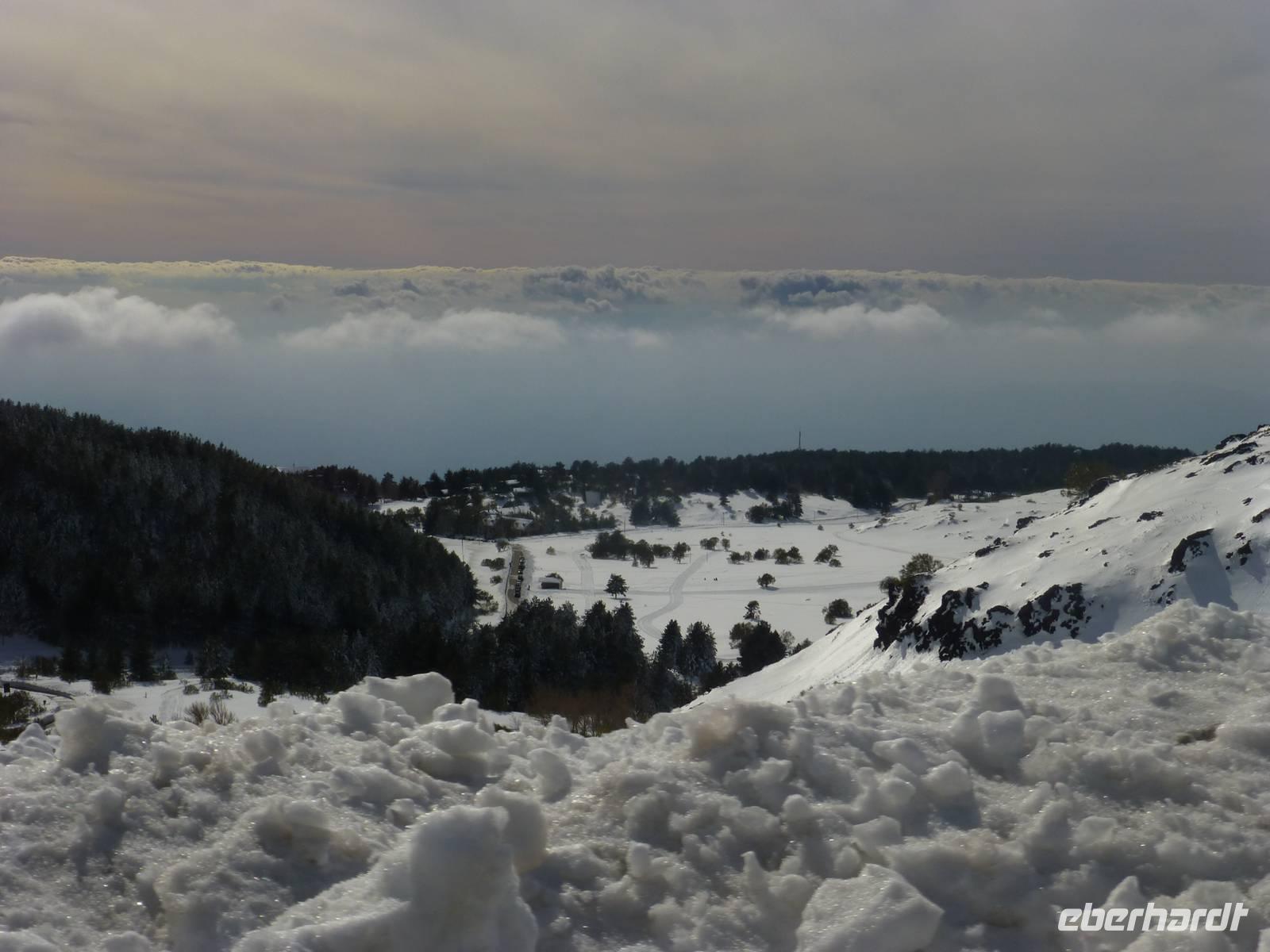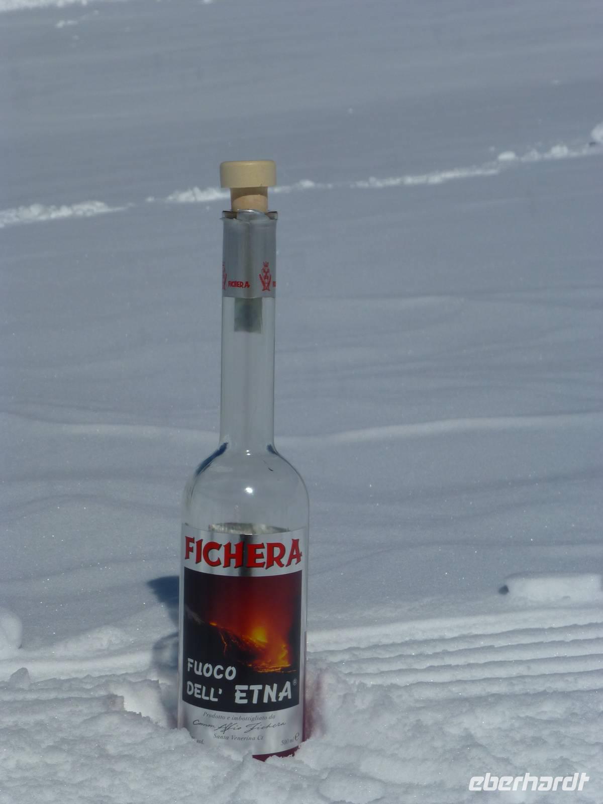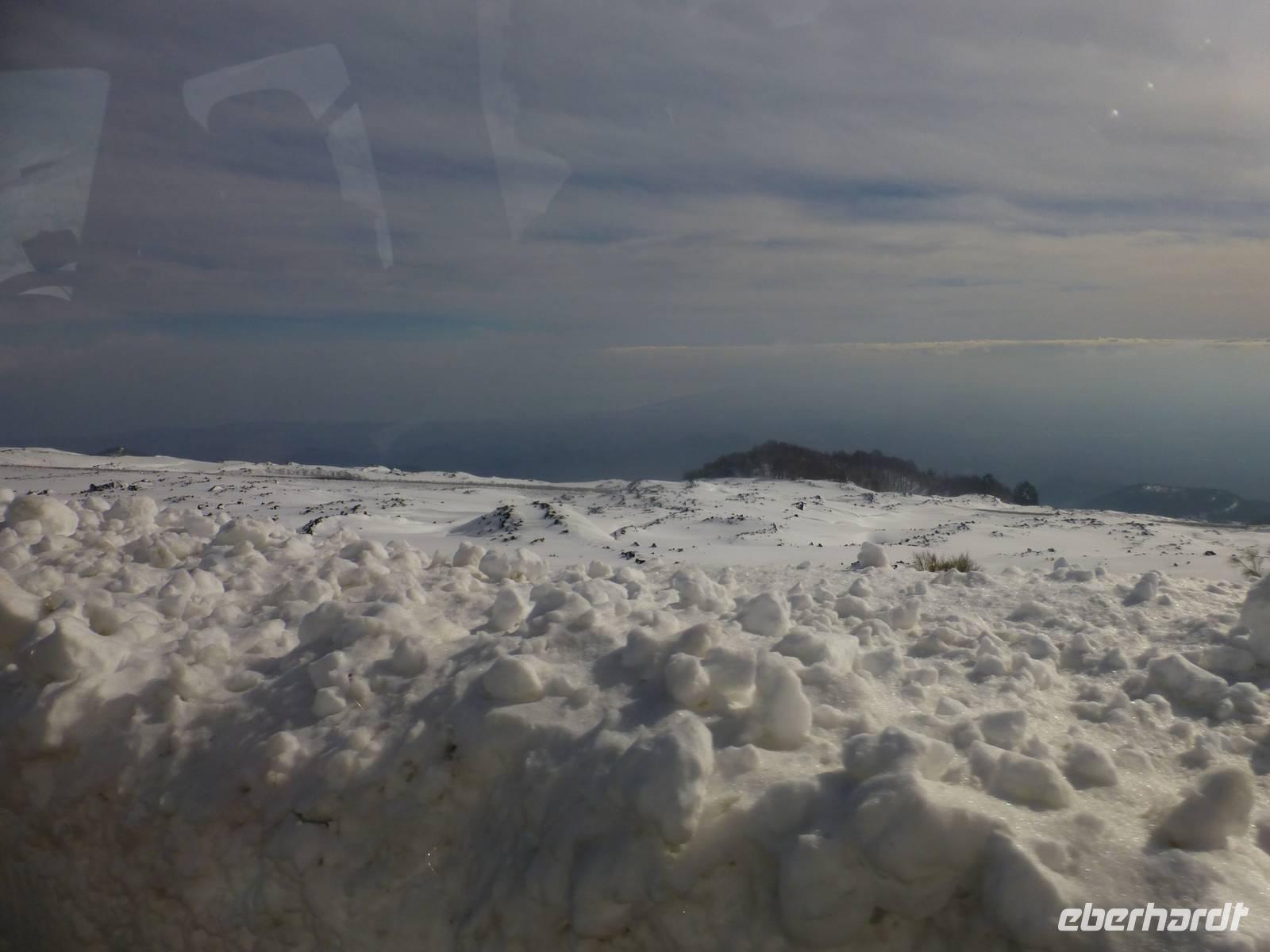 Es hatte sich gelohnt, den Ätna am letzten Urlaubstag zu besuchen. Der Ätna, einer der noch aktiven und auch der größte Vulkan Europas, zeigte sich bei blauem Himmel und Sonnenschein in seiner vollen Pracht. Der Schnee der letzten Tage erschwerte unsere Anreise. Trotz Informationen der örtlichen Polizei standen wir an der Auffahrt Süd vor einer Absperrung. Guter Rat war teuer. Um etwas Zeit zu gewinnen, besuchten wir einen Imker. Neben den verschiedenen Honigsorten probierten wir auch verschiedene Öle und Pasten. Anschließend fuhren wir zu einem Lavafeld. Seine enormen Eruptionen und wechselhaften Ausbrüche haben ihn zu einem der bekanntesten Vulkane unserer Zeit werden lassen. Nach einem Anruf von Hermann bei den örtlichen Behörden, endlich die Mitteilung die Straße zum Ätna wäre geräumt. Mit dem Bus fuhren wir vorbei an meterhohen Schneefeldern bis zum Silvestri-Kratern auf ca. 1.900 Meter Höhe. Die Seilbahn brachte uns weiter auf 2500 Meter Höhe. Wir waren über den Wolken, der Himmel war immer noch Blau und die Sonne wärmte uns mit ihren Strahlen. Ein tolles Erlebnis an unserem letzten Tag in Sizilien und ein Grund mit einem kräftigen Schluck "Etna Feuer" anzustoßen.