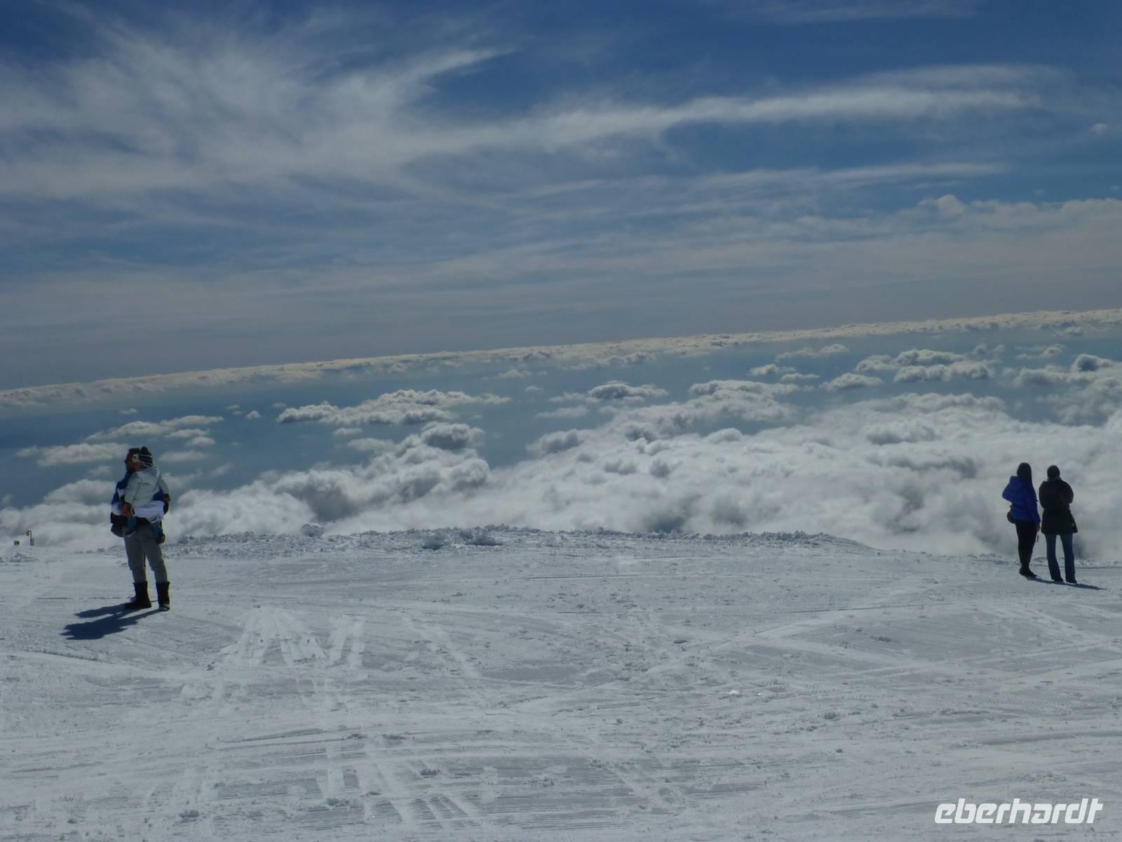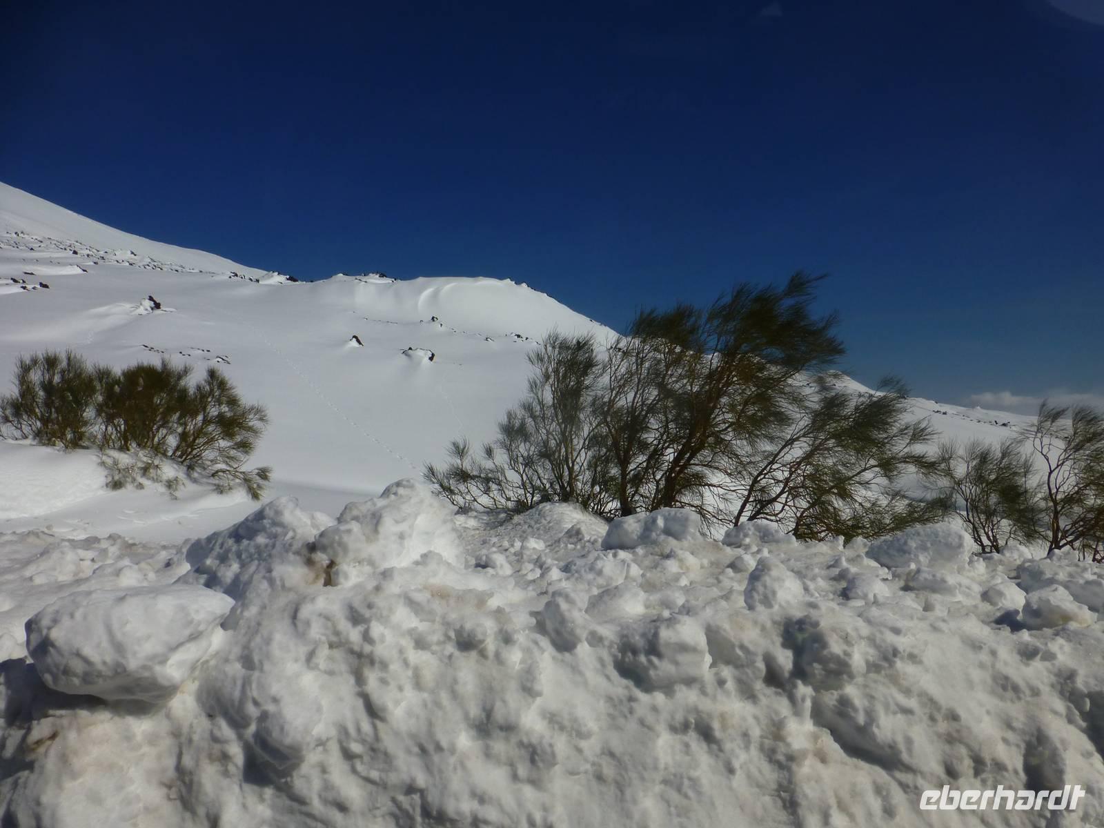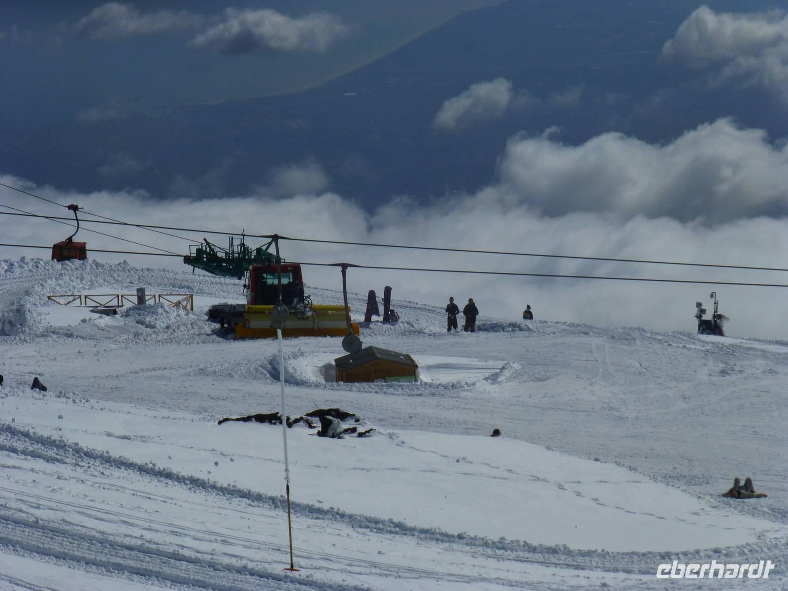 Es hatte sich gelohnt, den Ätna am letzten Urlaubstag zu besuchen. Der Ätna, einer der noch aktiven und auch der größte Vulkan Europas, zeigte sich bei blauem Himmel und Sonnenschein in seiner vollen Pracht. Der Schnee der letzten Tage erschwerte unsere Anreise. Trotz Informationen der örtlichen Polizei standen wir an der Auffahrt Süd vor einer Absperrung. Guter Rat war teuer. Um etwas Zeit zu gewinnen, besuchten wir einen Imker. Neben den verschiedenen Honigsorten probierten wir auch verschiedene Öle und Pasten. Anschließend fuhren wir zu einem Lavafeld. Seine enormen Eruptionen und wechselhaften Ausbrüche haben ihn zu einem der bekanntesten Vulkane unserer Zeit werden lassen. Nach einem Anruf von Hermann bei den örtlichen Behörden, endlich die Mitteilung die Straße zum Ätna wäre geräumt. Mit dem Bus fuhren wir vorbei an meterhohen Schneefeldern bis zum Silvestri-Kratern auf ca. 1.900 Meter Höhe. Die Seilbahn brachte uns weiter auf 2500 Meter Höhe. Wir waren über den Wolken, der Himmel war immer noch Blau und die Sonne wärmte uns mit ihren Strahlen. Ein tolles Erlebnis an unserem letzten Tag in Sizilien und ein Grund mit einem kräftigen Schluck "Etna Feuer" anzustoßen.
