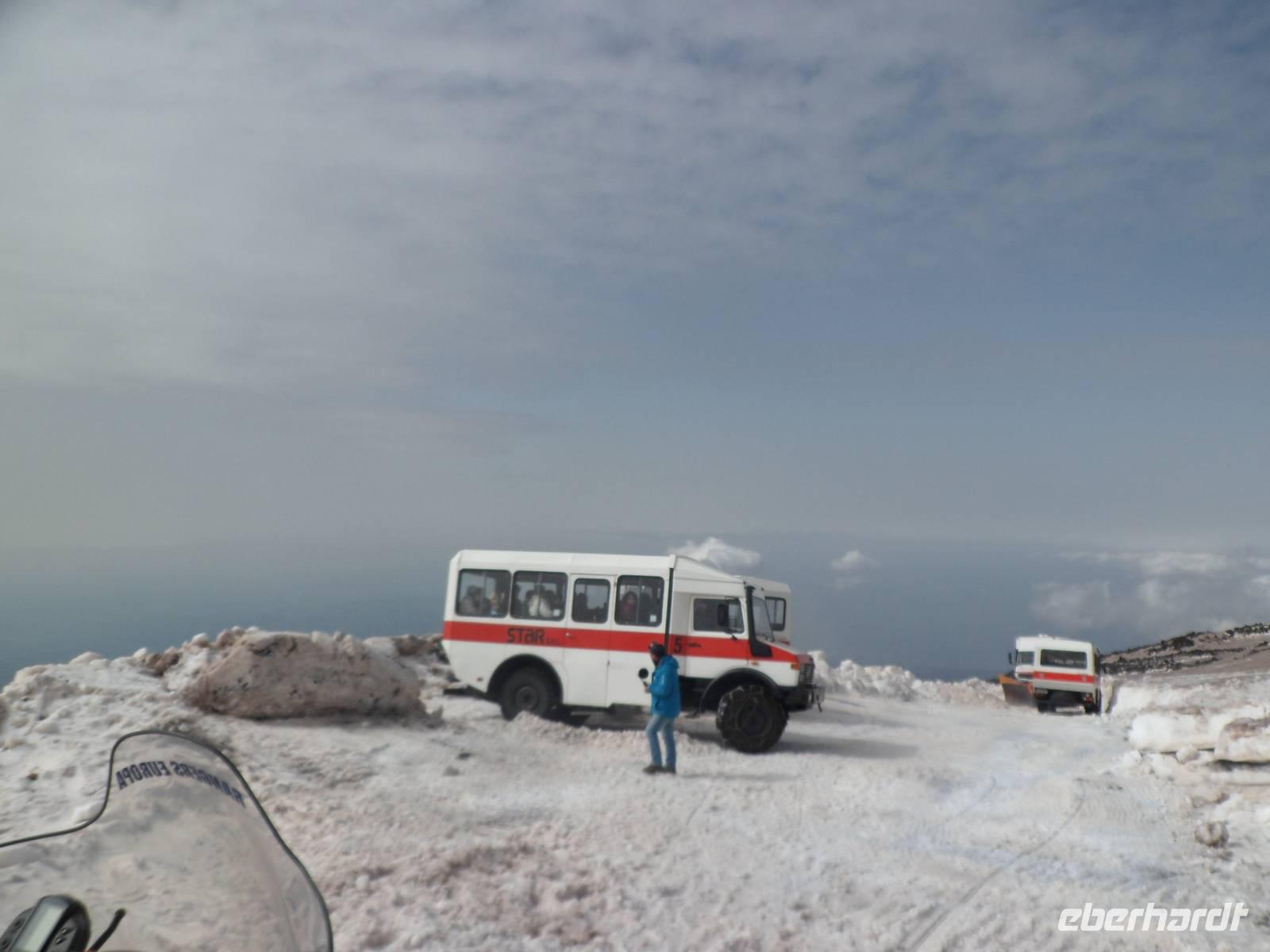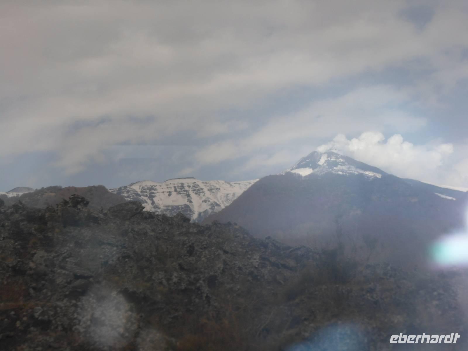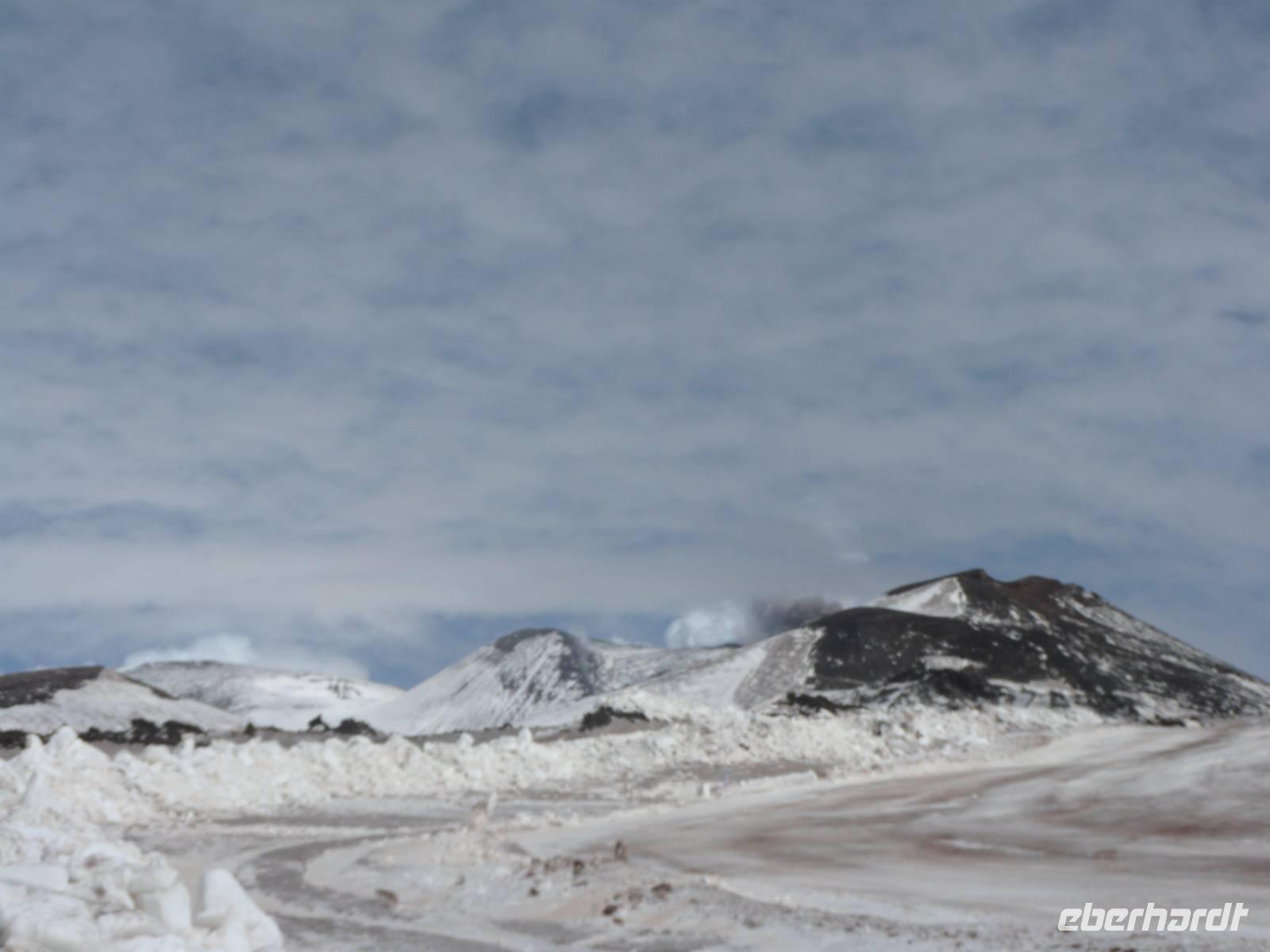 Wir sehen den Ätna im Sonnenschein, ohne Wolken, er läd uns ein. Alle sind schon in Vorfreude und können es kaum erwarten auf den Berg zu kommen. Auch Ski und Snowbordfahrer waren auf 2000 m Höhe noch unterwegs. Die Jeepps fahren erst den 2. Tag hinauf und ohne Schneeketten geht gar nichts. Ein unbeschreibliches Erlebnis. Die Sonne verwandelte diese geheimnisvolle Welt in ein Glitzern mit Rauchschwaden und dunklen Gestein, wow.