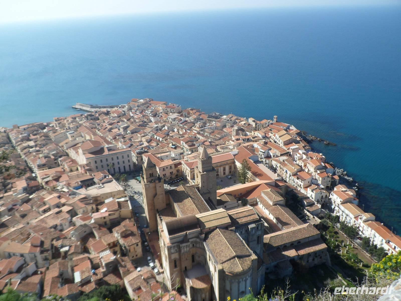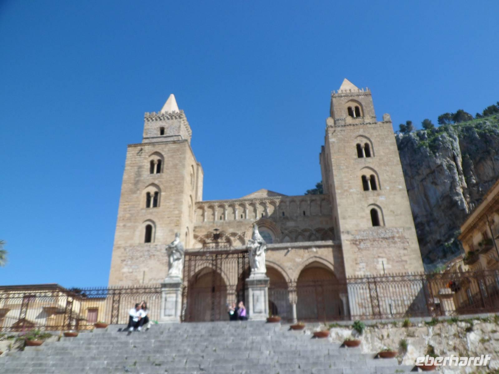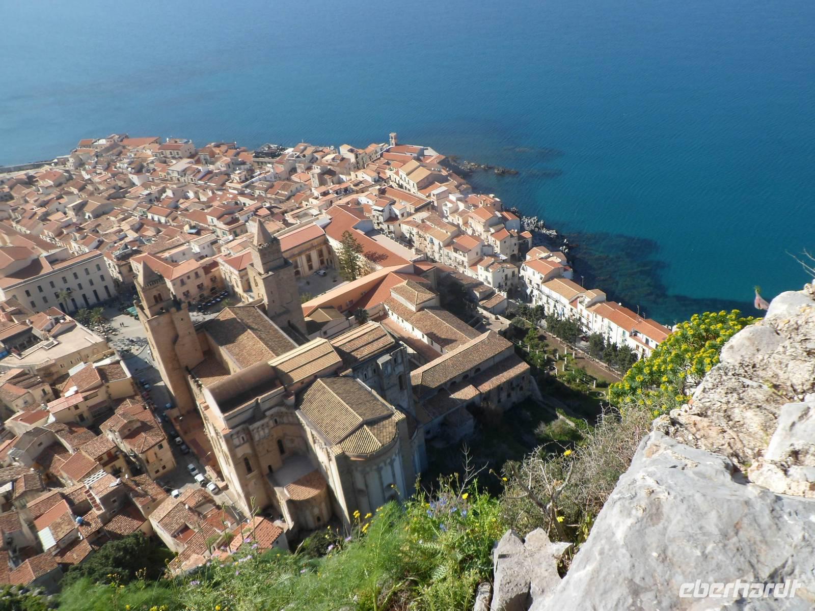 Ein " Gigantenkopf" aus Muschelkalk kündigt das lebhafte Badestädtchen mit seinen gepflegten Sandstrand an. Wir spazieren durch die gassen und Alberto begleitet uns bis zur Mauer wo der Aufstieg zum Hausberg beginnt. Ja wirklich ,sehr anstregend aber ist man erst mal oben wird man sowas von entschädigt mit den Blicken zum funkelnden Meer, der Stadt mit den Dächern des Klosters und der Kathedrale und den gewaltigen Bergen der Madonie in der Ferne. Kurz bevor wir die Stadt wieder verlassen besichtigen wir noch die die Kathedrale von Cefalu, sehr interessant sind , u.a. die modernen Fenster. Ein wunderschöner Tag geht zu Ende .
