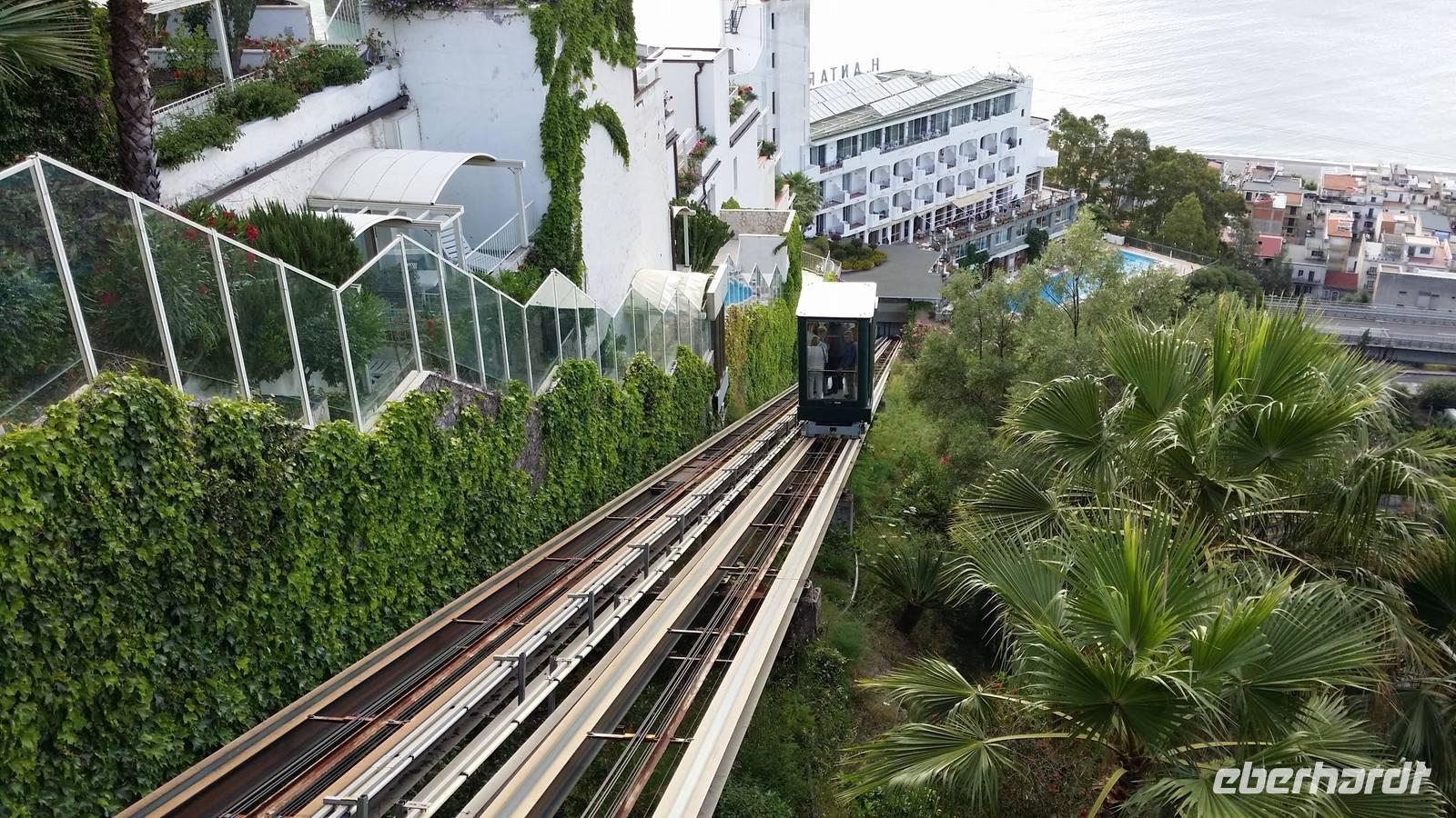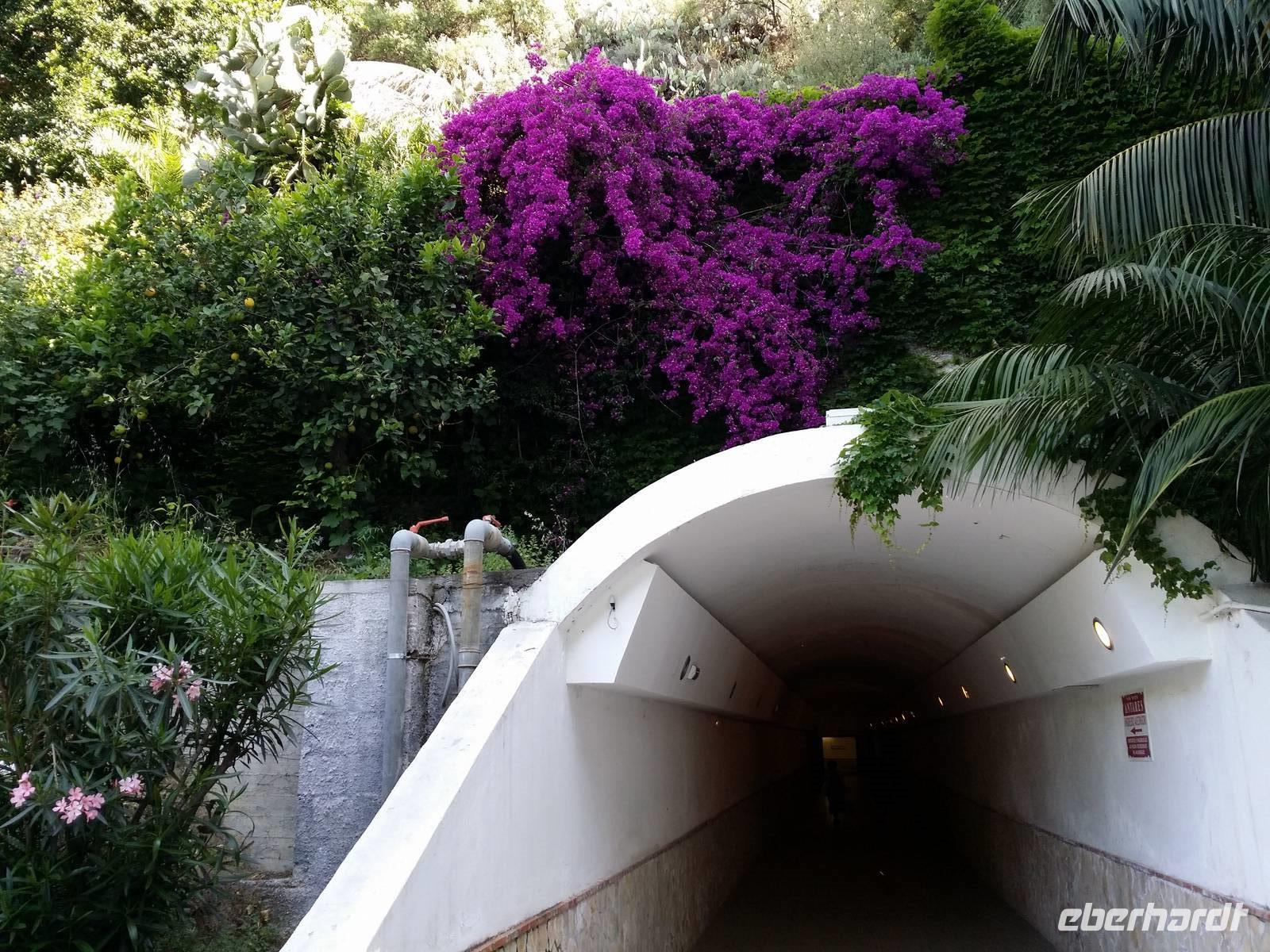 Seit dem Vorabend kennen wir das Parc Hotel Olimpo-Le Terrazze. Die Anlage thront über der Ortschaft Letojanni, über einer in die Küste hineingeschnittenen Bucht, und unterteilt sich in eine Vielzahl von Hotel- und Restaurantetagen. Es sind tatsächlich Terrassen auf dem Berg und am Berg. Und so sehr wir der Anlage auf einige Tage treu bleiben, so sehr auch wird uns anderes zur Gewohnheit: Das Frühstück- und Abendbuffet versammelt uns täglich. Wir sind nicht die einzigen Gäste, nehmen sogar von einer Hochzeitsfeier Notiz usw. Ein Aufzug, der zur Bauzeit dem Transport von Material gedient haben könnte, befördert uns mit allem Komfort bergab. Unten am Berg durchschreitet man einen letzten Tunnel, ehe man auf den Omnibusparkplatz heraustritt.