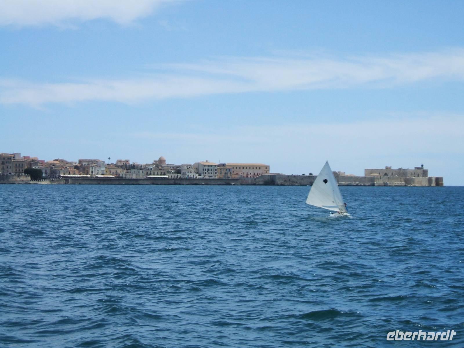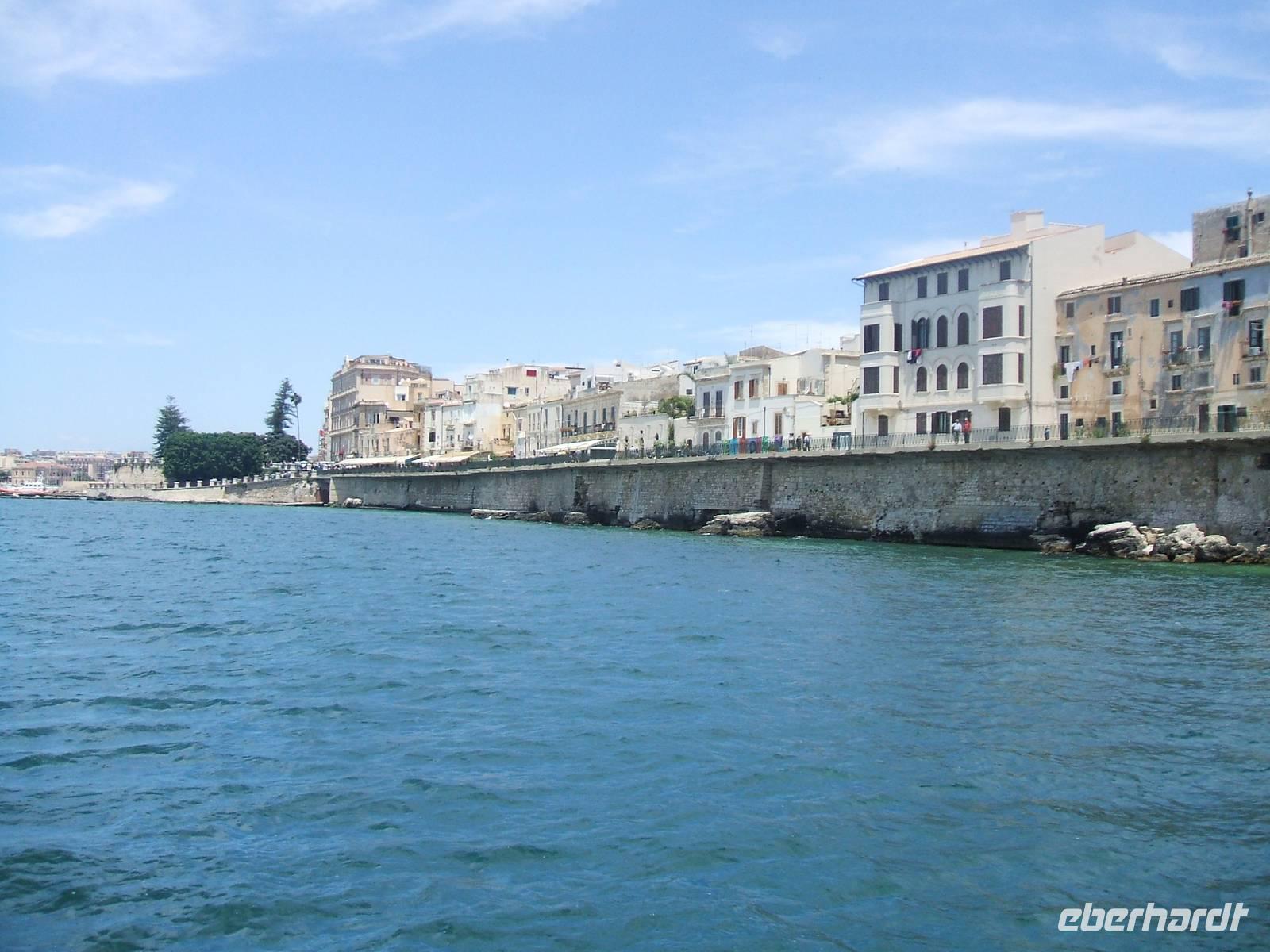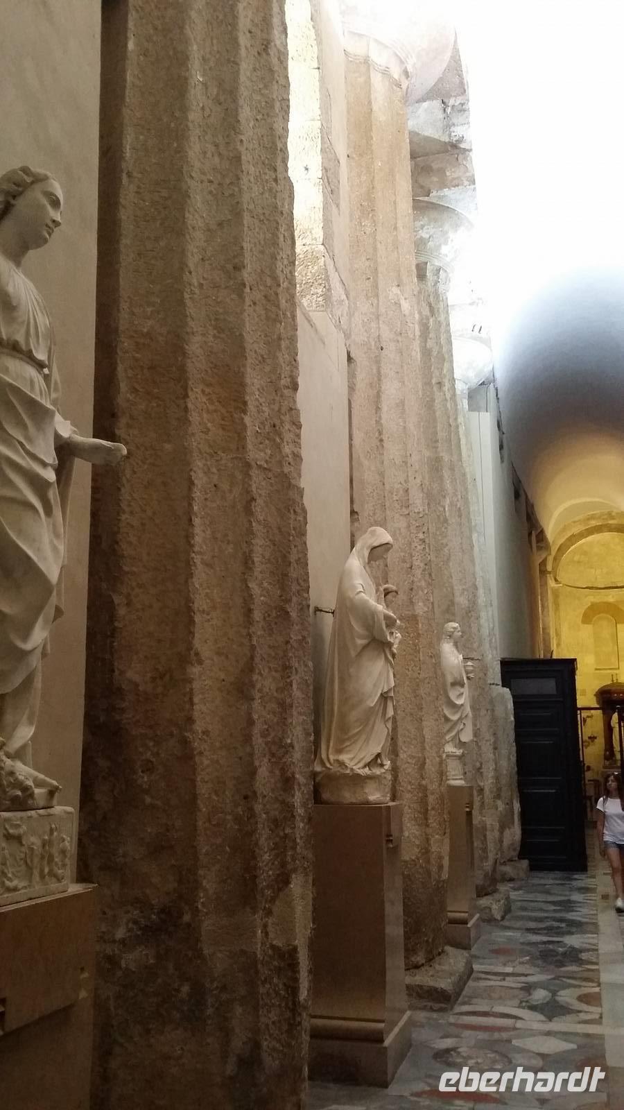 Die Verschwisterung mehrerer Jahrtausende bleibt Syrakus vorbehalten. Noch verlassen wir unseren Bus an einem hässlichen Parkplatz, wo nahebei ein Vollbart von Imbissbetreiber sein Nebengeld mit Toilettengängern bestreitet. Uns trennen jedoch nur wenige Schritte vom Hafen, den wir bald, zu Schiff gehend, seeseits betrachten: Jeder sieht die alte Bastion und eine Häuserstrecke. Wieder zu Lande versammelt, quert unser Marsch das Areal uralter, riesenwüchsiger Bäume. In der Stadt öffnet sich die Bebauung vor abgezäunten Ausgrabungen mit Datierungen aus der Alten Zeit. Dass sich der Genius der alten Heidenkulte mit dem christlichen Zeitalter verbindet, ist gleichwohl nirgends so fühlbar und augenfällig wie in dem Kathedralbau: Unsere Reiseleiterin postiert uns vor uralten Säulen, während sie, einige Statuen musternd, von Santa Lucia oder von Sant'Agata erzählt.
