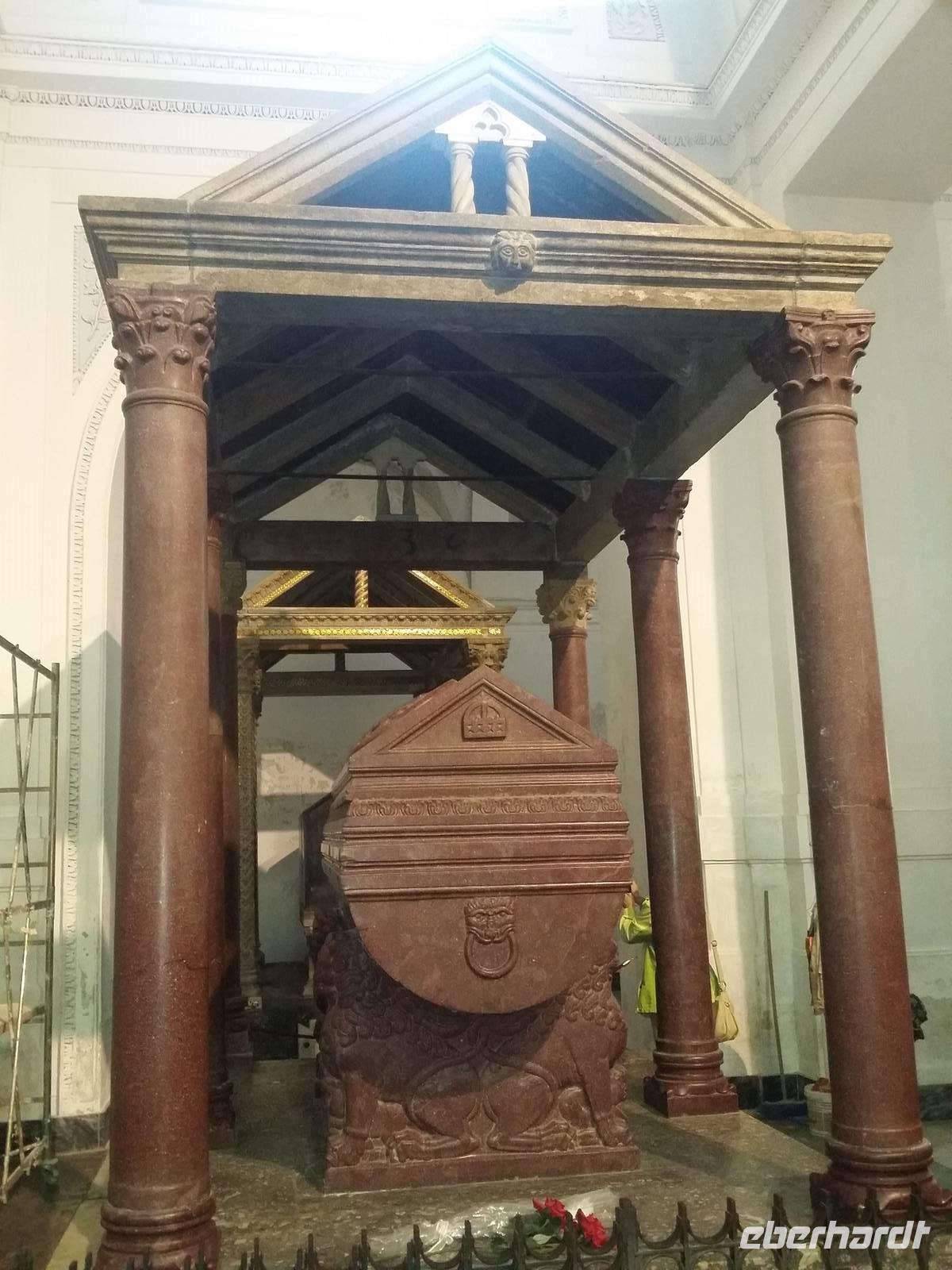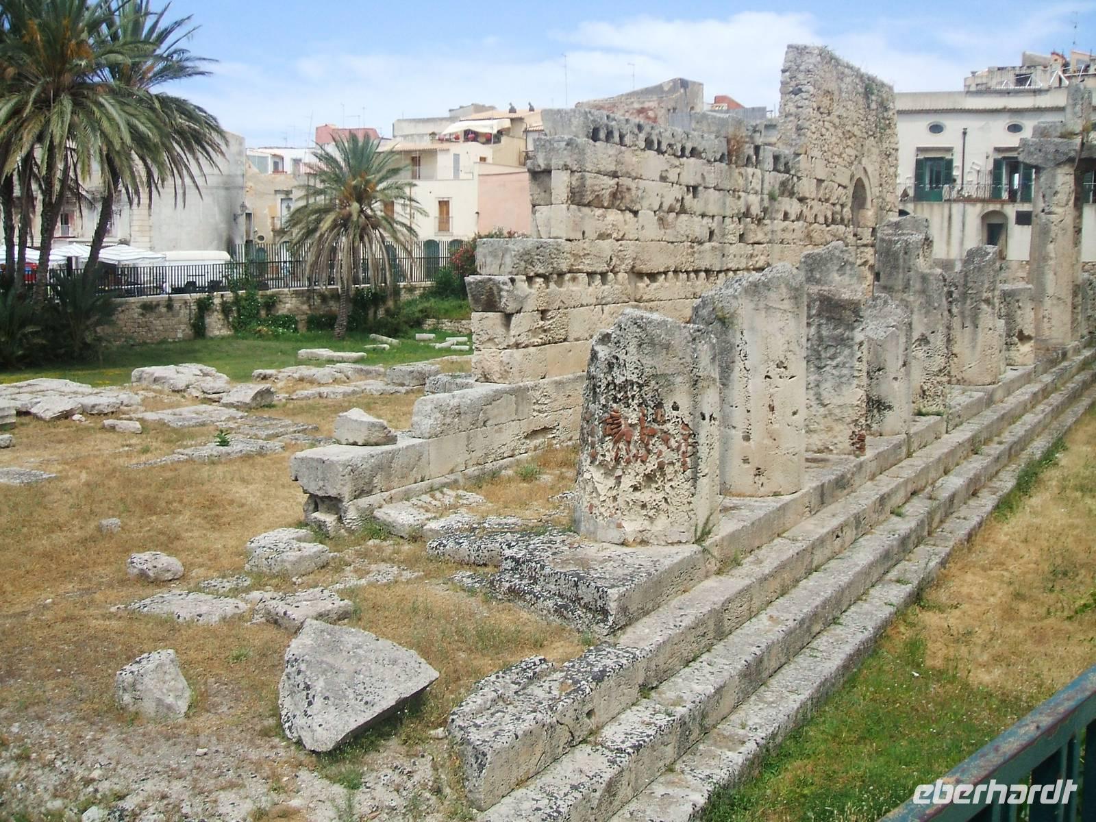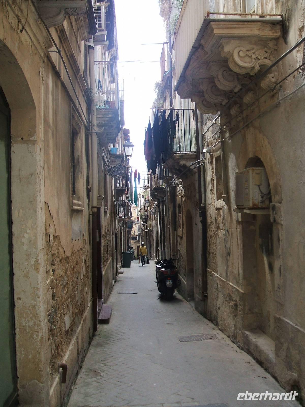 Die Verschwisterung mehrerer Jahrtausende bleibt Syrakus vorbehalten. Noch verlassen wir unseren Bus an einem hässlichen Parkplatz, wo nahebei ein Vollbart von Imbissbetreiber sein Nebengeld mit Toilettengängern bestreitet. Uns trennen jedoch nur wenige Schritte vom Hafen, den wir bald, zu Schiff gehend, seeseits betrachten: Jeder sieht die alte Bastion und eine Häuserstrecke. Wieder zu Lande versammelt, quert unser Marsch das Areal uralter, riesenwüchsiger Bäume. In der Stadt öffnet sich die Bebauung vor abgezäunten Ausgrabungen mit Datierungen aus der Alten Zeit. Dass sich der Genius der alten Heidenkulte mit dem christlichen Zeitalter verbindet, ist gleichwohl nirgends so fühlbar und augenfällig wie in dem Kathedralbau: Unsere Reiseleiterin postiert uns vor uralten Säulen, während sie, einige Statuen musternd, von Santa Lucia oder von Sant'Agata erzählt.