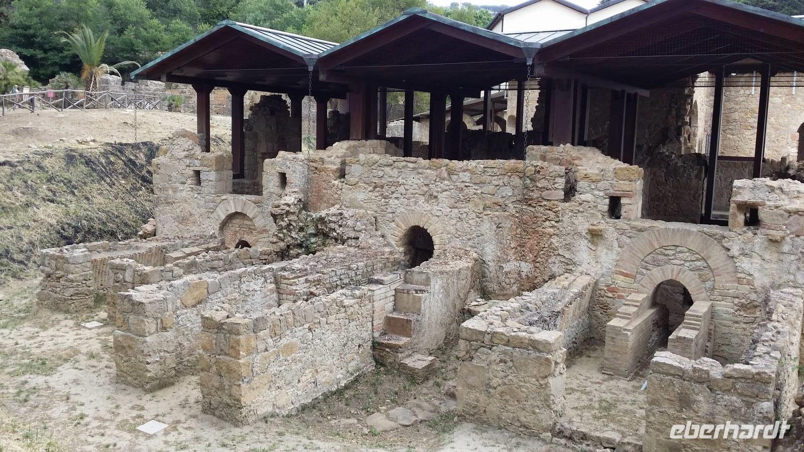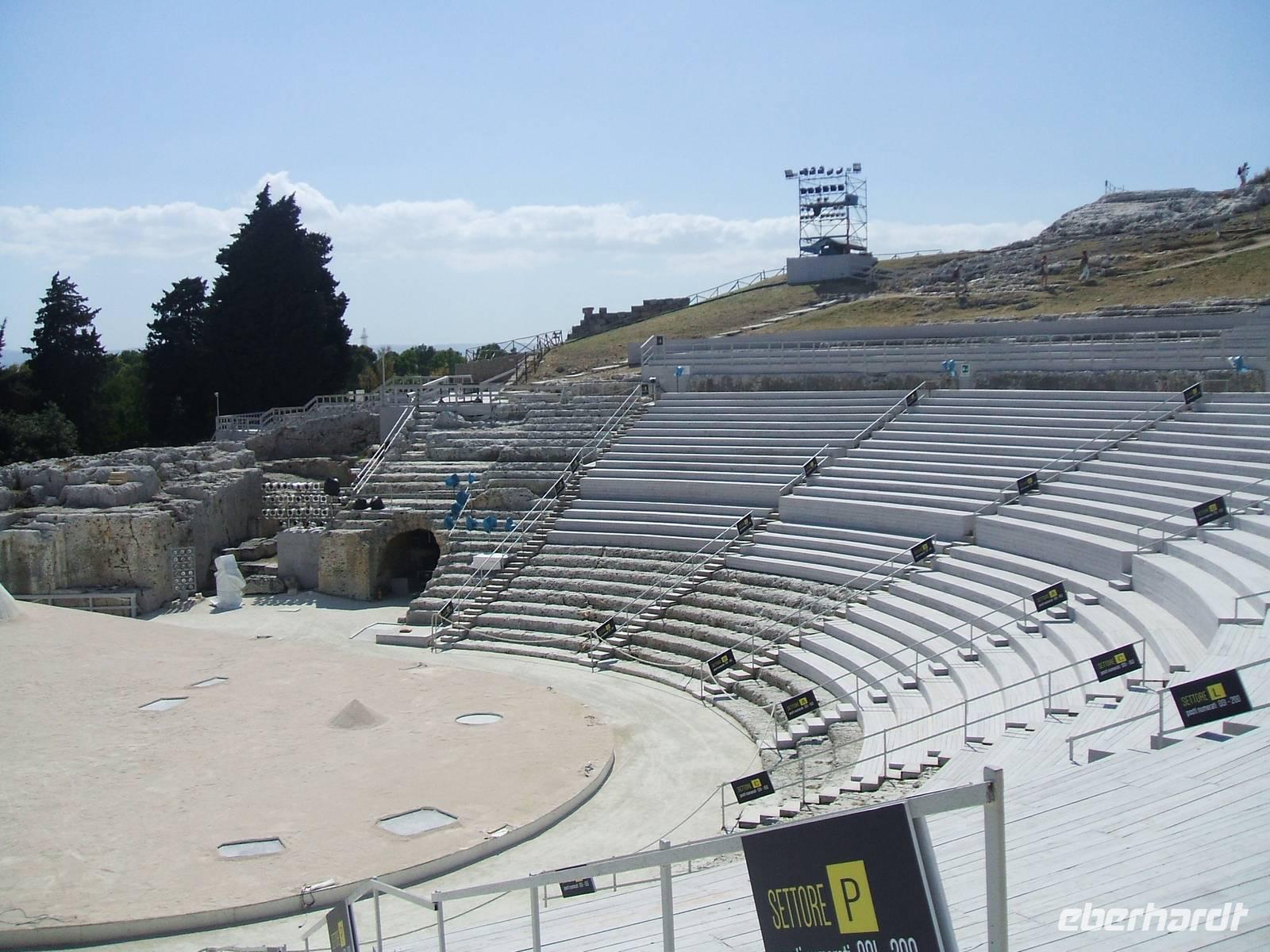 Mancher mag den Eindruck gehabt haben, die archäologische Zone außerhalb von Syrakus habe die Stadt überboten. So finden wir uns auf dem Gelände des Amphitheaters wieder und hören, das oberhalb der Anlage herangeführte Wasser habe in der Frühen Neuzeit, unter den Spaniern, einigen Mühlen gedient. Unsere Zeit hat diesen arglosen Umgang mit den Bauschätzen verloren. Dennoch datiert nicht weit zurück, dass die Sizilianer ihrerseits einigen Raub an Fundstücken praktiziert und sogar von der touristischen Erschließung abgesehen haben. Bald führen wir unseren Schritt über Stiegen und Wege zurück zum Tor und zu dem Busparkplatz, wo die hölzernen Souvenirläden ihr Quadrat bilden.