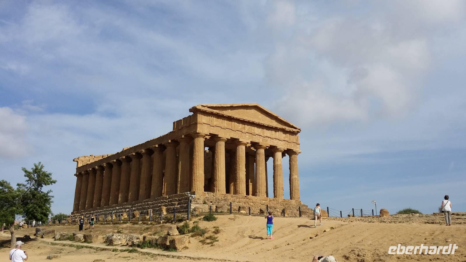 Einem unserer Herren, einem großgewachsenem Mann mit vollem weißgrauem Haar, lesen wir heute Freude vom Gesicht ab: Die Entscheidung für die Sizilienreise war richtig. Und strotzt auch in Sichtweite des Ruinenfeldes von Agragas die Hässlichkeit von Agrigento, so nimmt uns dennoch niemand die Gelegenheit zu unserem Gruppenfoto in diesem Tal der Tempel. Ausgewählt ist die Kulisse eines alten Baumes. Das sandige, hellgrasfarben übergrünte Areal bietet uns weiterhin auf Pfeilschussweite den Juno-Tempel, den Concordia-Tempel, Herkules usw. Mögen Archäologen vorsichtig bloße Nummern verteilen, falls sie nicht hinreichende Gewissheit haben.