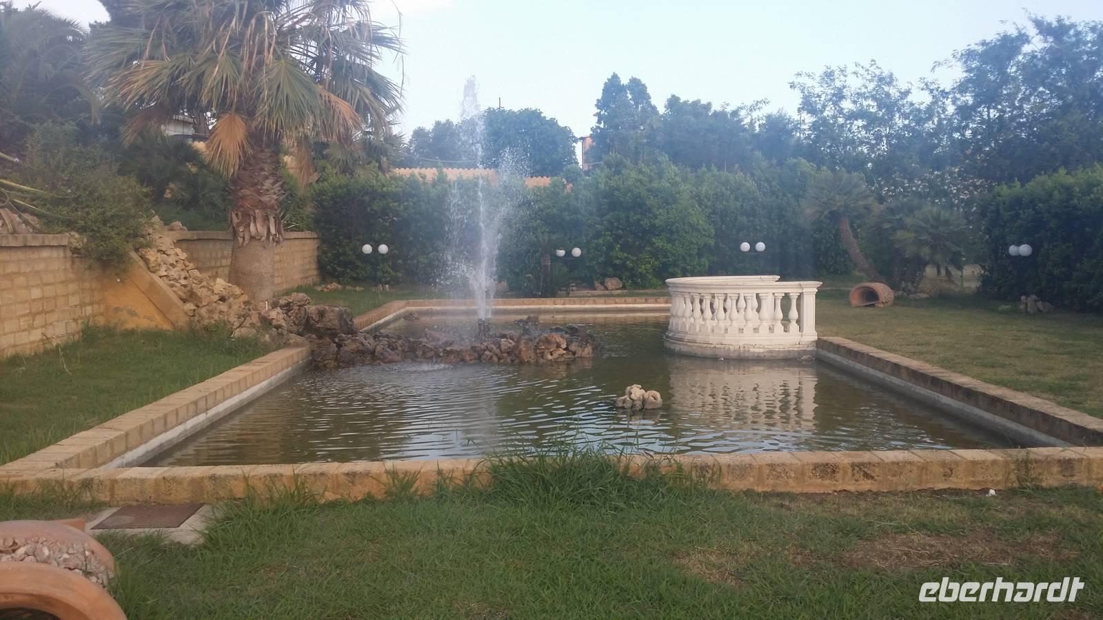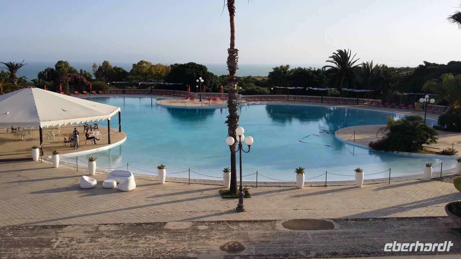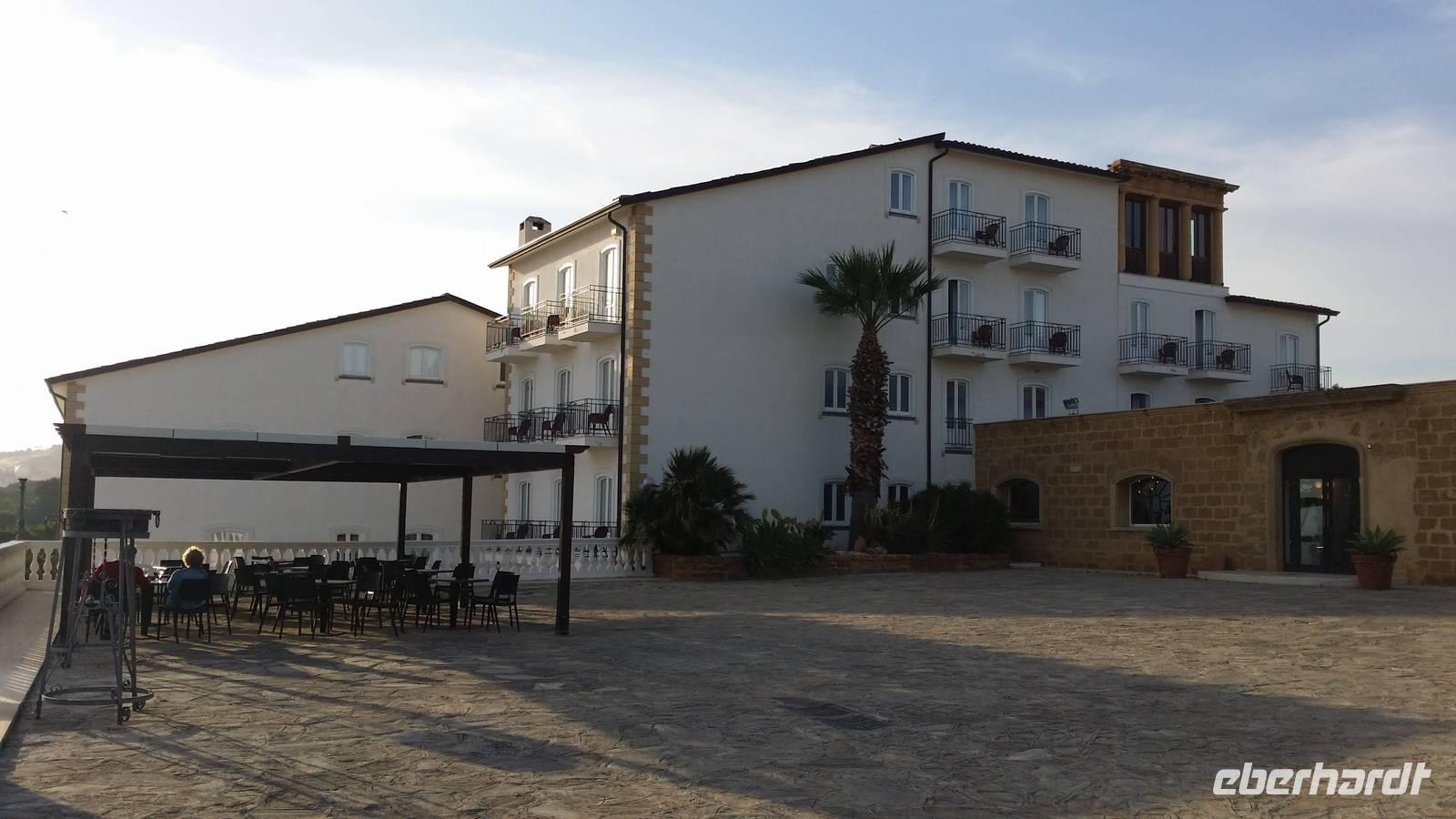 Gegen Abend treffen wir vor dem Blu Hotel Kaos in Agrigento ein. Es öffnet seinen Vorplatz am Ende einer Seitenstraße, blickt selbst über seine Pool- und Gartenanlage hinweg auf das Meer aus. Rechterhand hinter dem Haupteingang arrangieren sich weiche Sitzplätze und eine Bar.