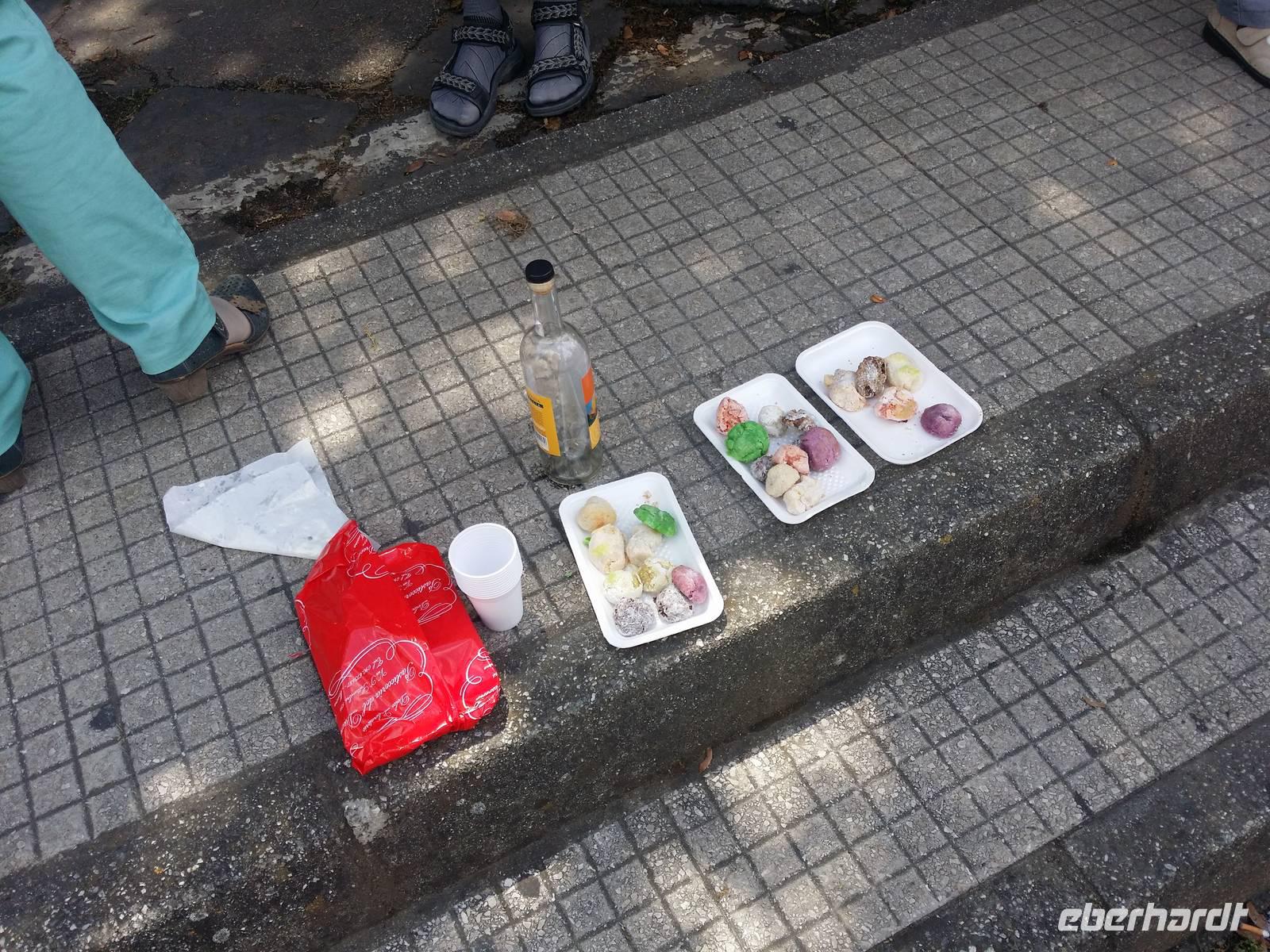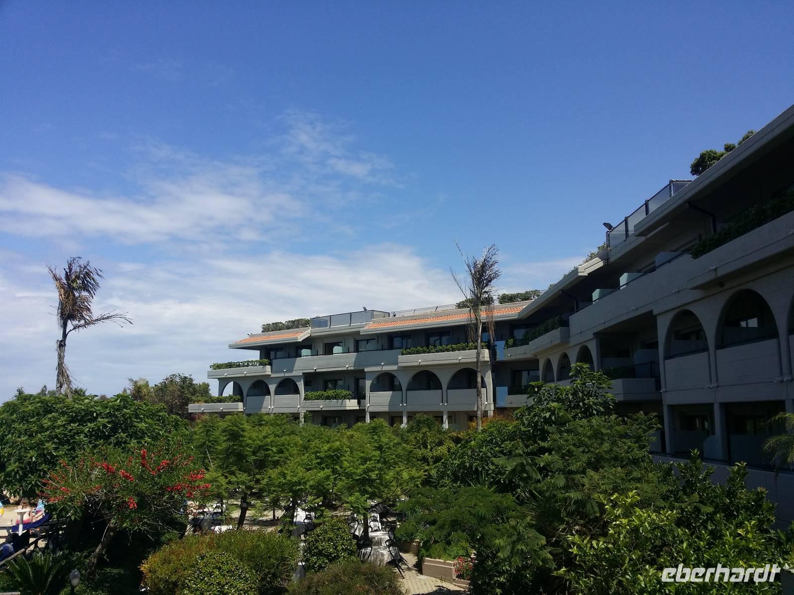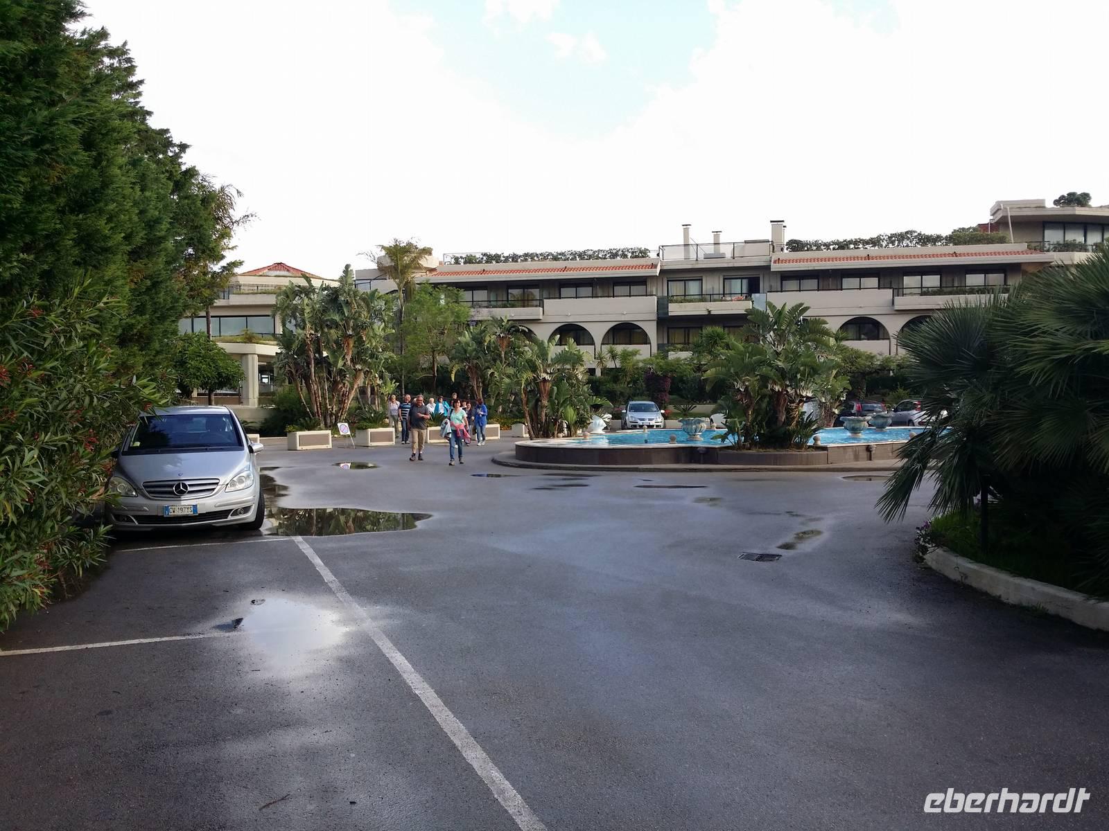 Am Vorabend dieses 26. Mai haben wir das Fiesta Hotel Athenee Palace in Campofelice di Roccella belegt. Entgeisterte Augen haben die nicht enden wollende Zeile des Abendbuffets abgesucht. Am Morgen sitzt man an den Außentischen, hat man sich erst an Kaffee und Brötchen bedient.